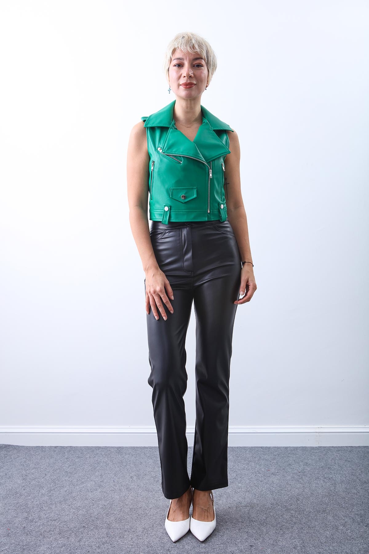Apolet Detaylı Fermuarlı Deri Yelek