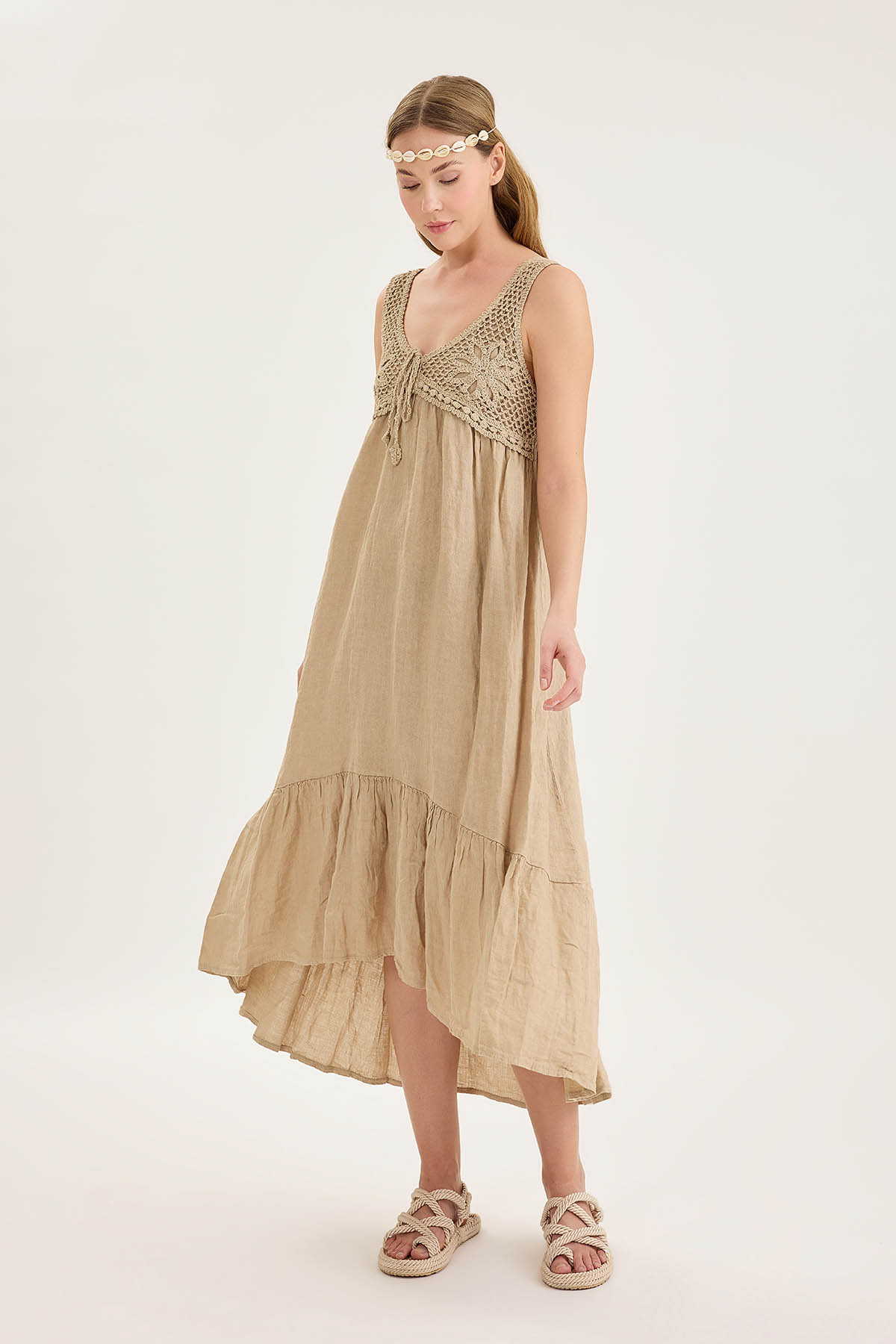 Arkası Lastikli Önü Dantelli Fırfırlı Keten Elbise