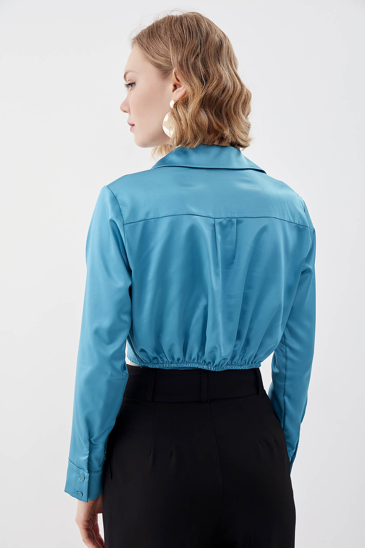 Bel Kısmı Detaylı Crop Saten Bluz