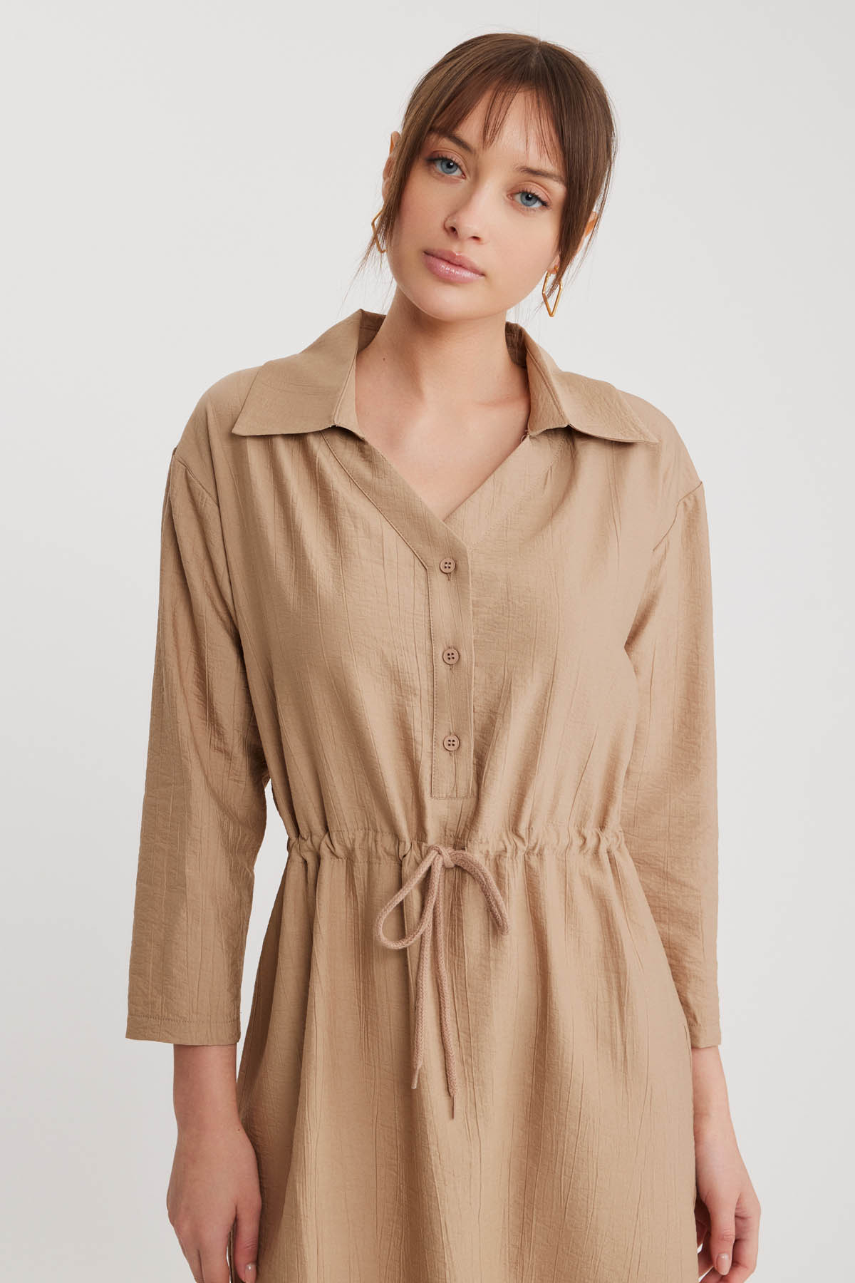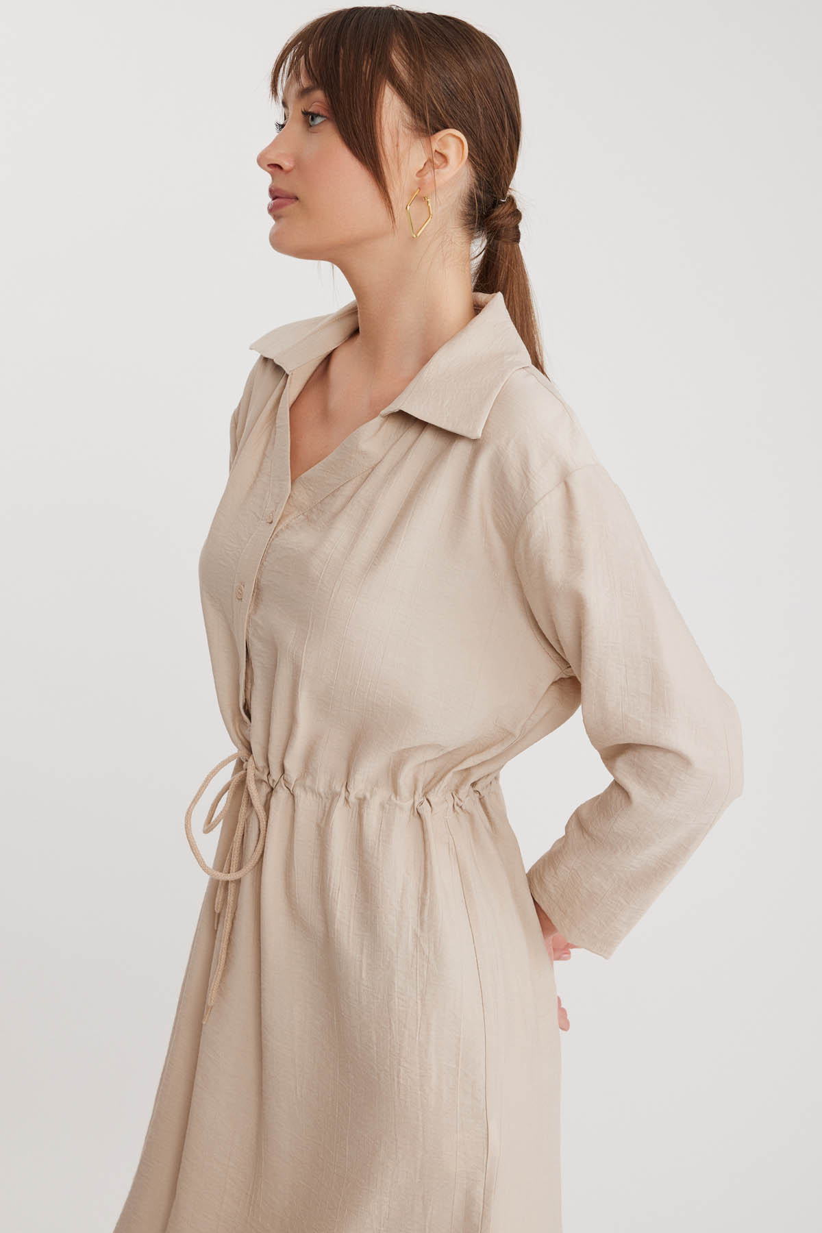 Belden Büzgülü Krinkıl Kumaş Düğmeli Elbise