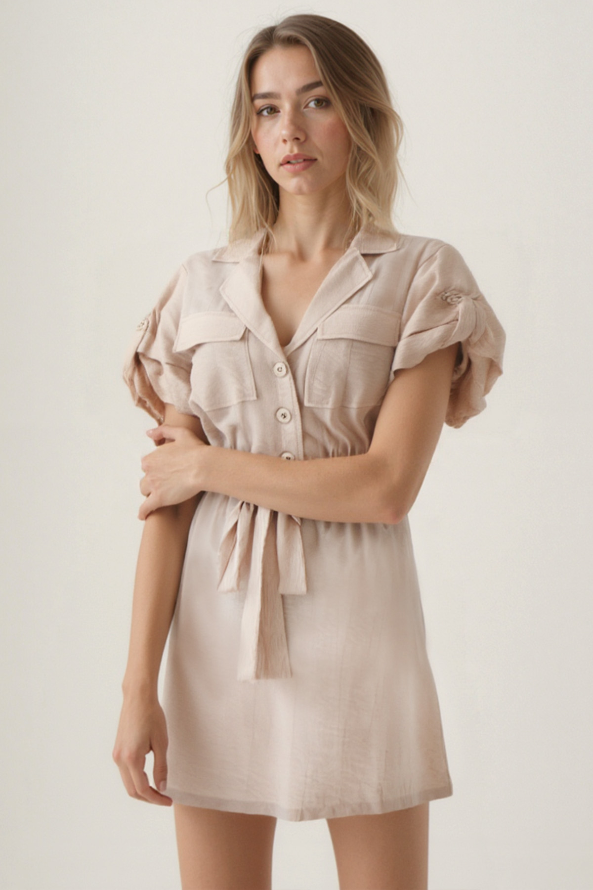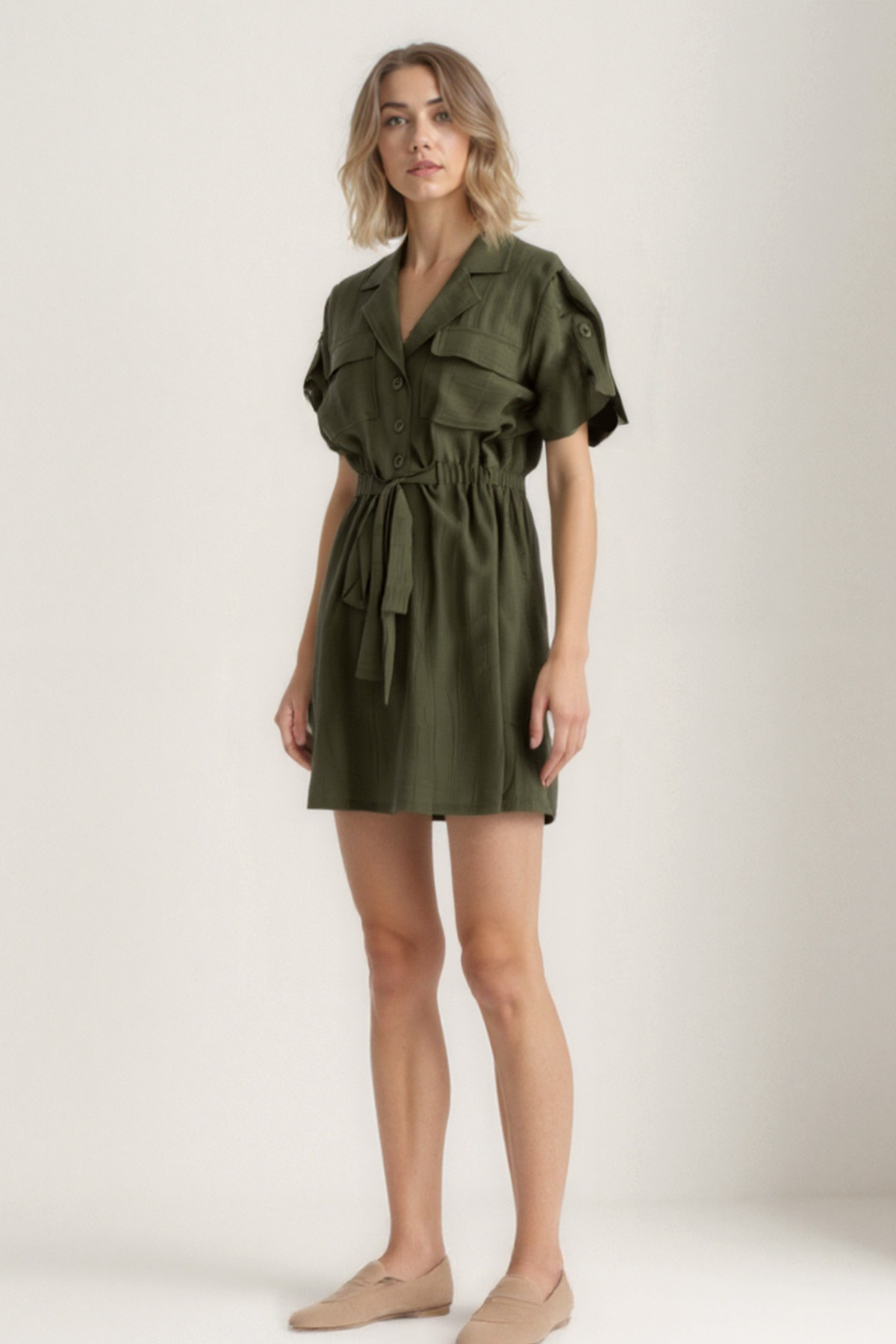 Beli Bağlamalı Kapak Cepli Kısa Kol Krinkıl Kumaş Elbise