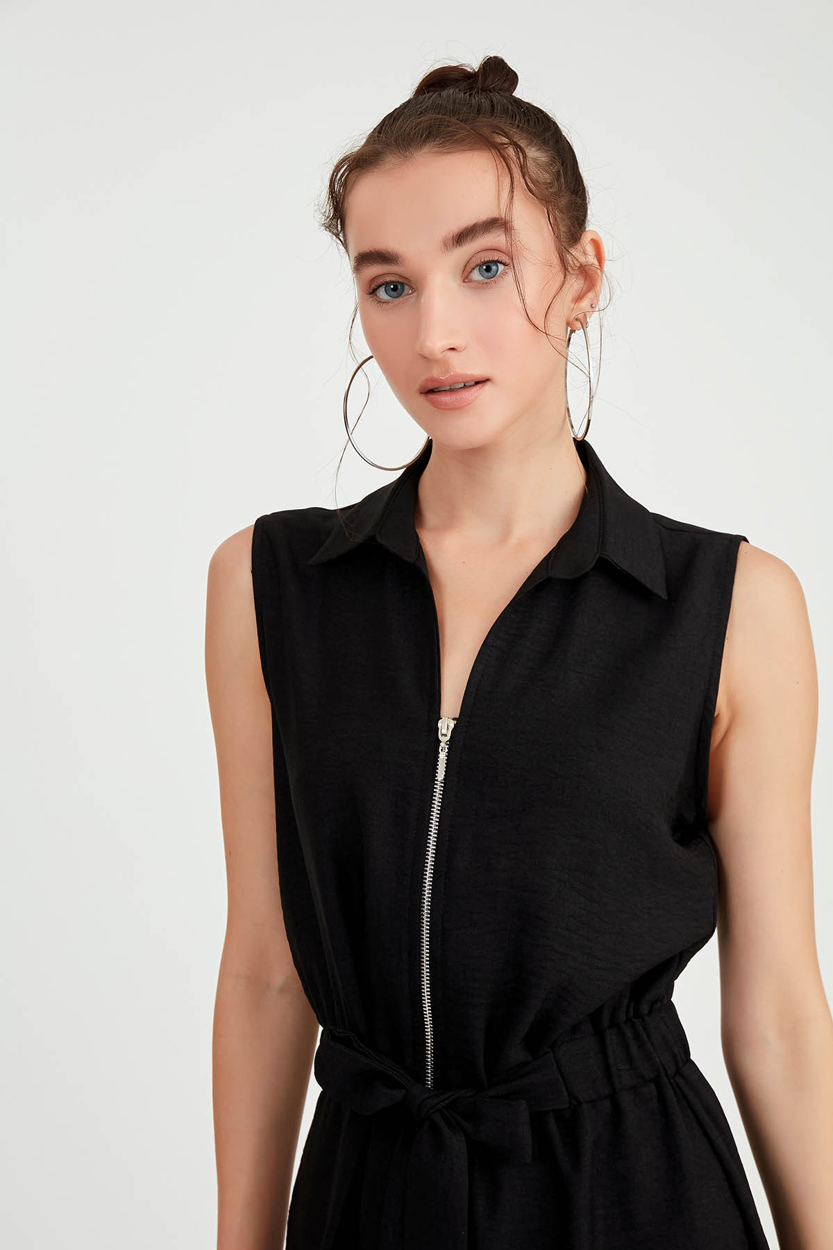 Beli Bağlamalı Önü Fermuarlı Kolsuz Elbise