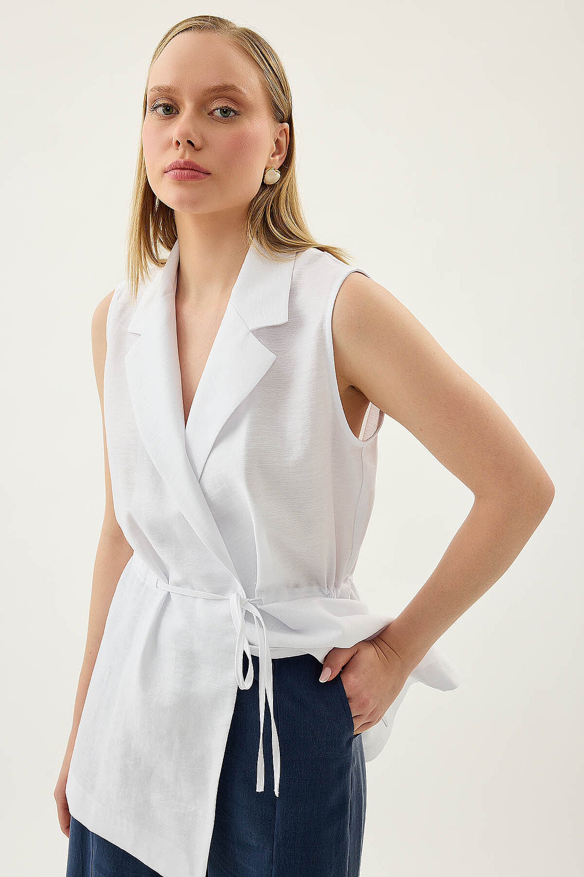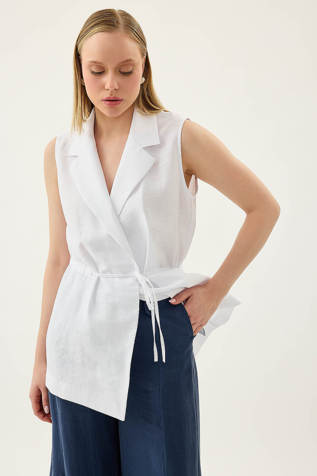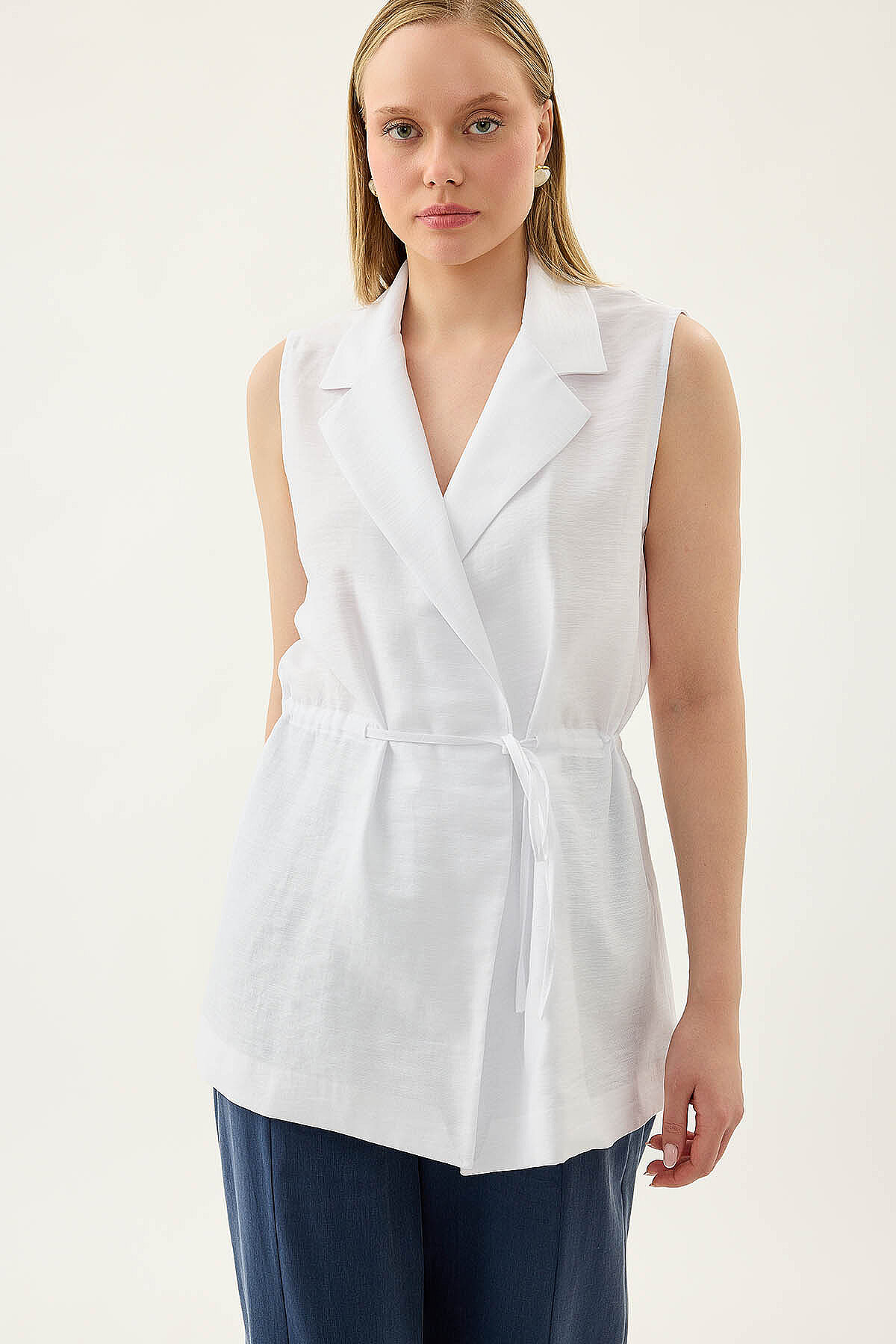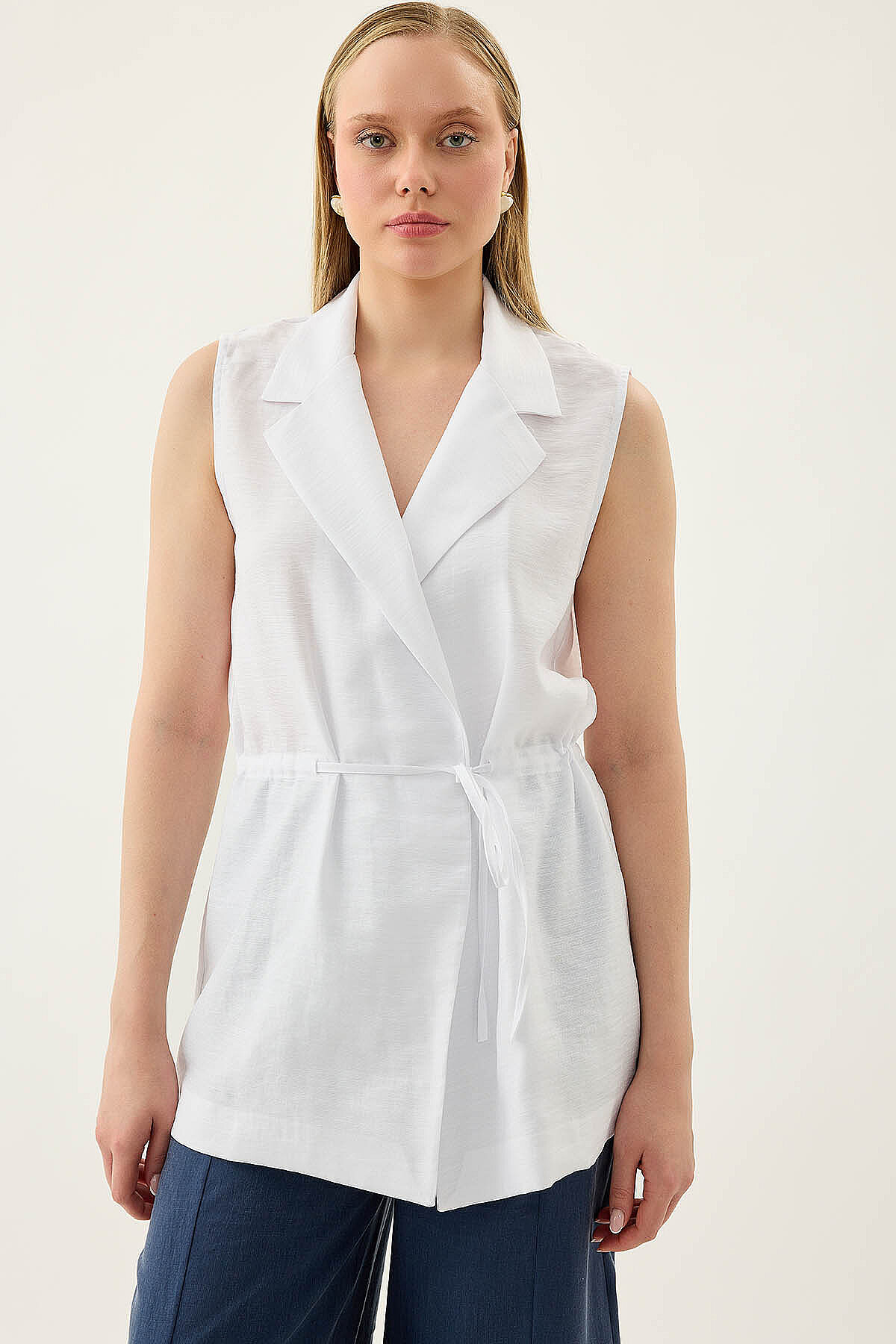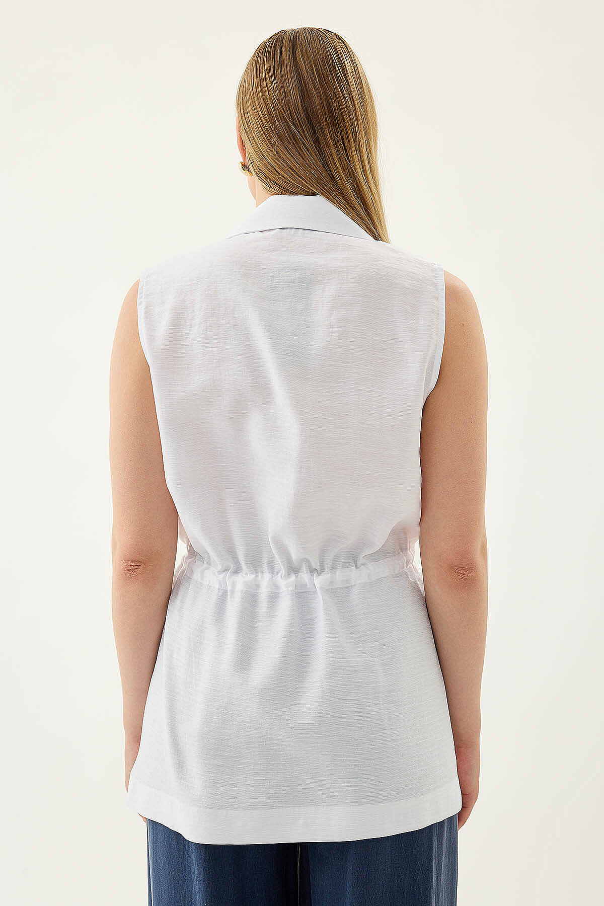Beli Büzgü Kapamalı Yelek Beyaz
