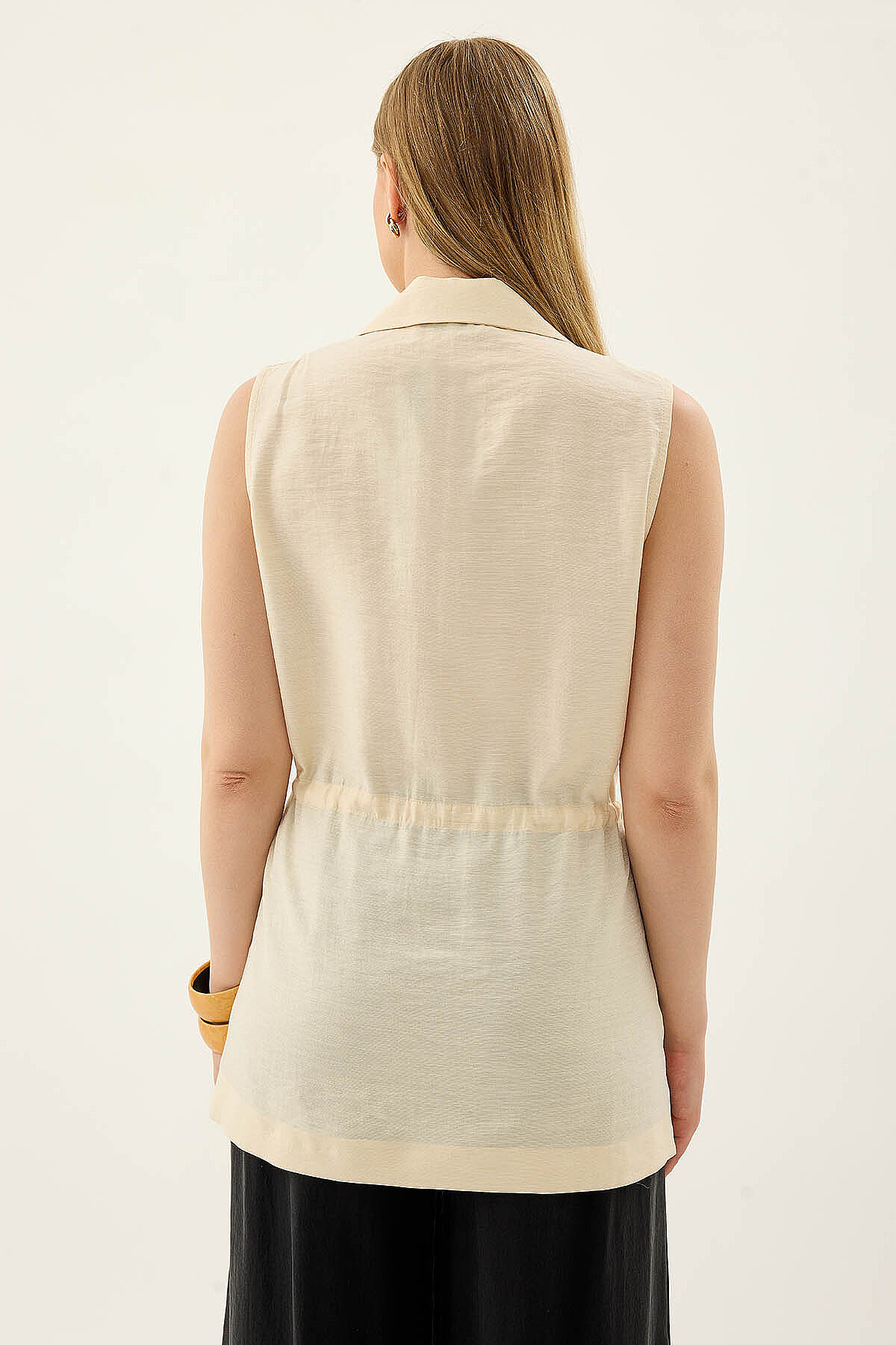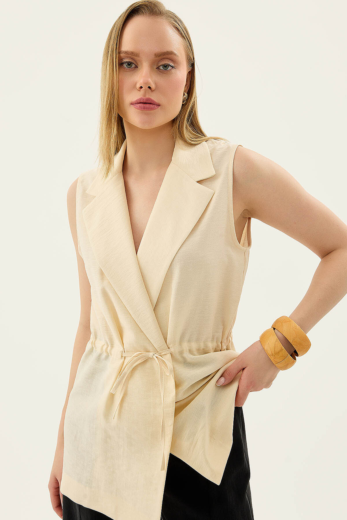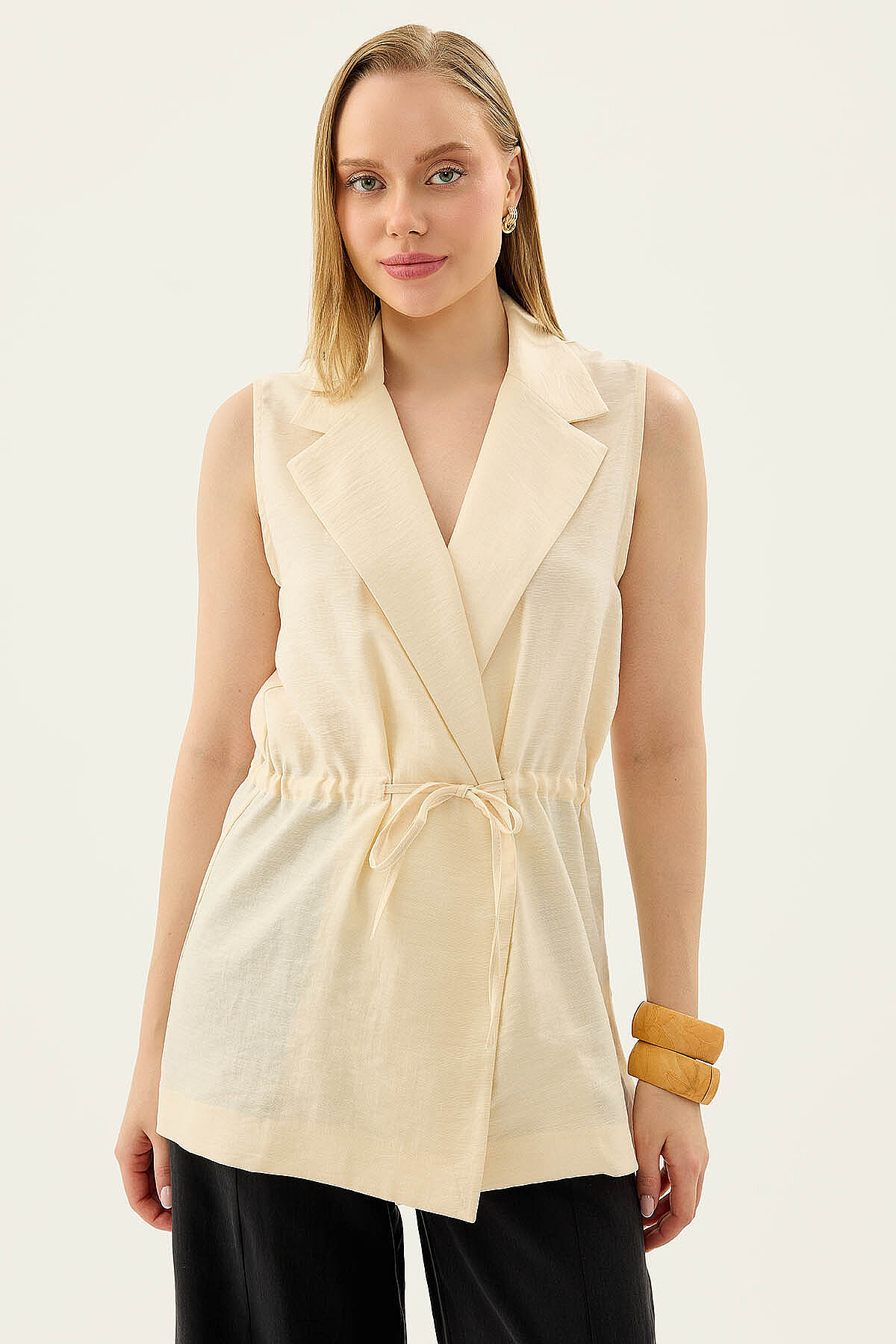 Beli Büzgü Kapamalı Yelek Krem