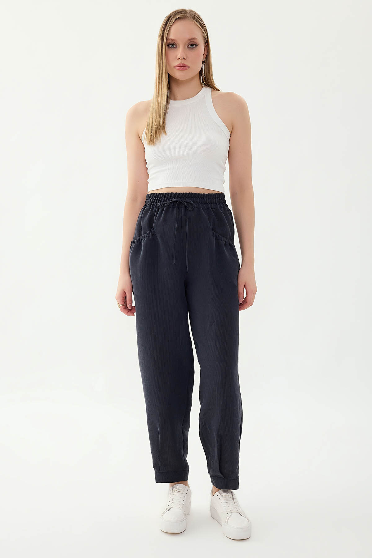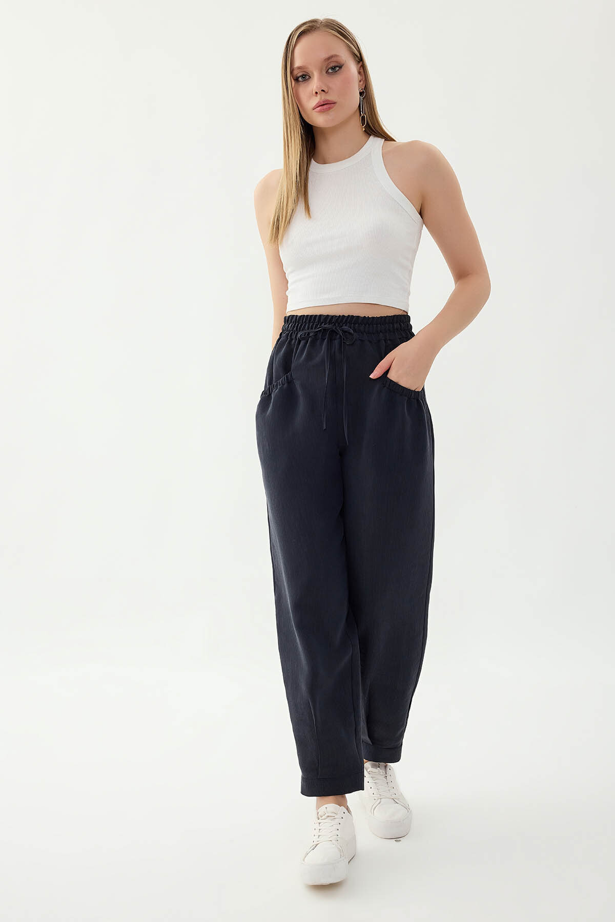 Beli Lastikli Cep Detaylı Çizgili Pantolon Lacivert