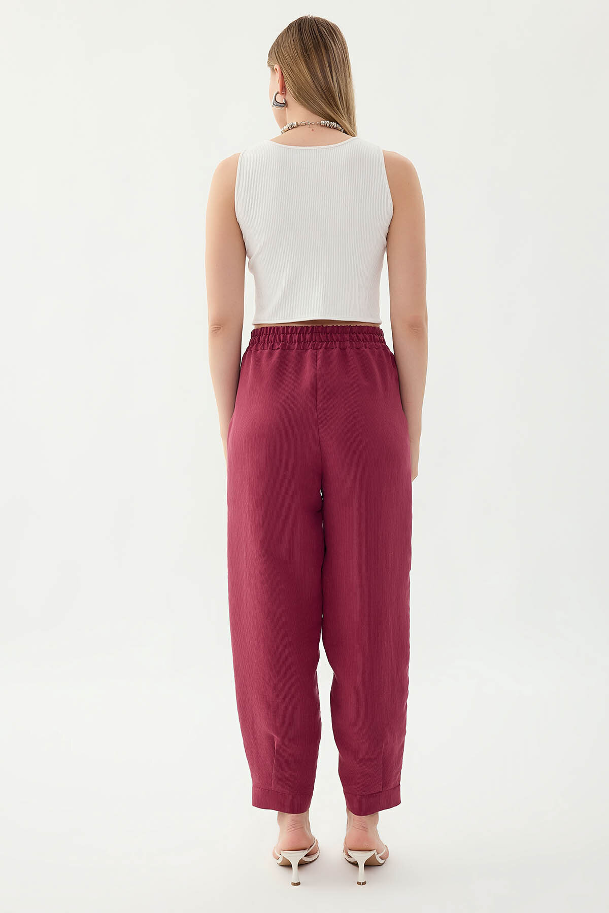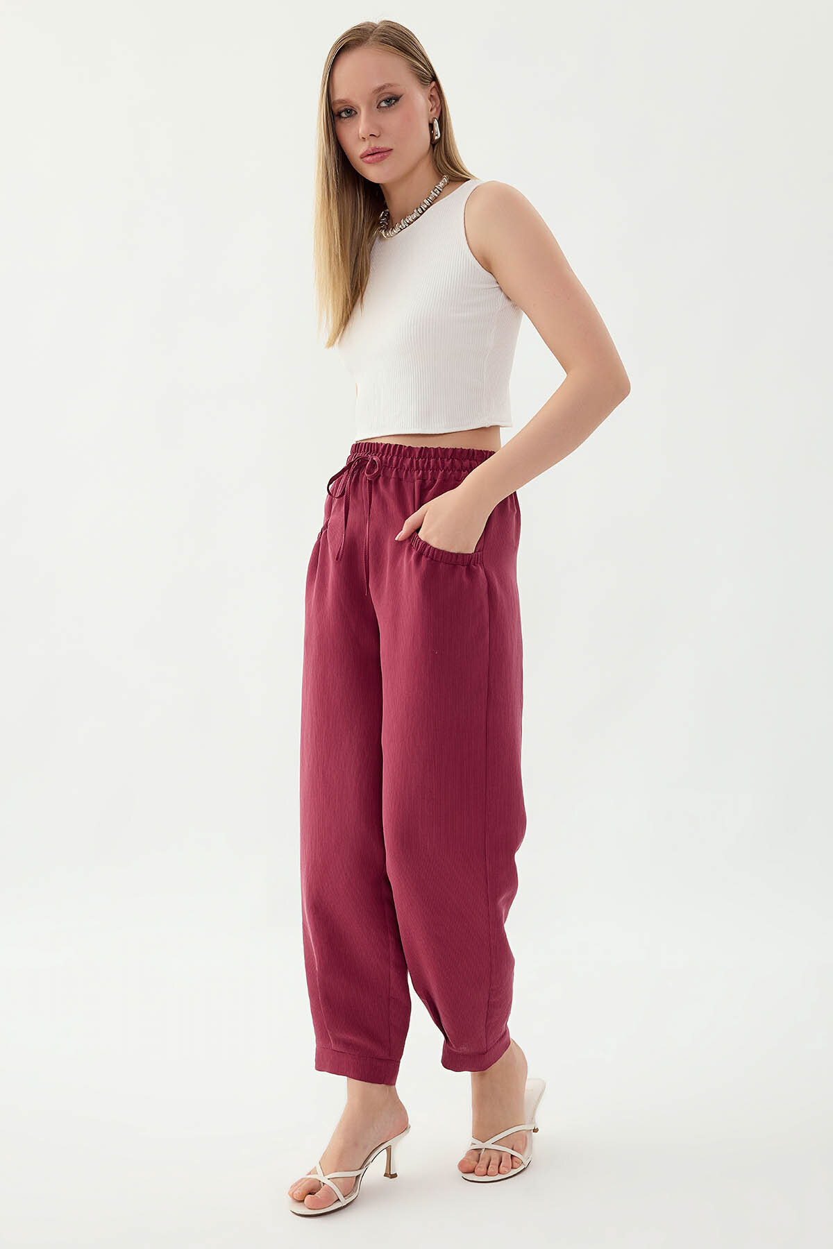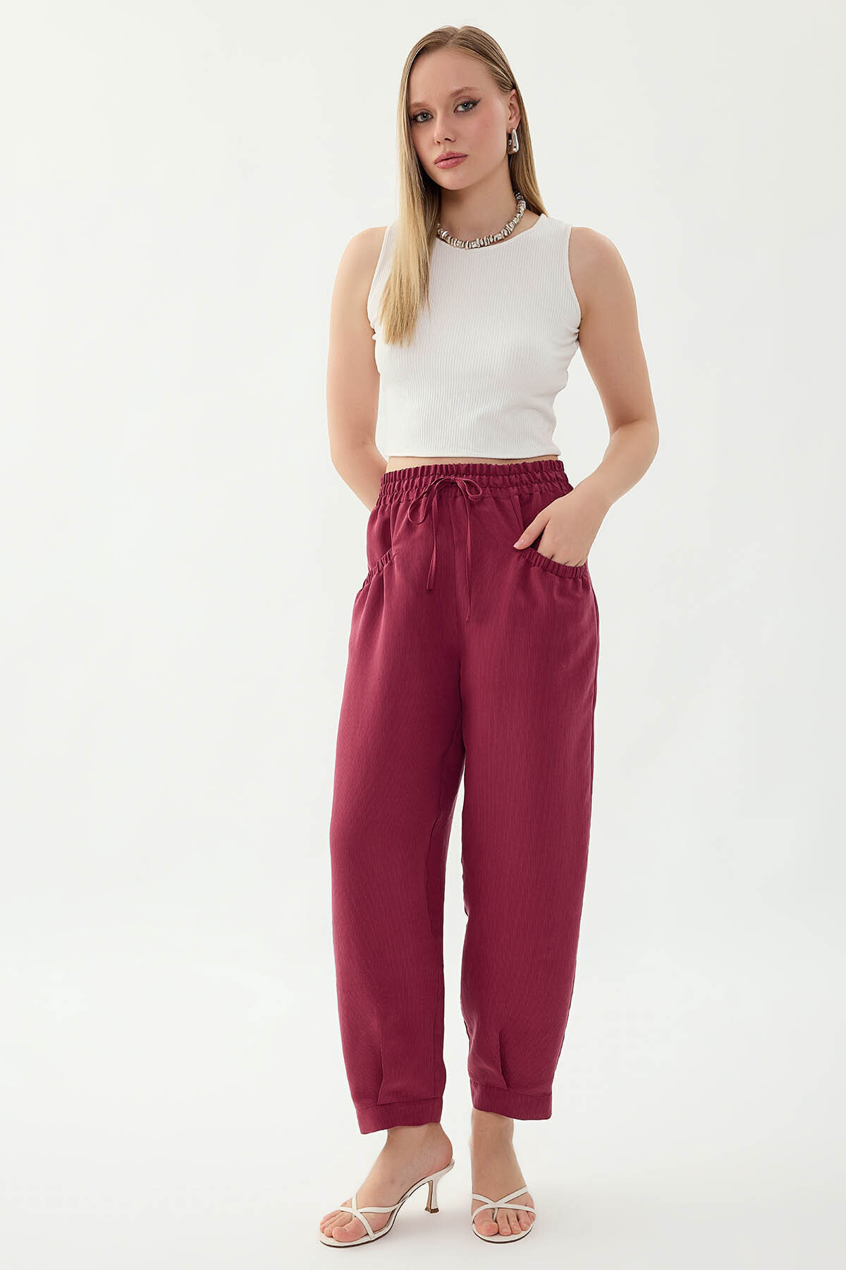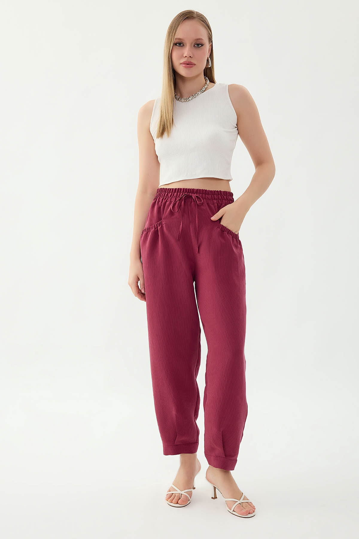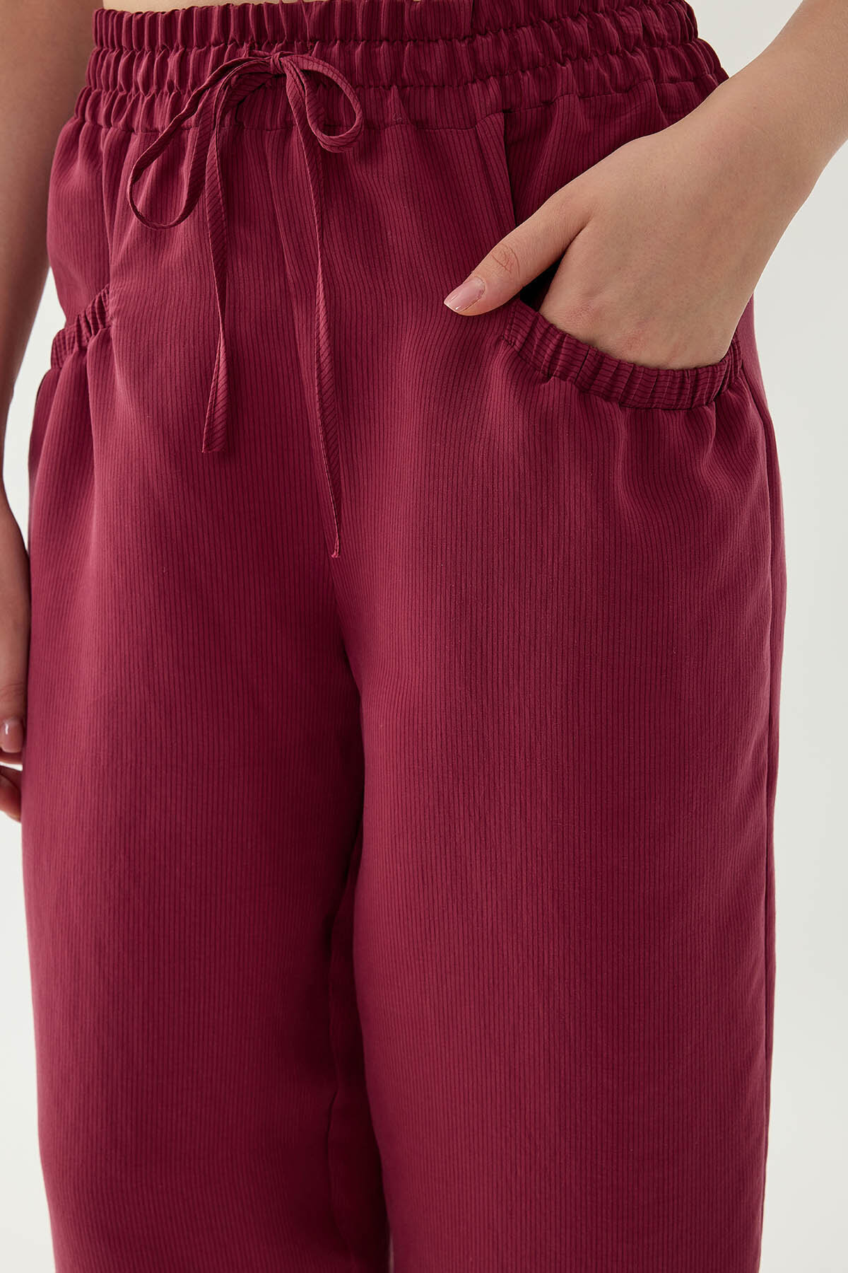 Beli Lastikli Cep Detaylı Çizgili Pantolon Şarap