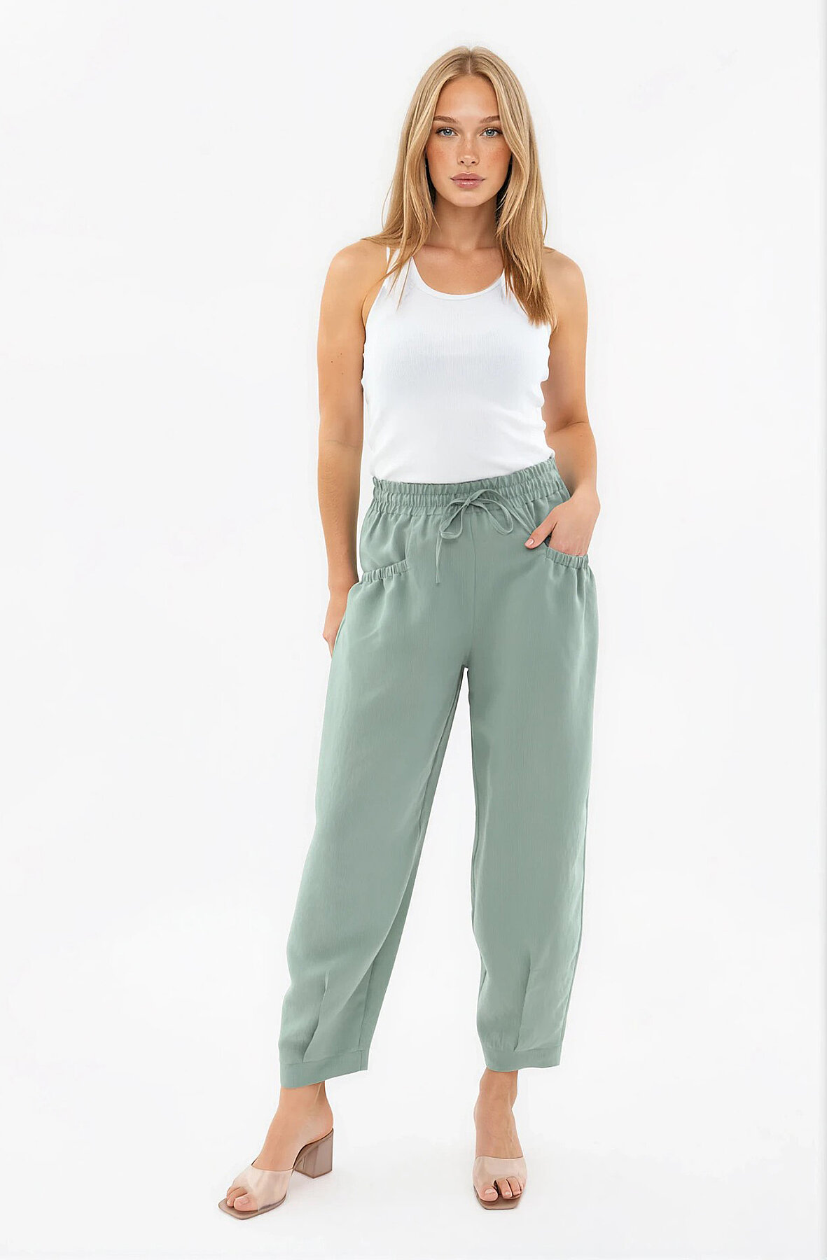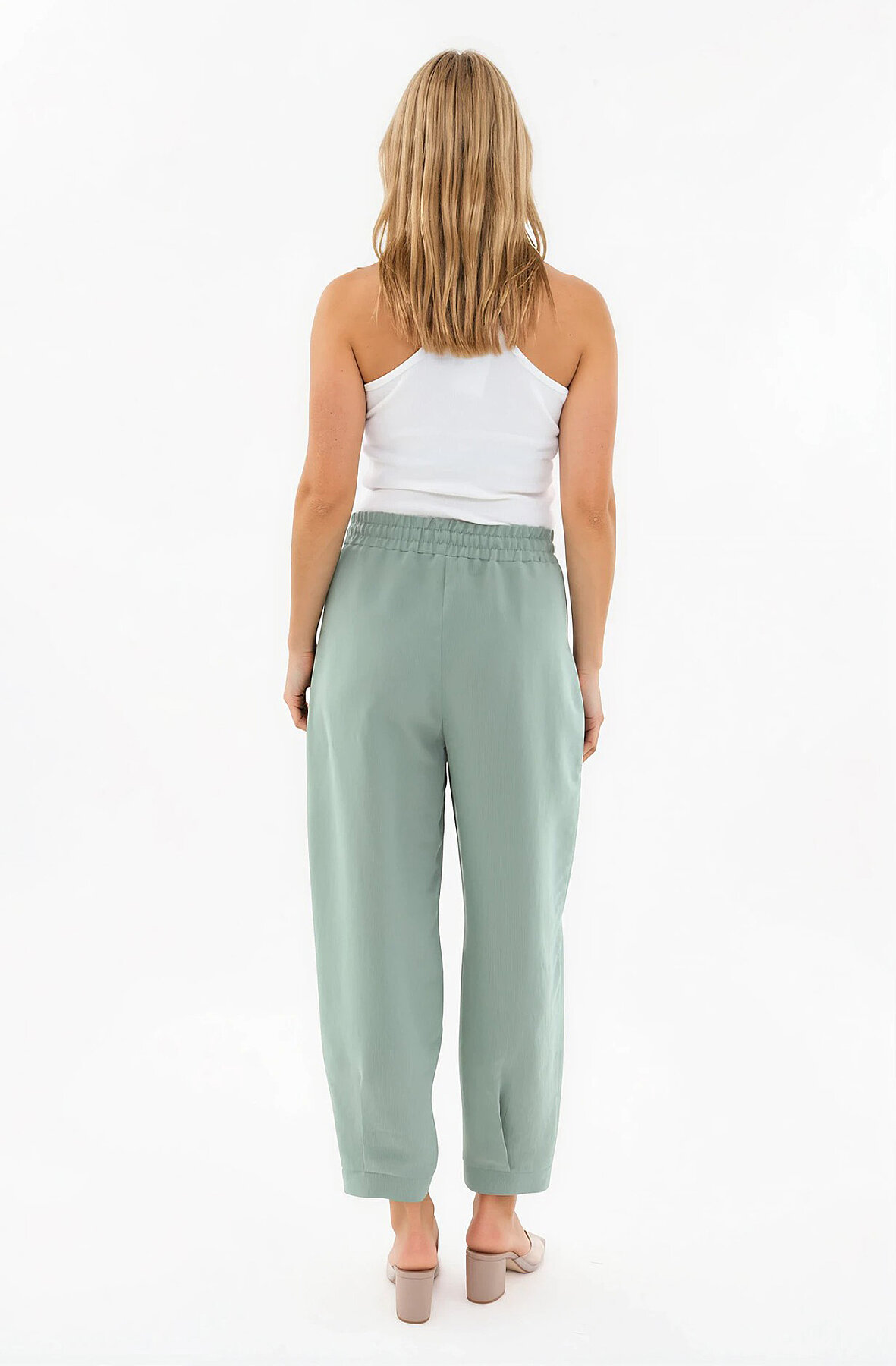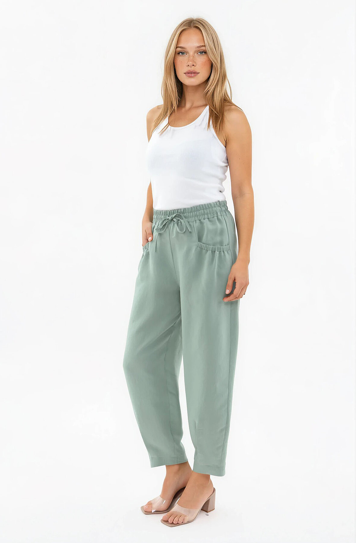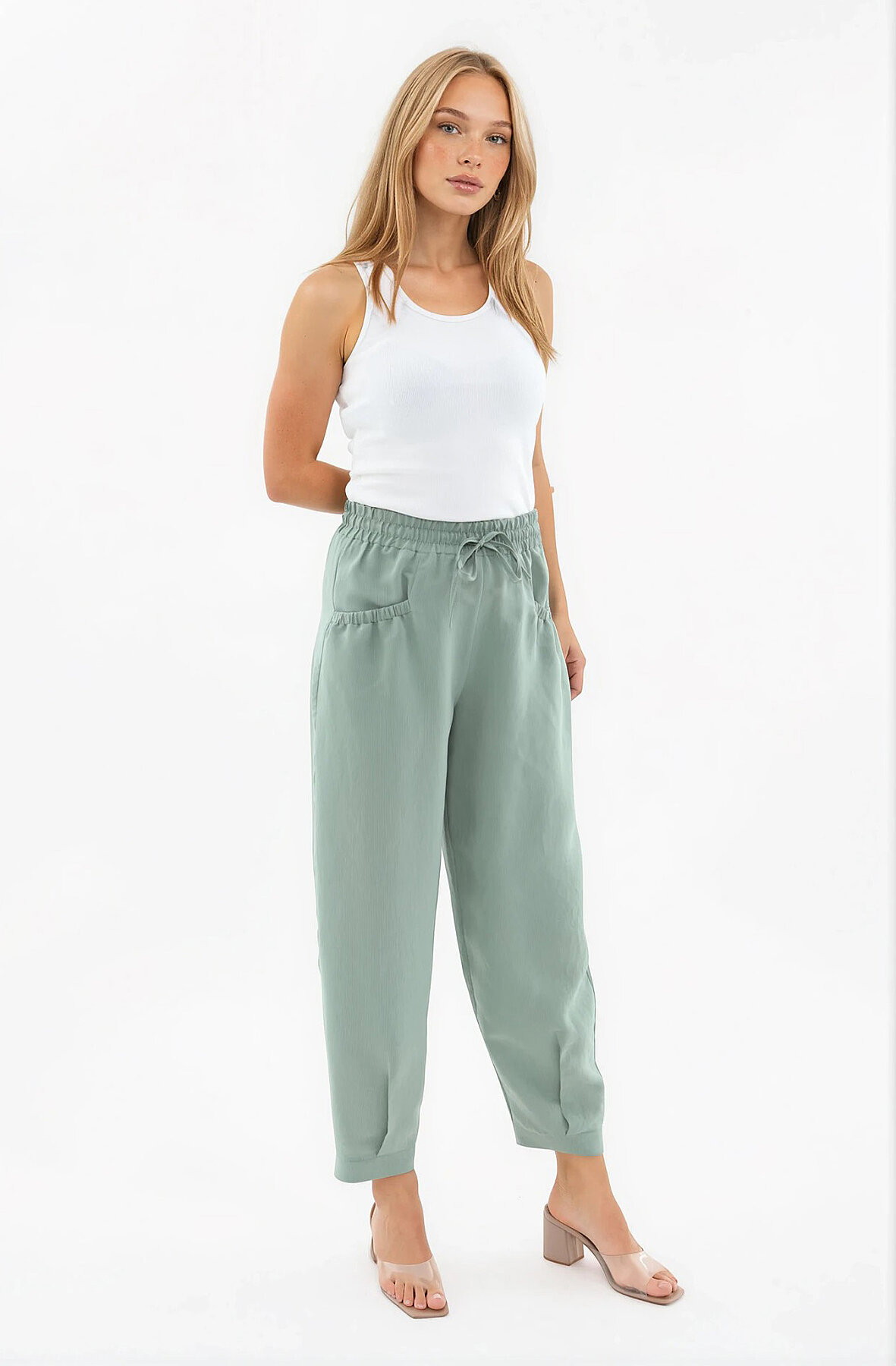 Beli Lastikli Cep Detaylı Çizgili Pantolon Yeşil