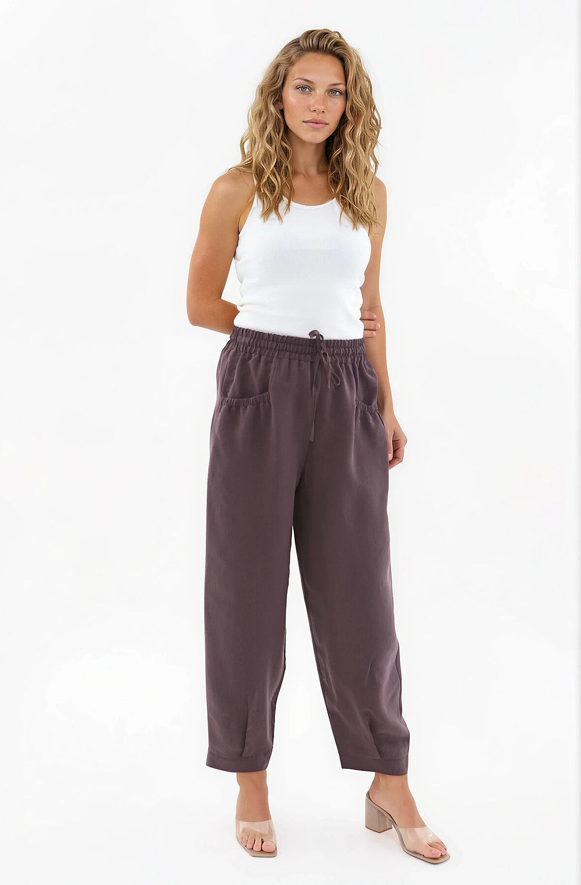 Beli Lastikli Cep Detaylı Çizgili Pantolon Kahve