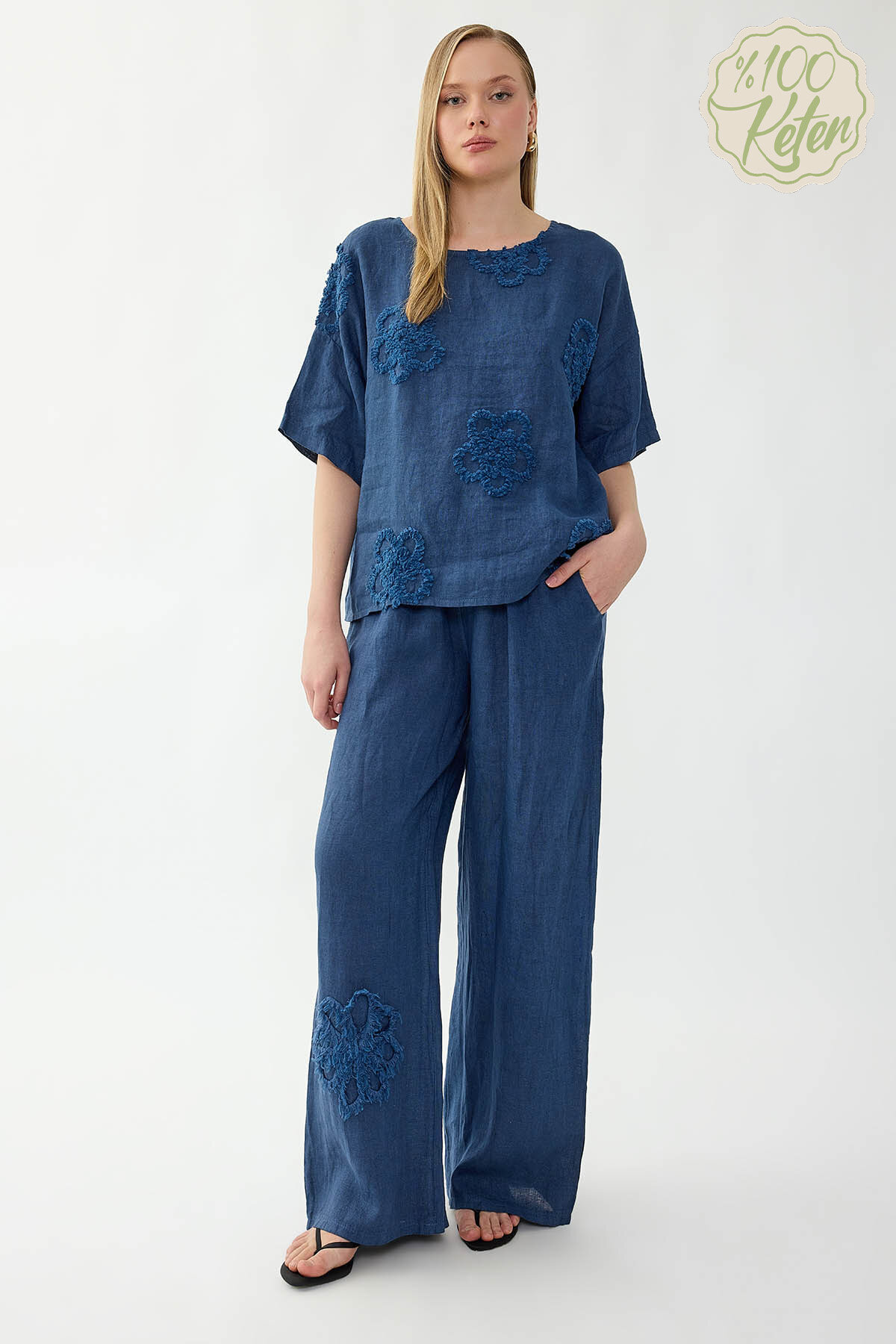 %100 Keten Beli Lastikli Çiçek Motifli Cepli Pantolon Lacivert