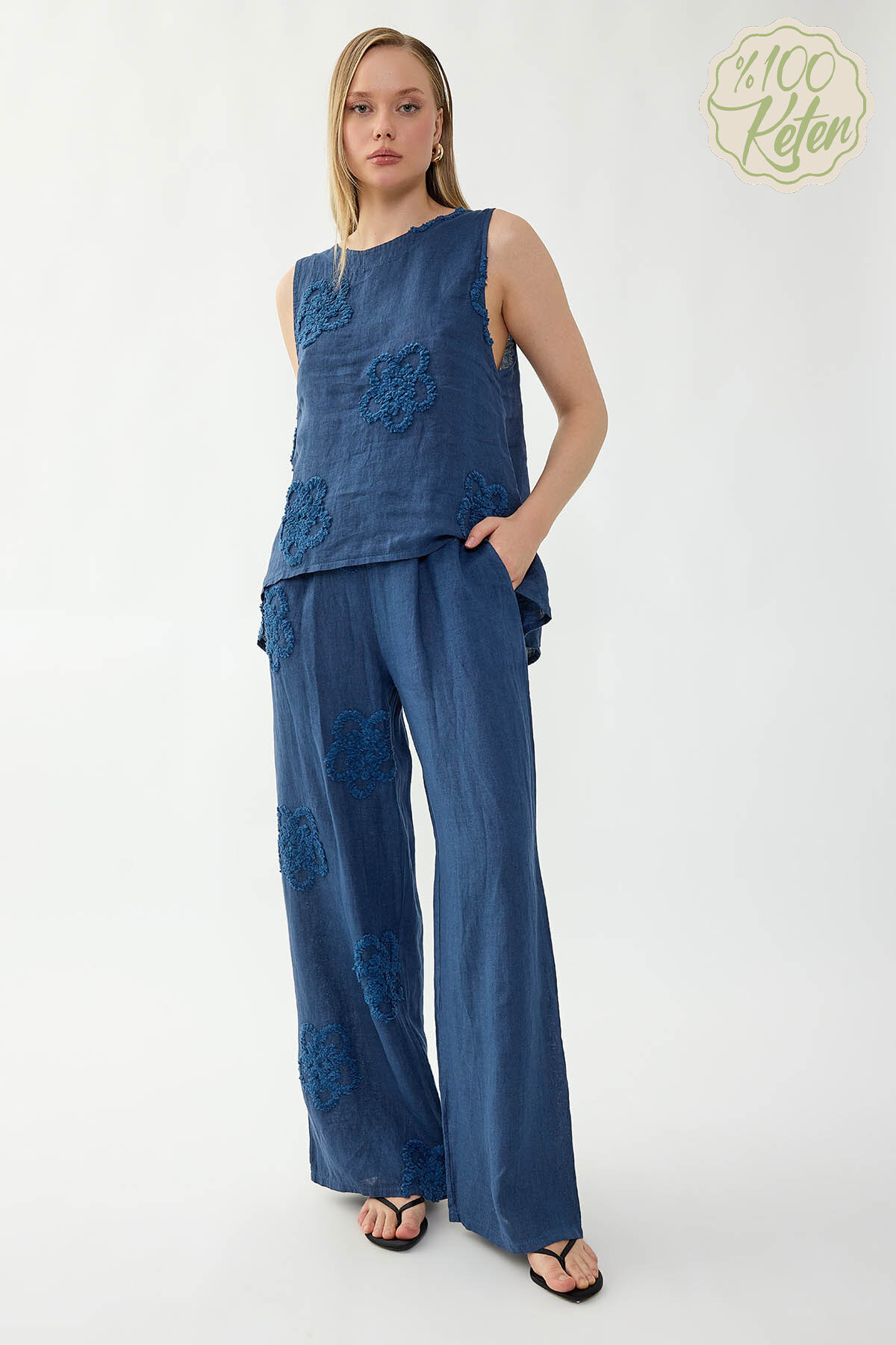 %100 Keten Beli Lastikli Çiçek Motifli Pantolon Lacivert
