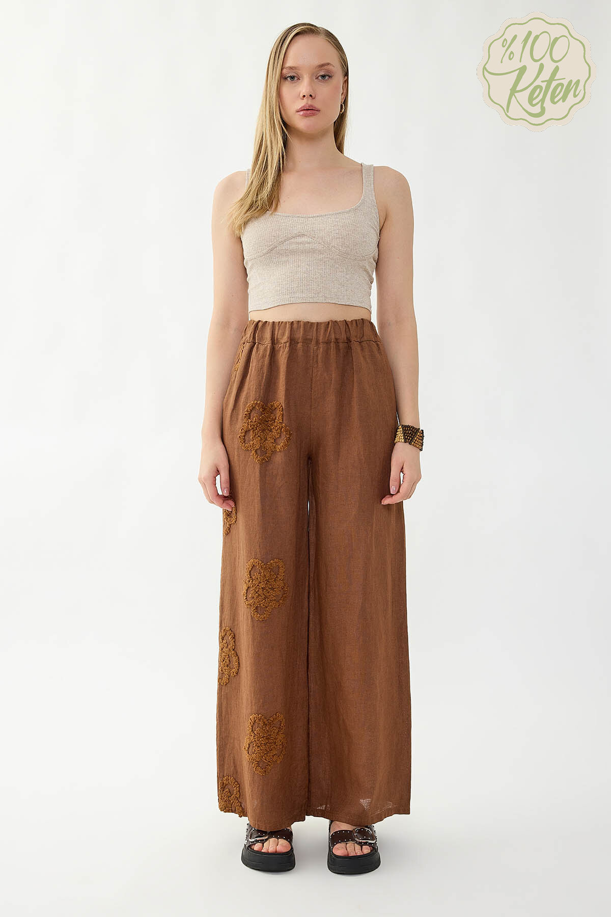 %100 Keten Beli Lastikli Çiçek Motifli Pantolon Taba