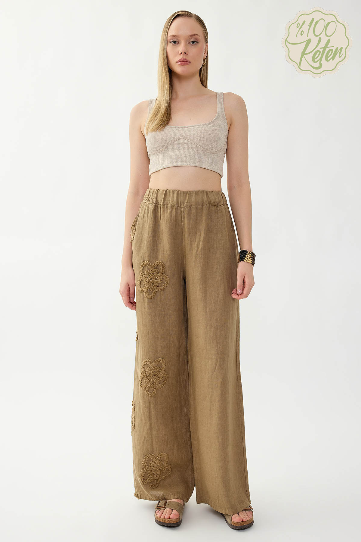 %100 Keten Beli Lastikli Çiçek Motifli Pantolon Bej