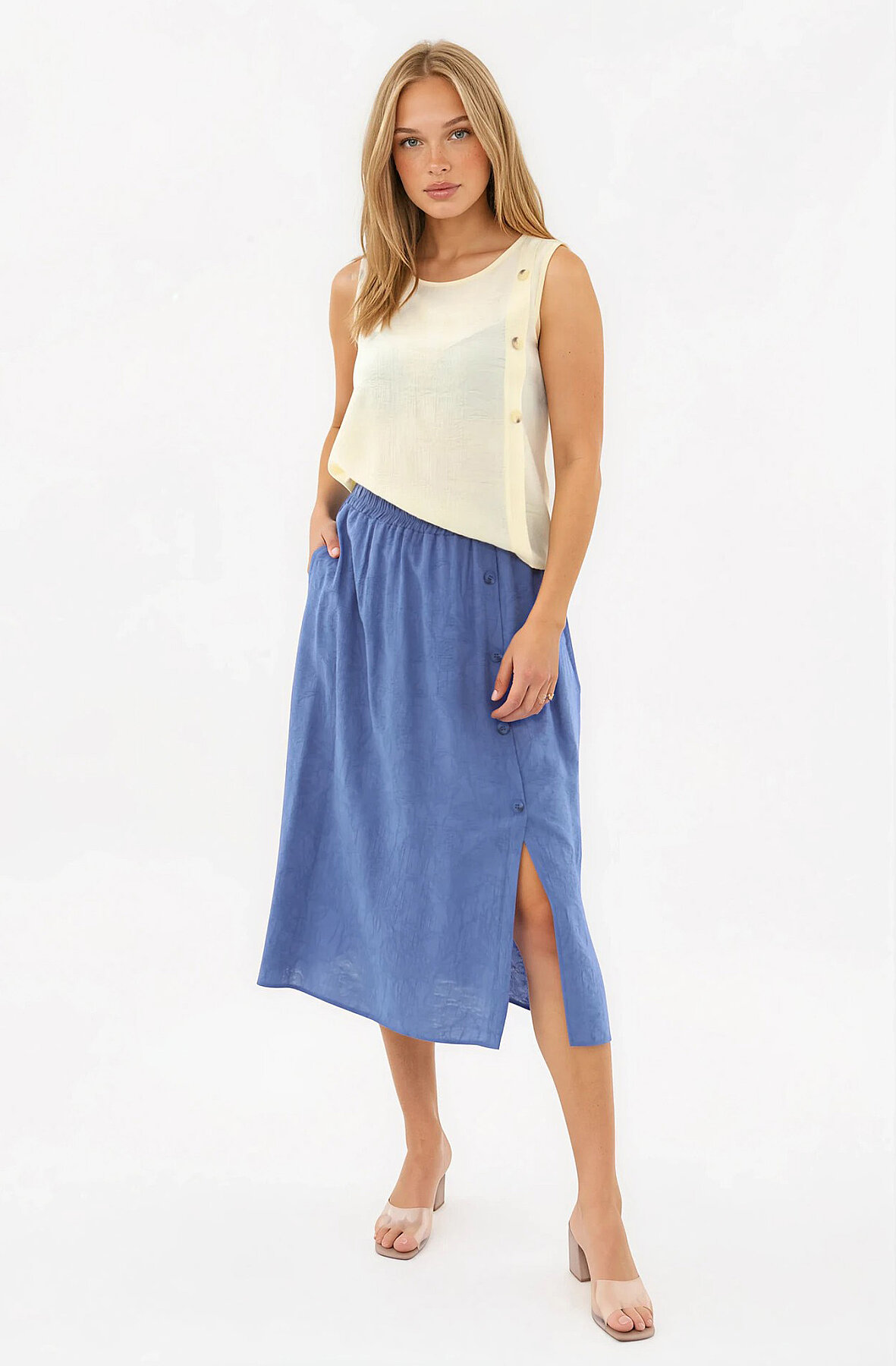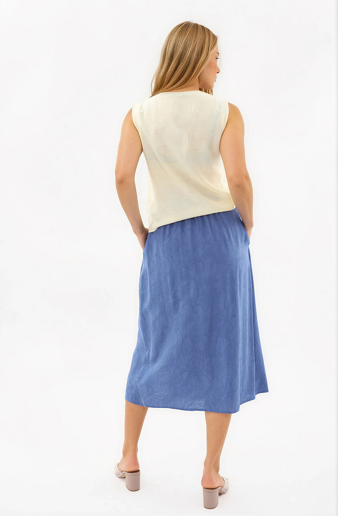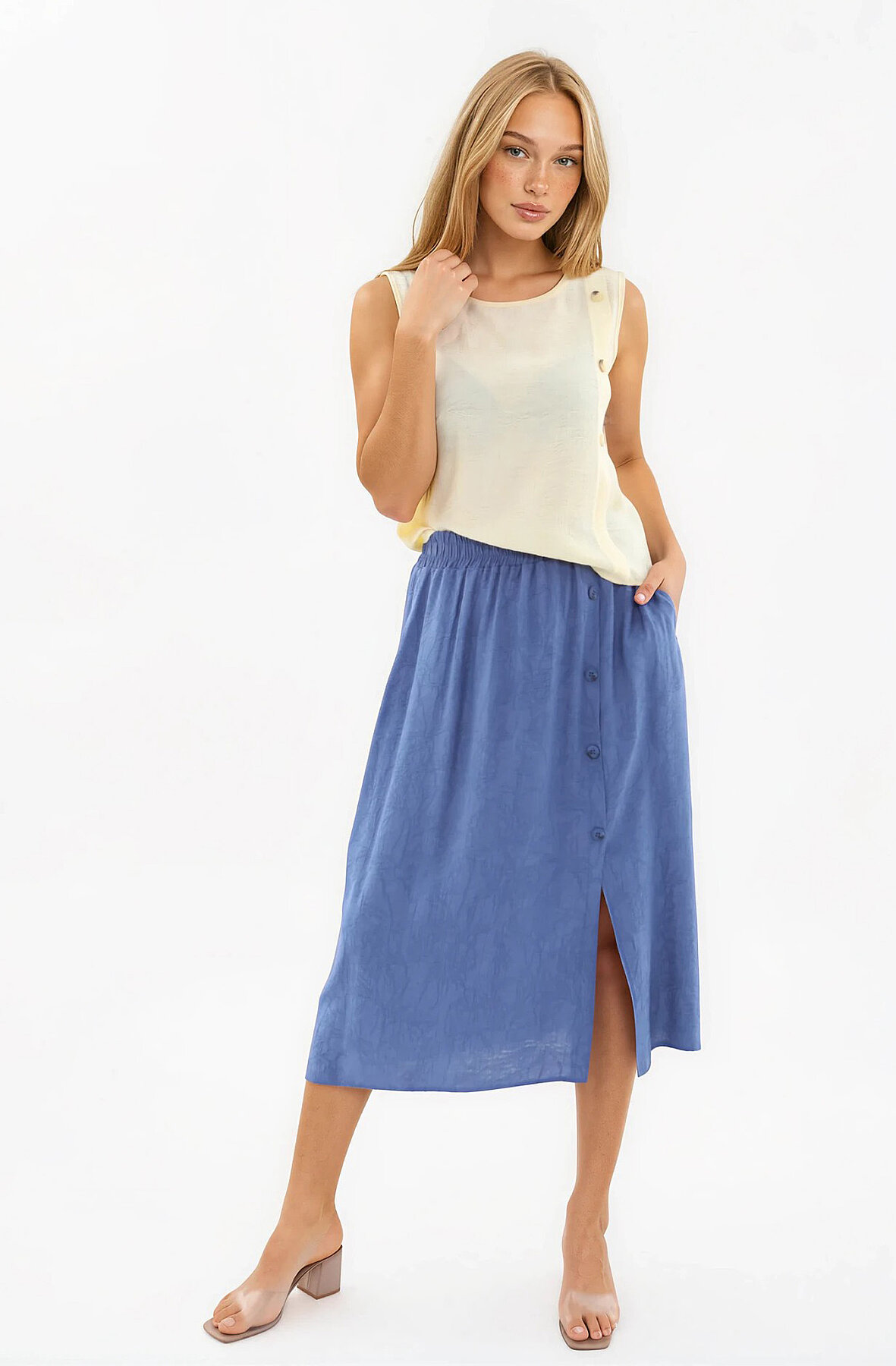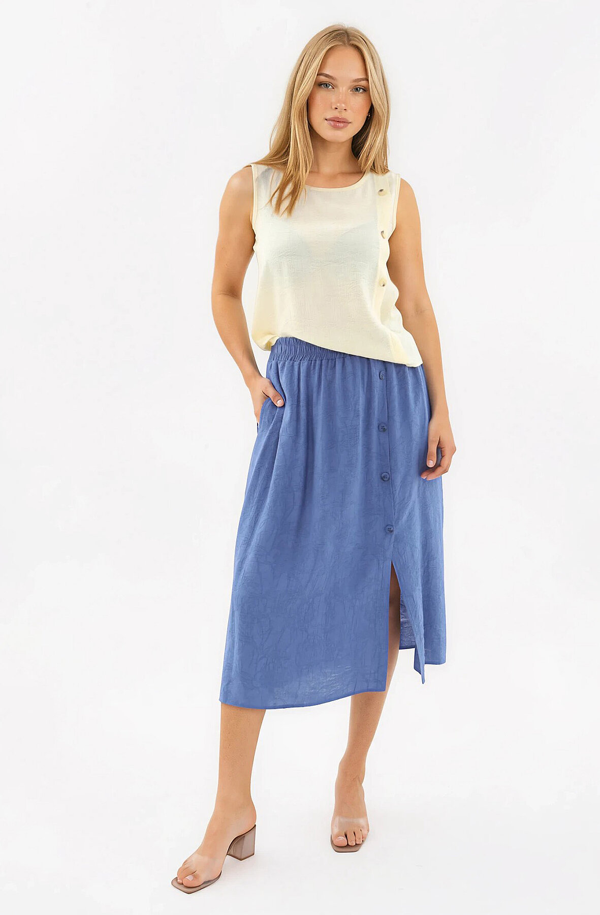Beli Lastikli Kendinden Desenli Düğmeli Etek İndigo