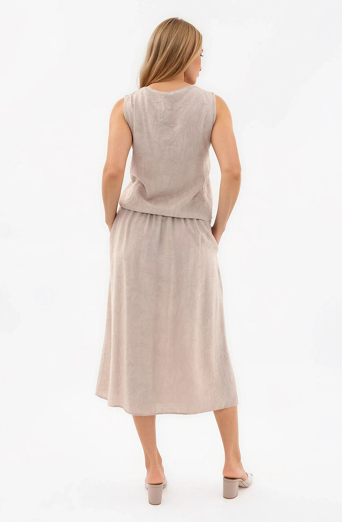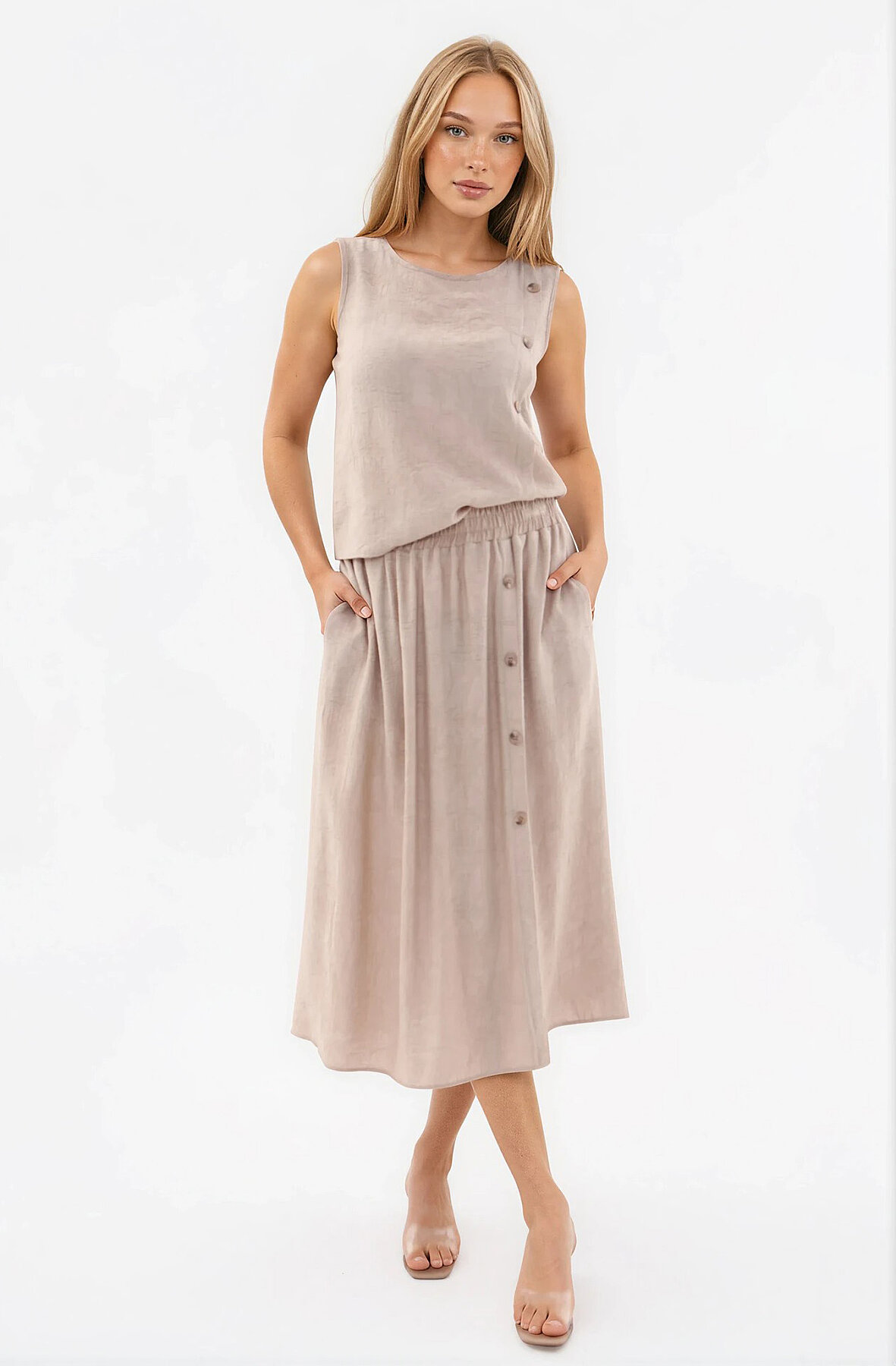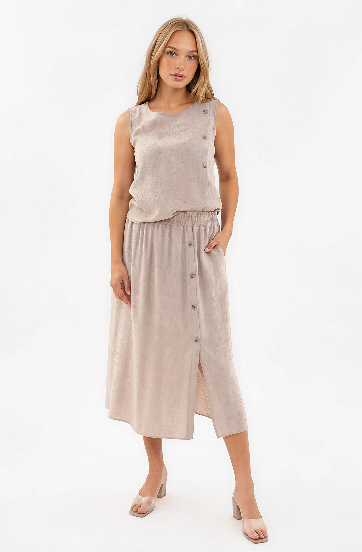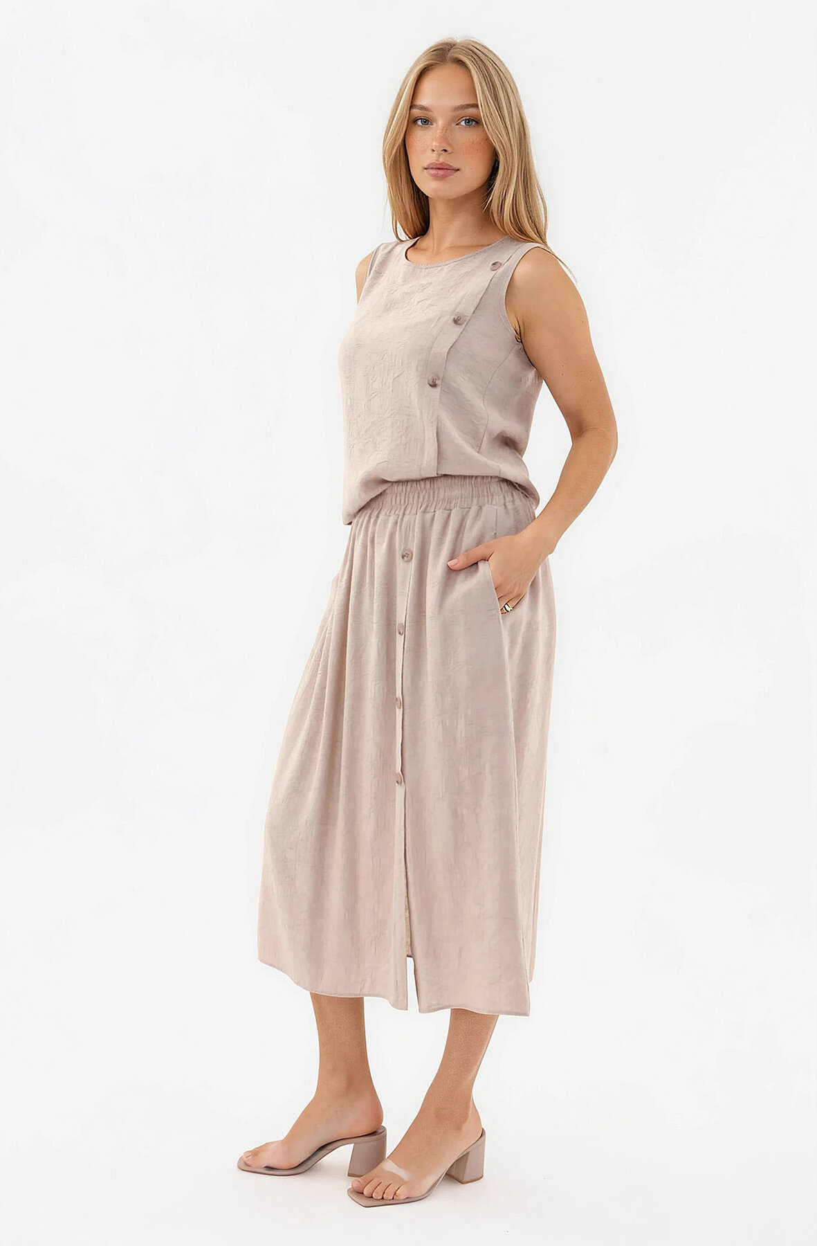 Beli Lastikli Kendinden Desenli Düğmeli Etek Vizon