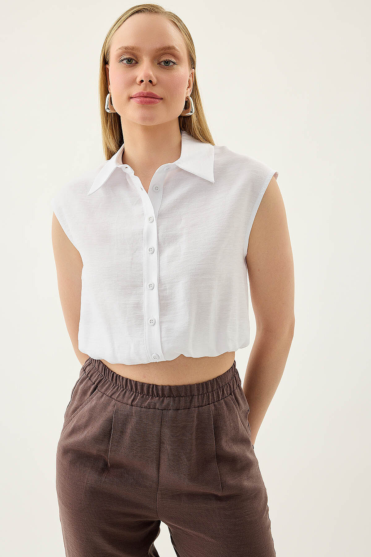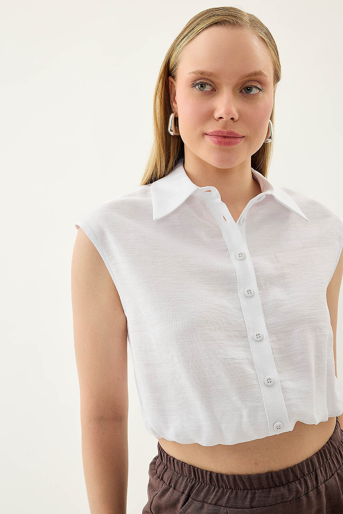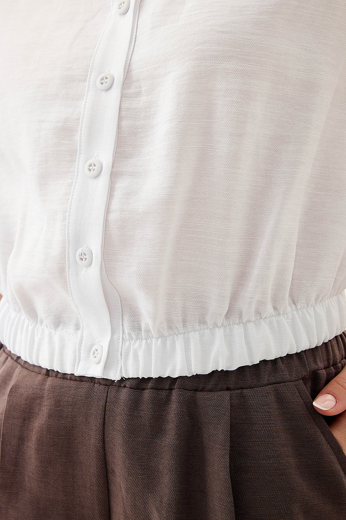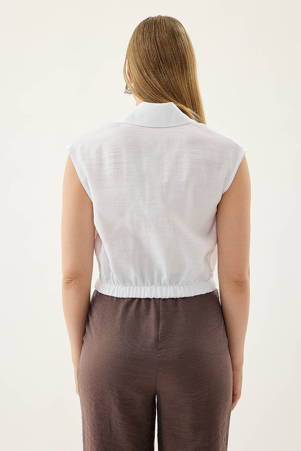 Beli Lastikli Önü Düğmeli Sıfır Kol Bluz Beyaz
