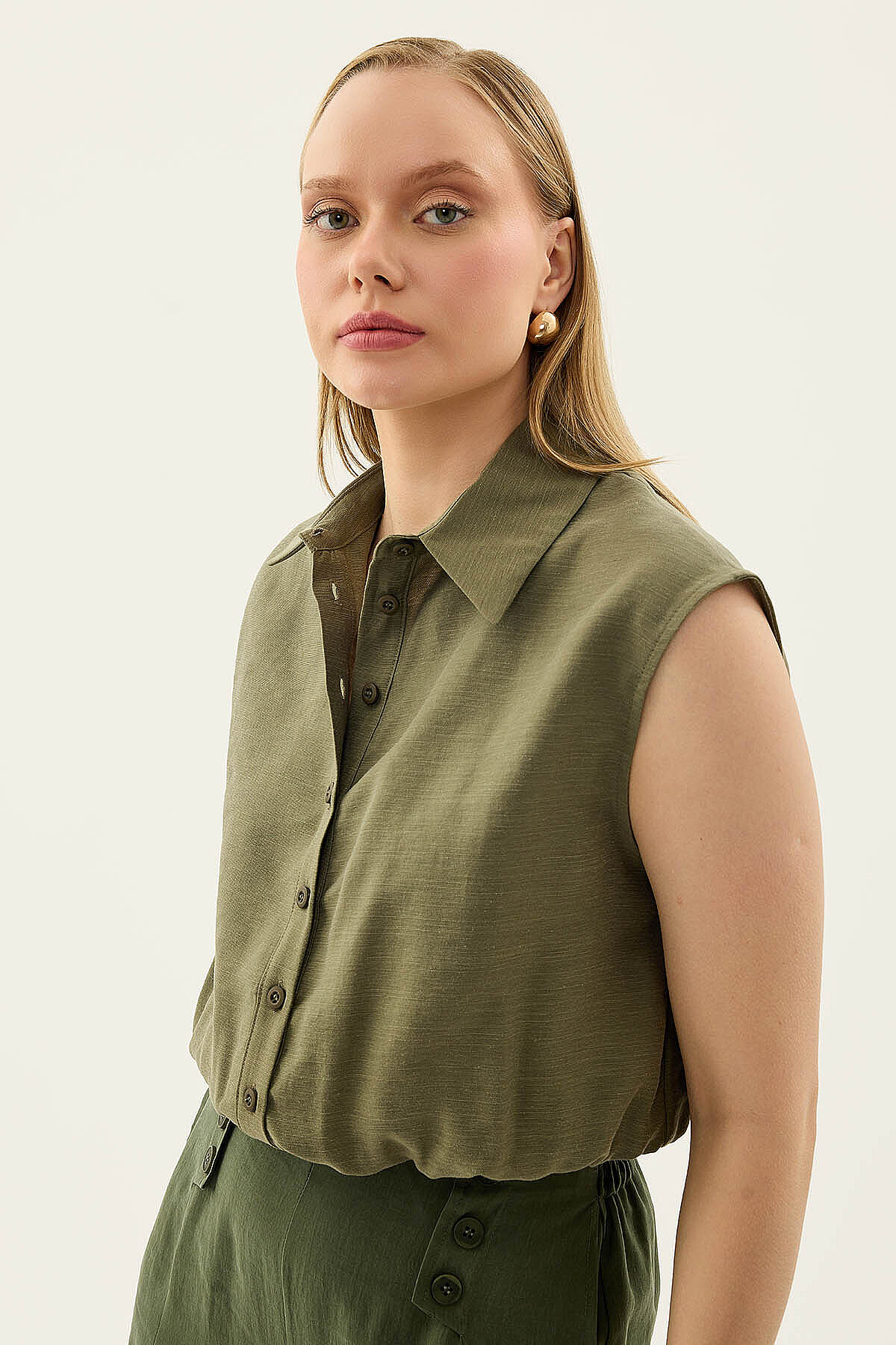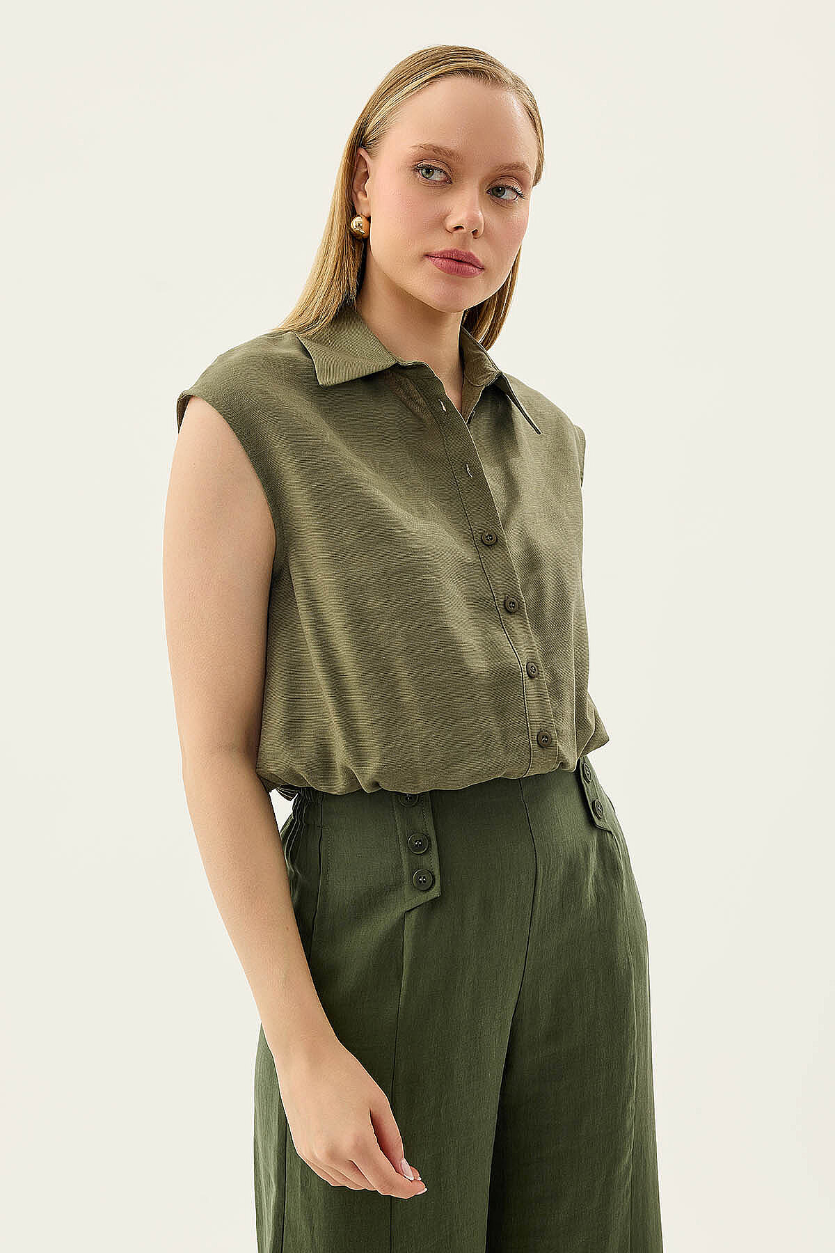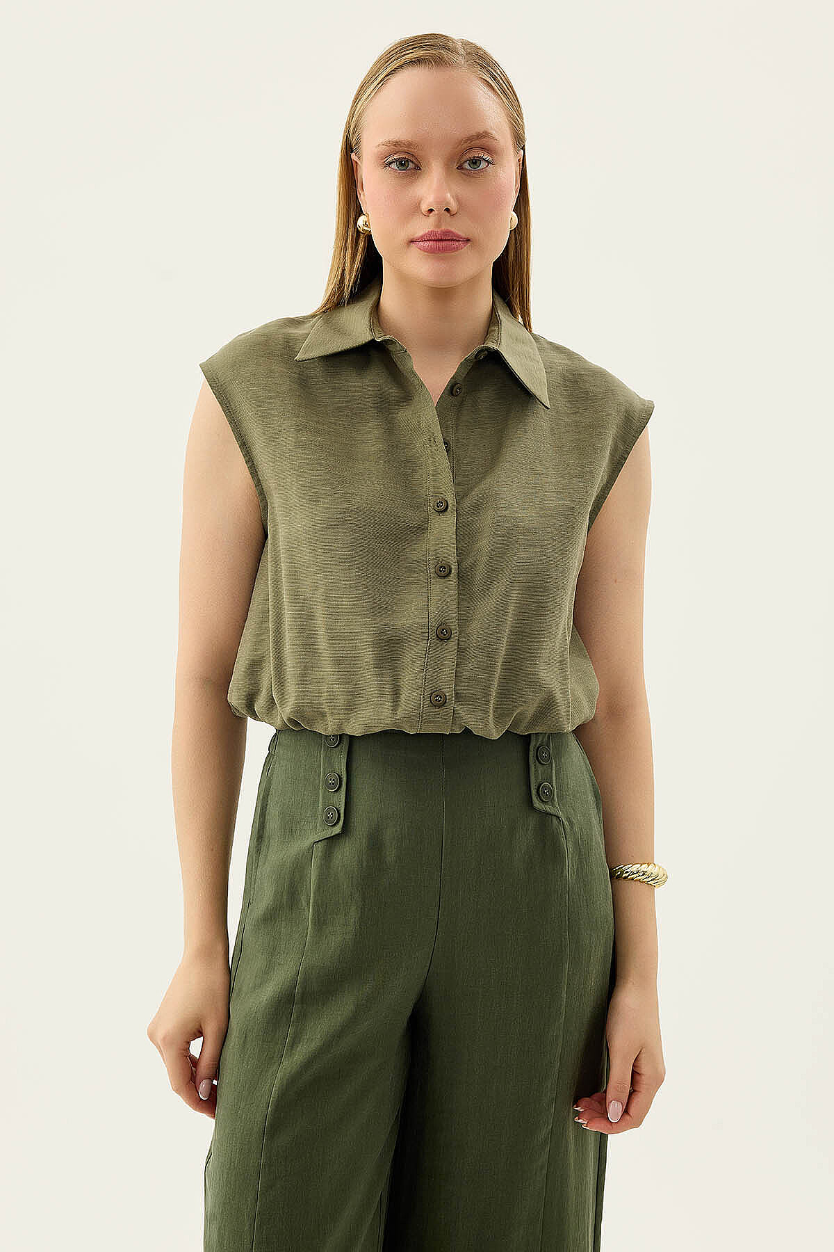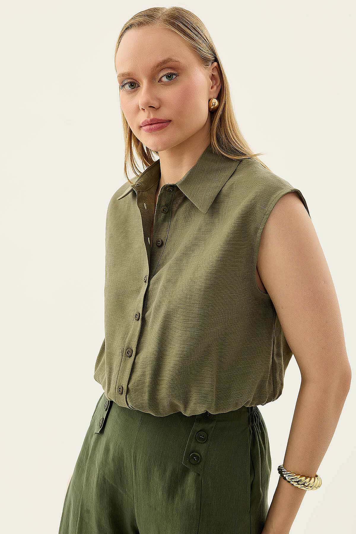 Beli Lastikli Önü Düğmeli Sıfır Kol Bluz Haki
