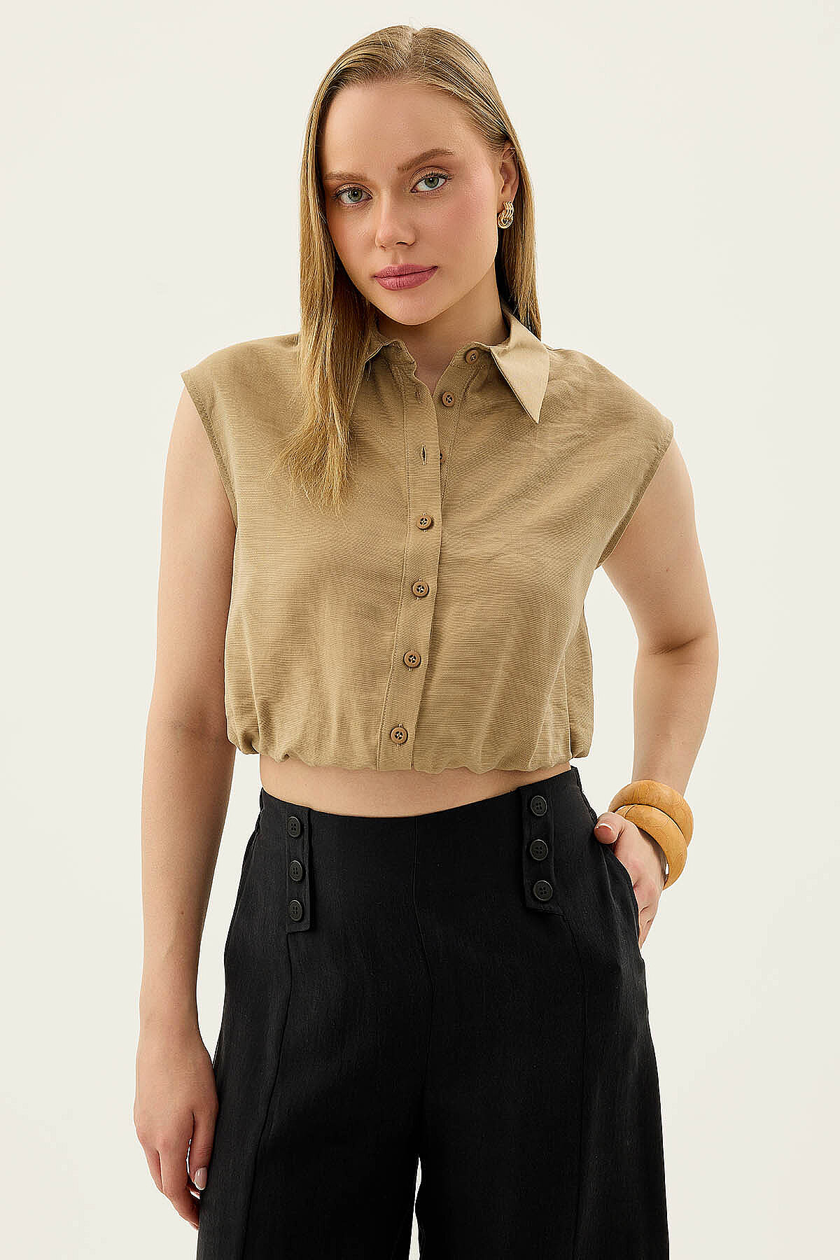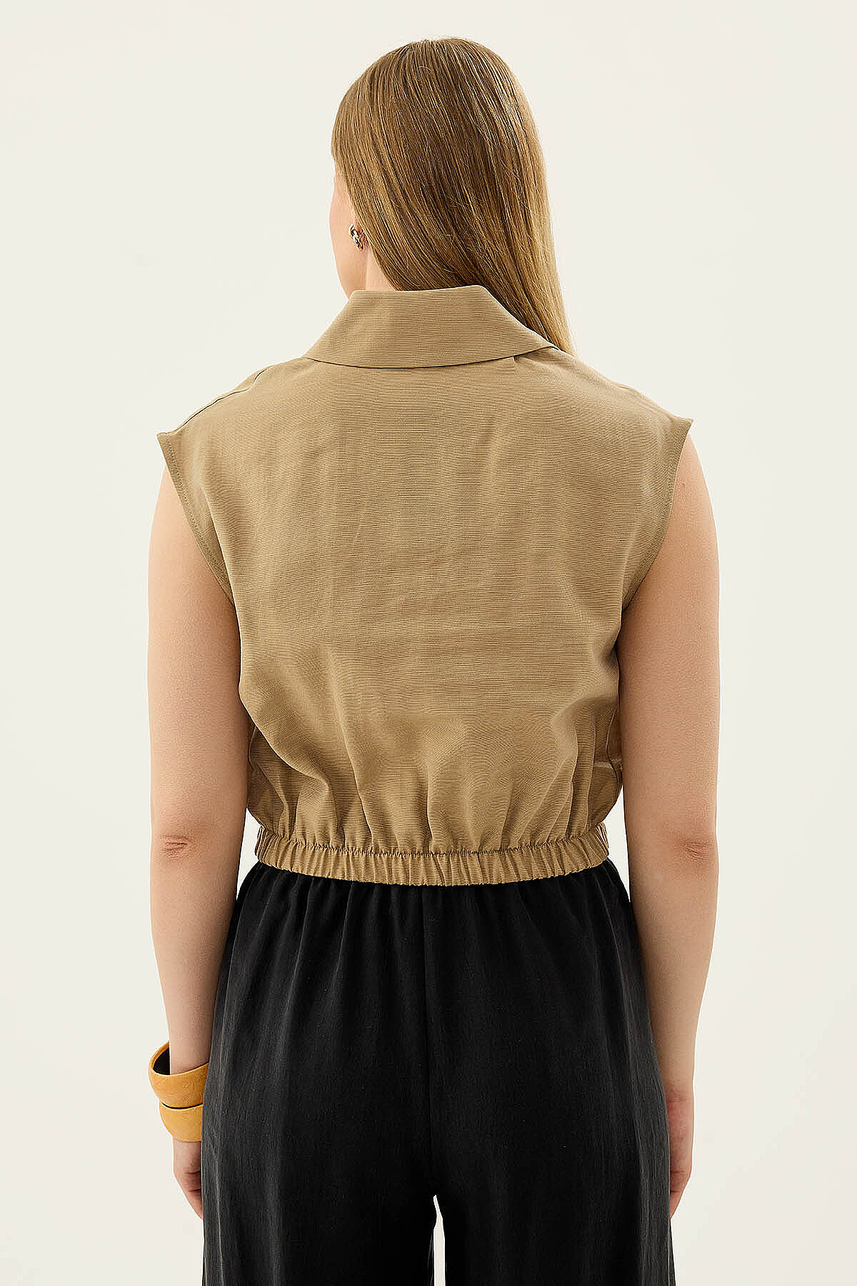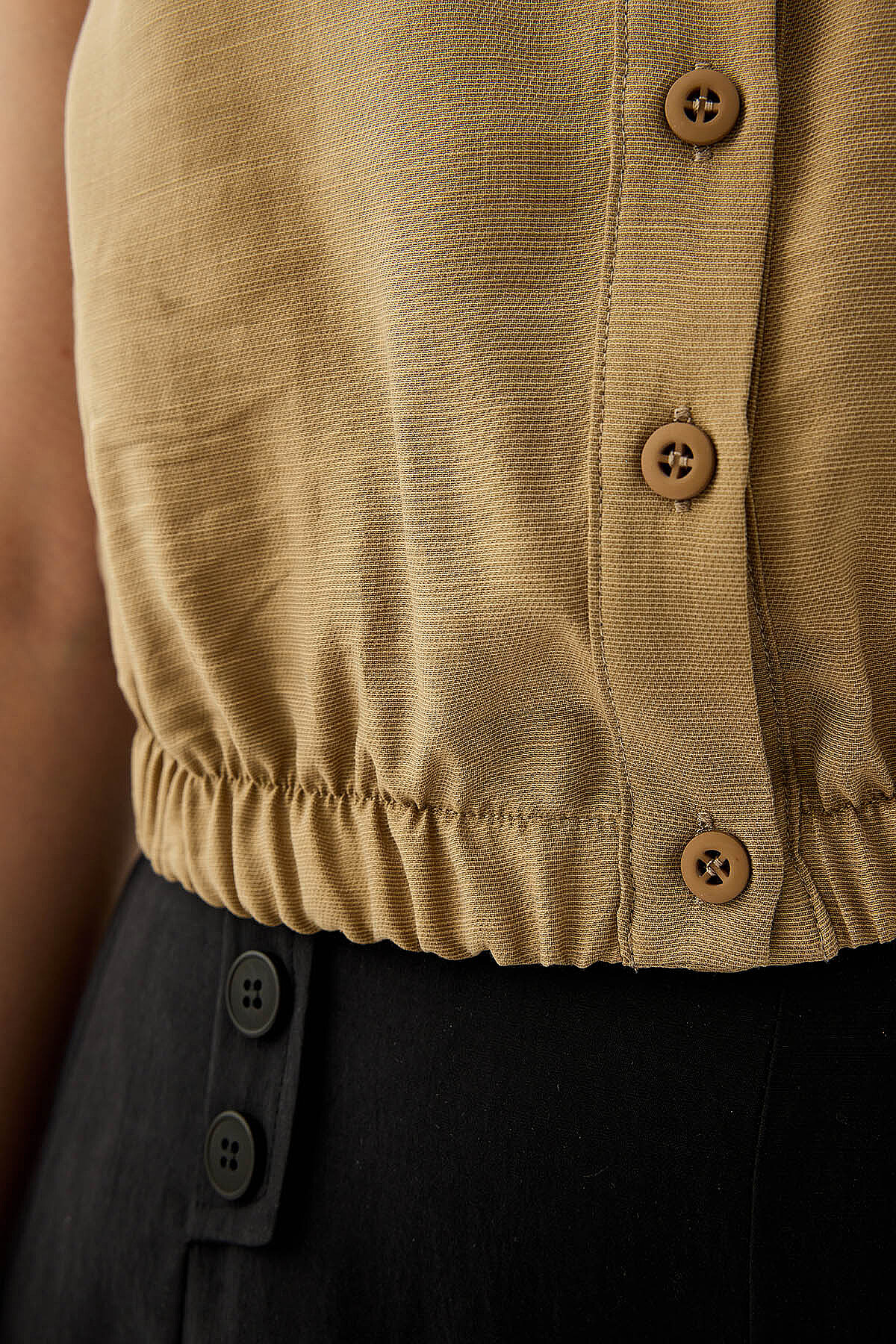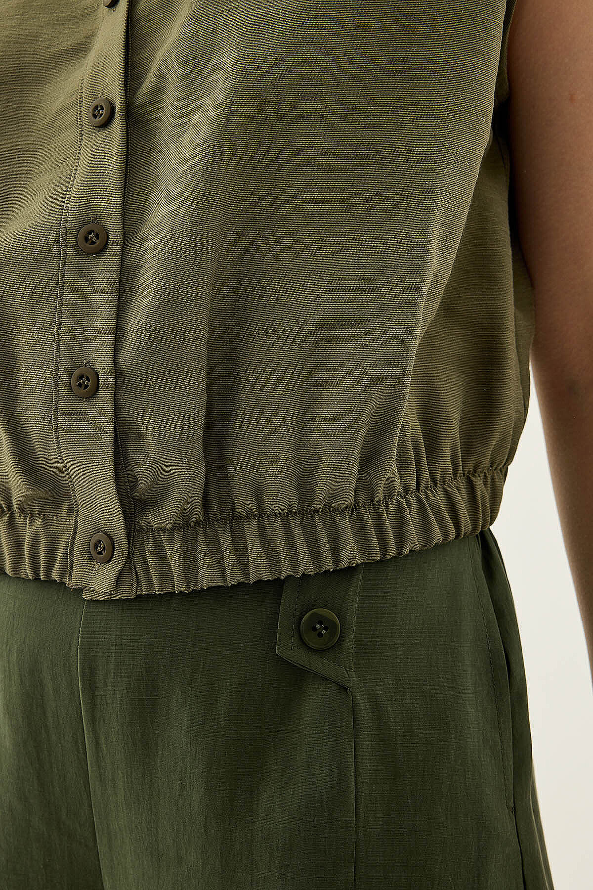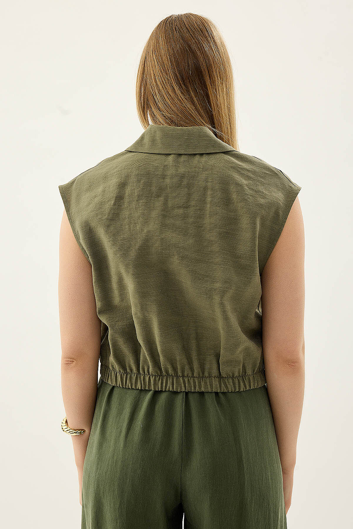 Beli Lastikli Önü Düğmeli Sıfır Kol Bluz Haki