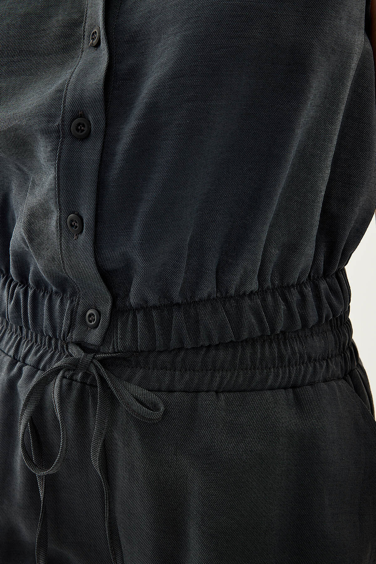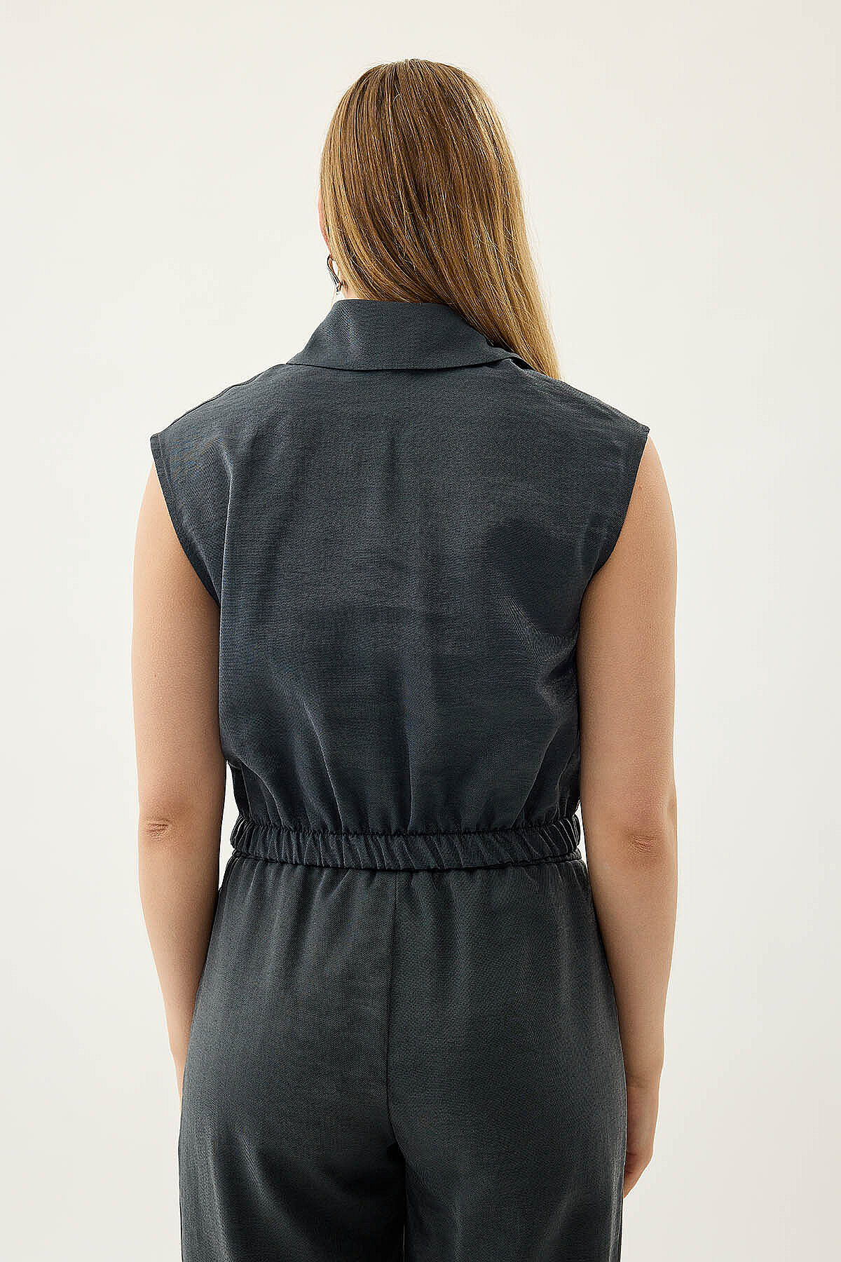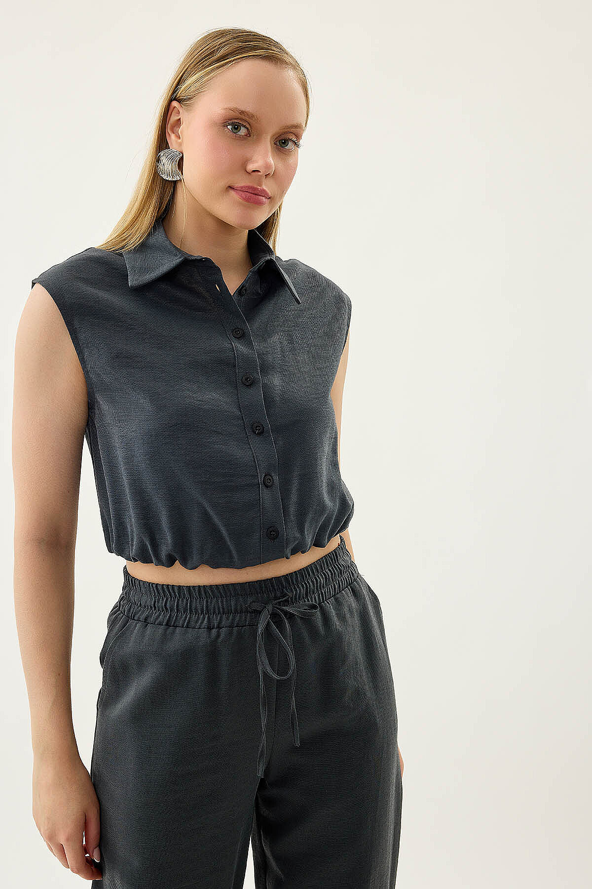 Beli Lastikli Önü Düğmeli Sıfır Kol Bluz Siyah