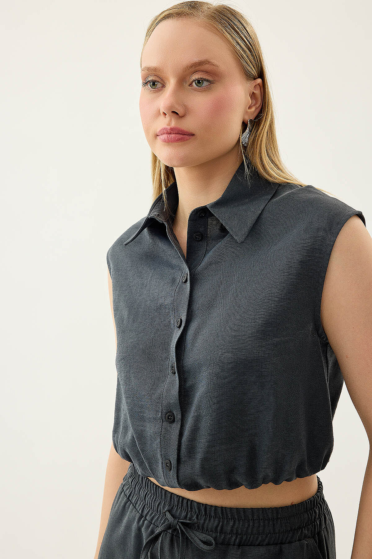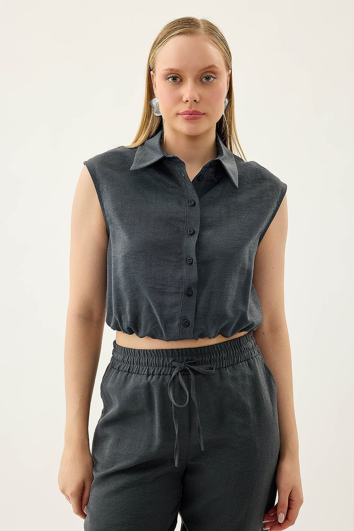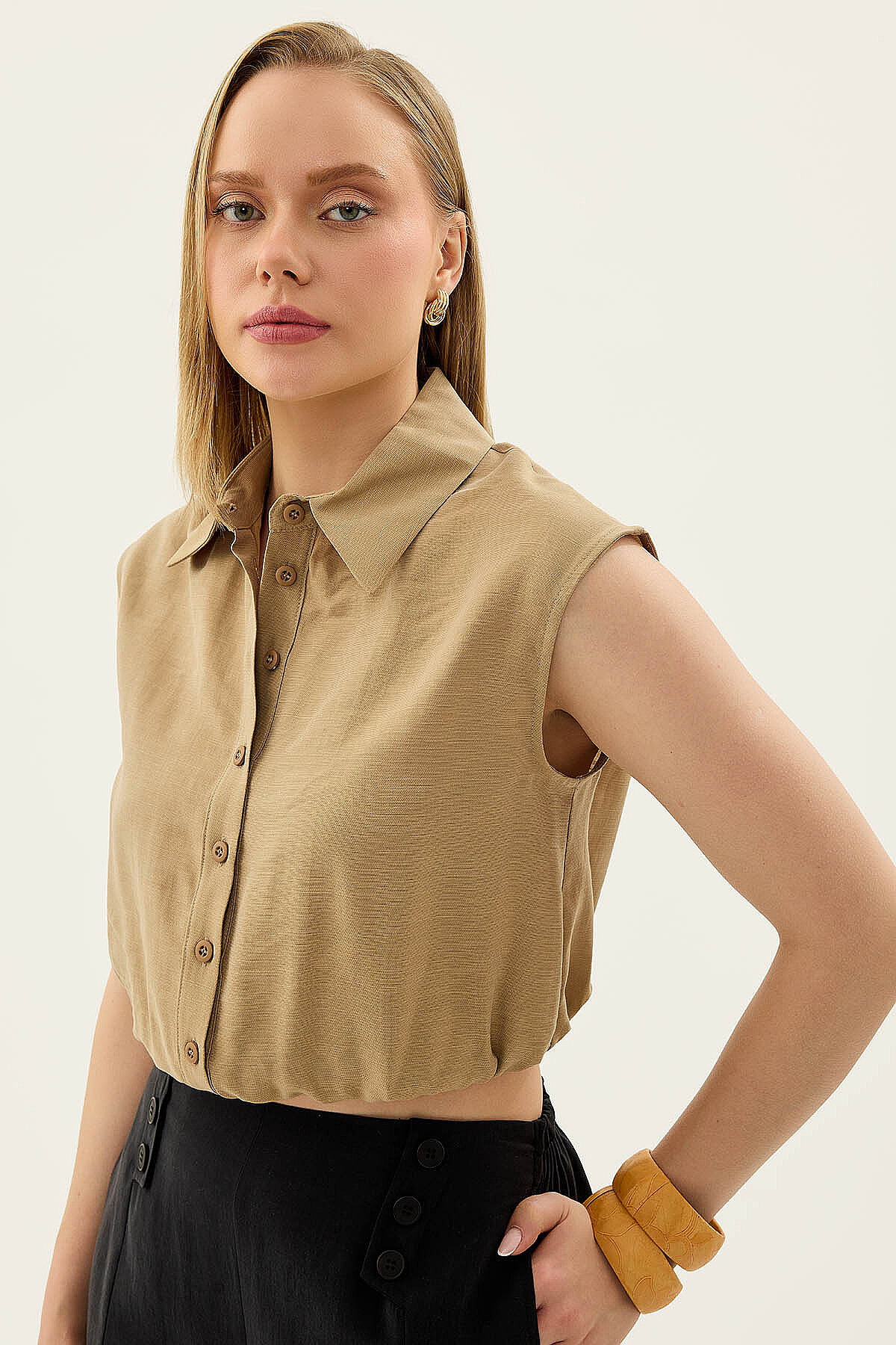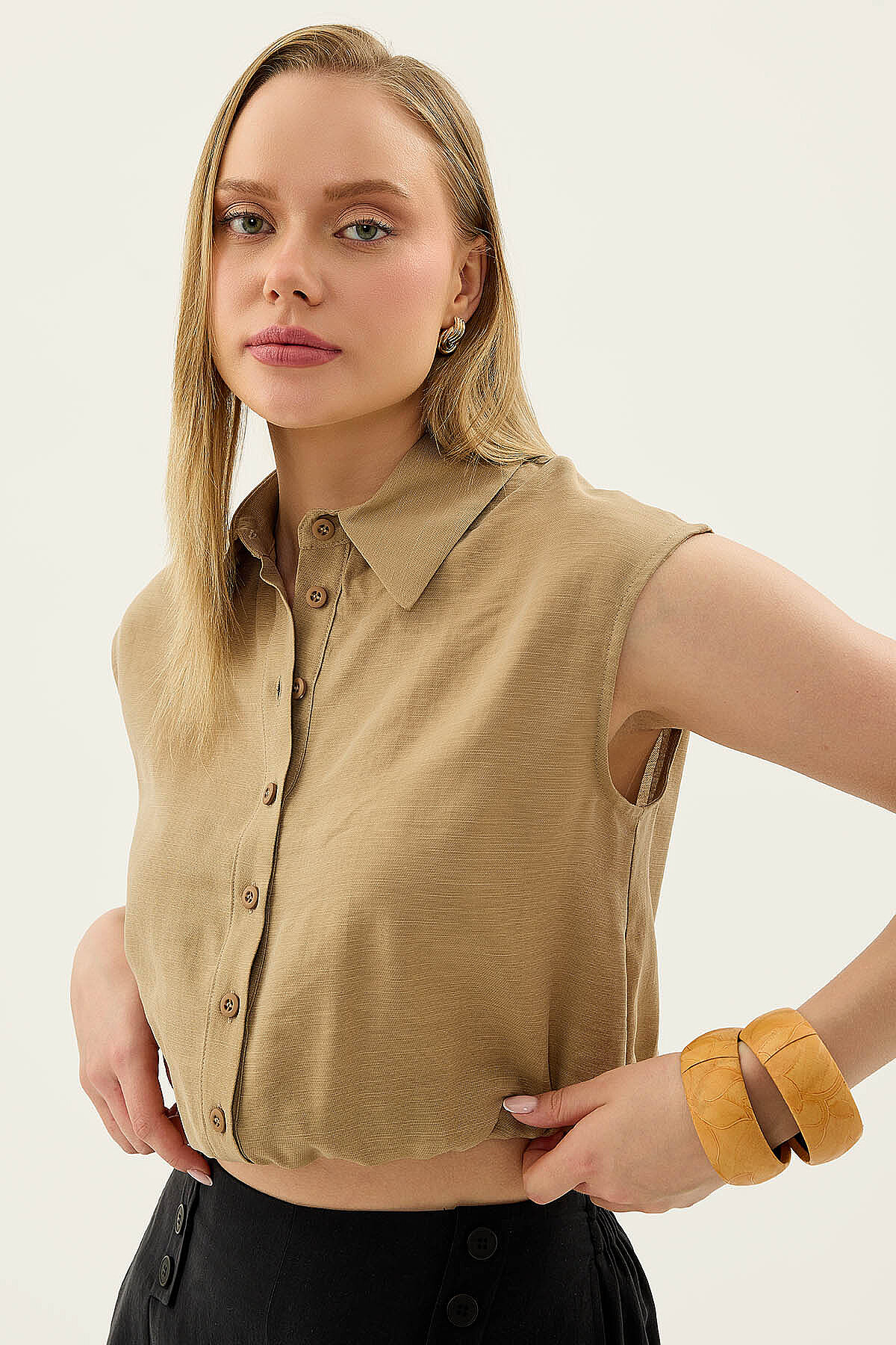 Beli Lastikli Önü Düğmeli Sıfır Kol Bluz