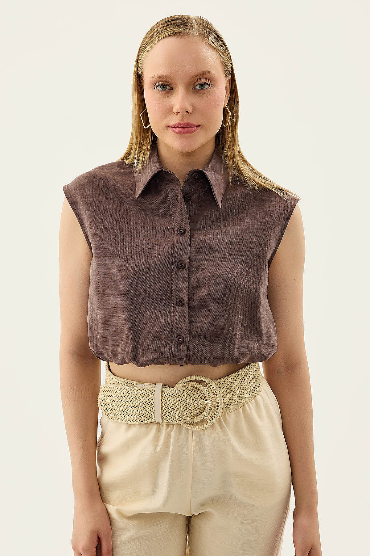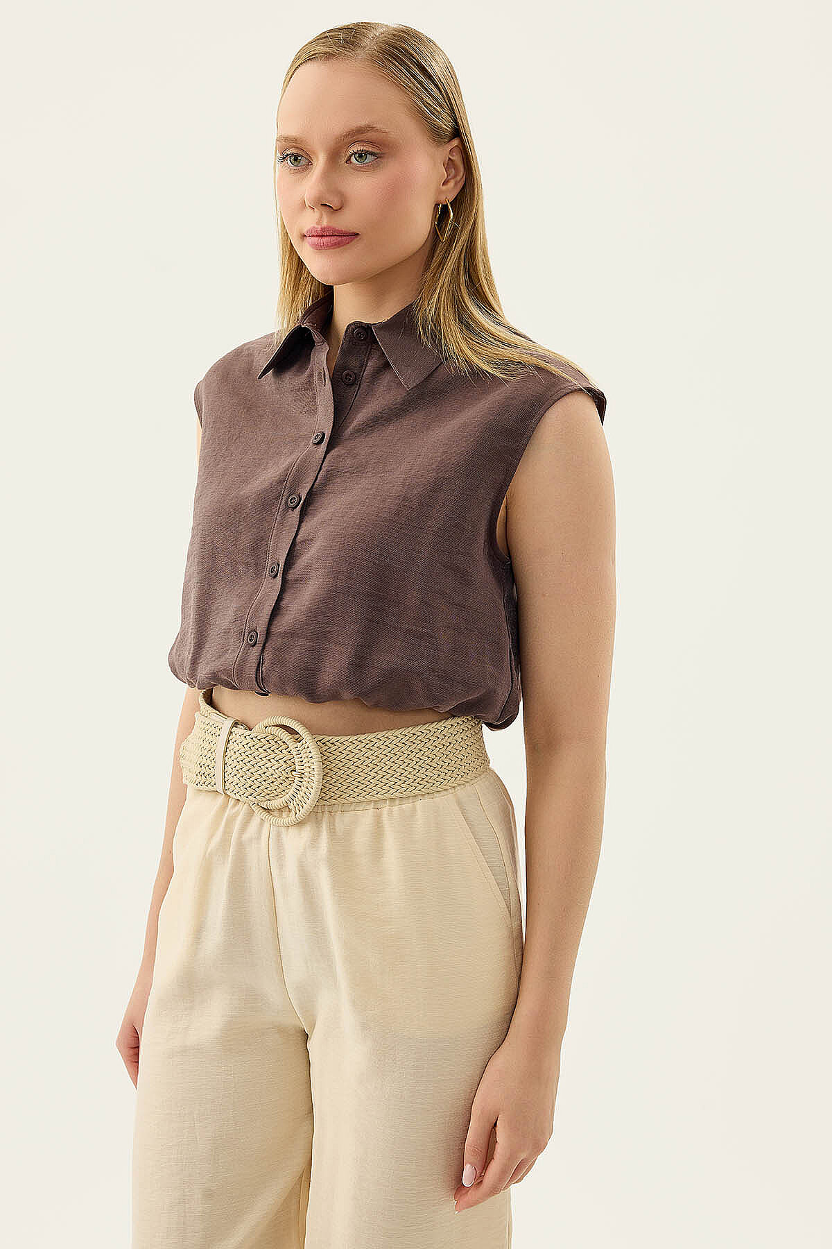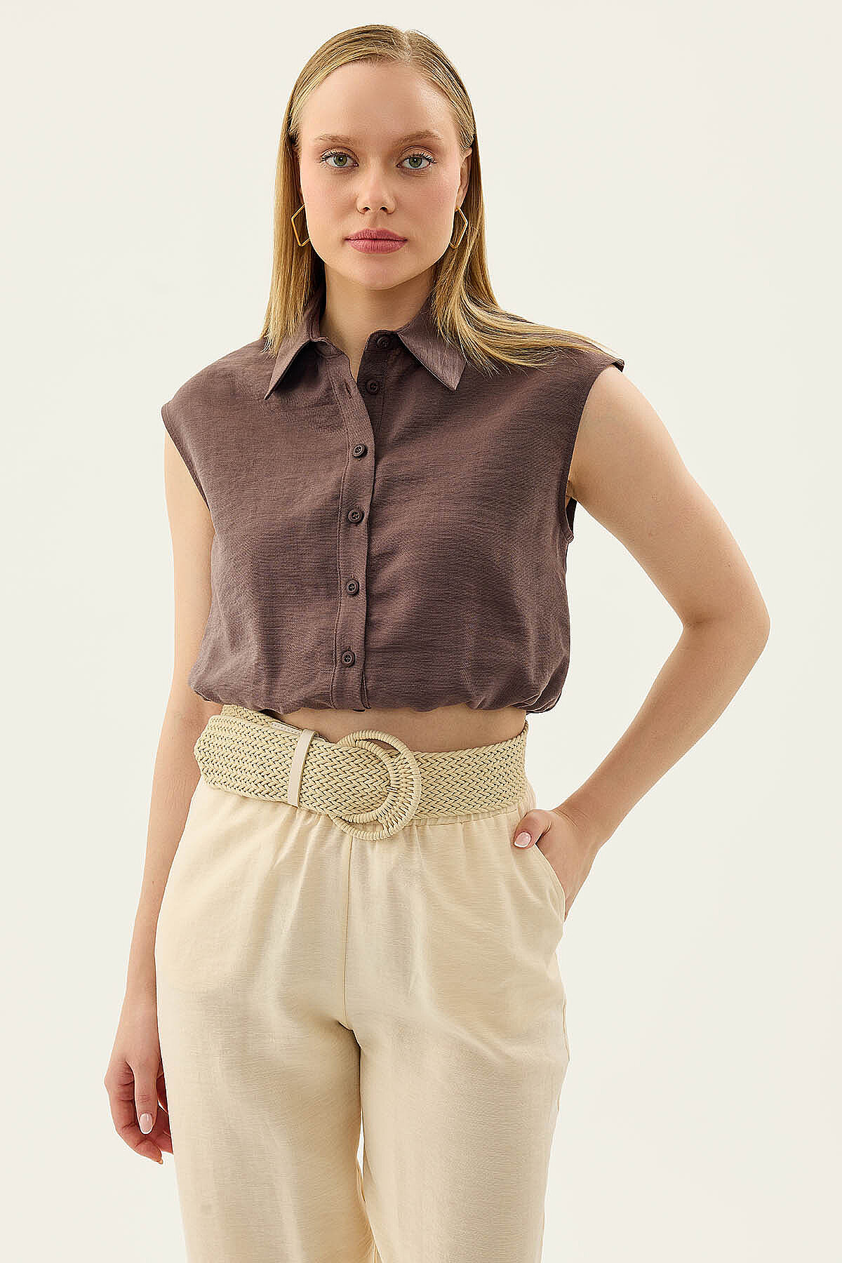 Beli Lastikli Önü Düğmeli Sıfır Kol Bluz S.Kahve