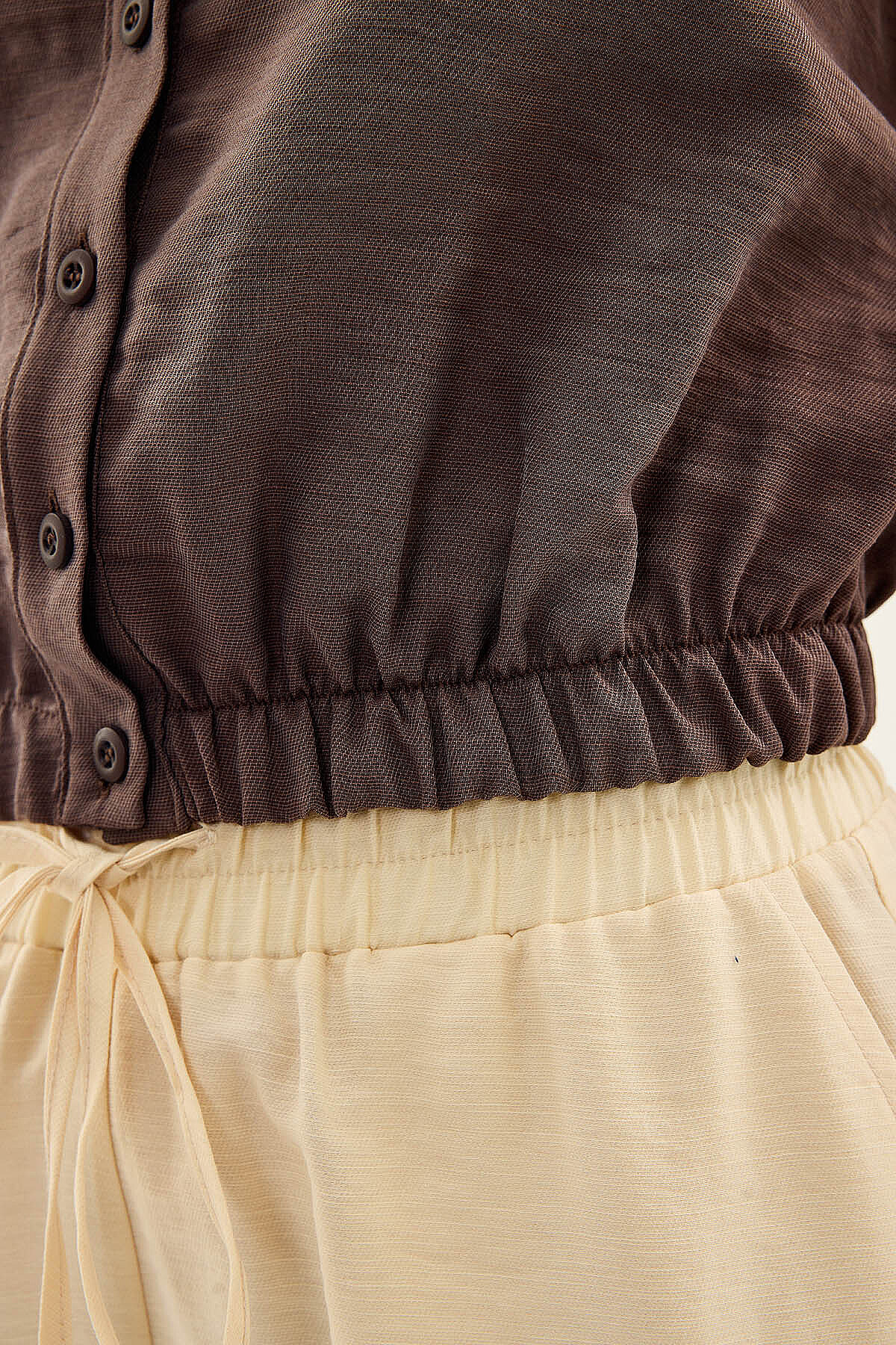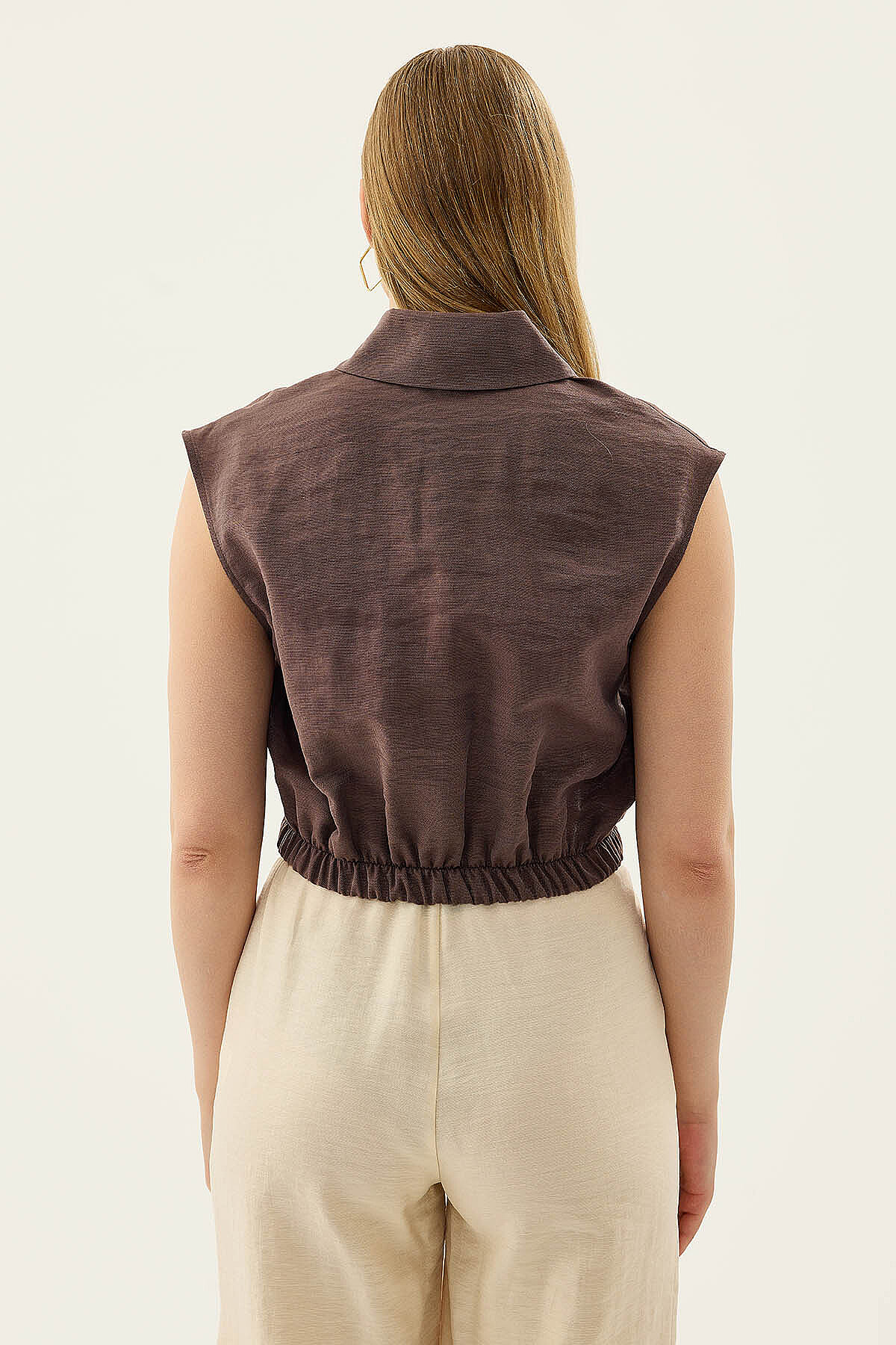 Beli Lastikli Önü Düğmeli Sıfır Kol Bluz Kahve