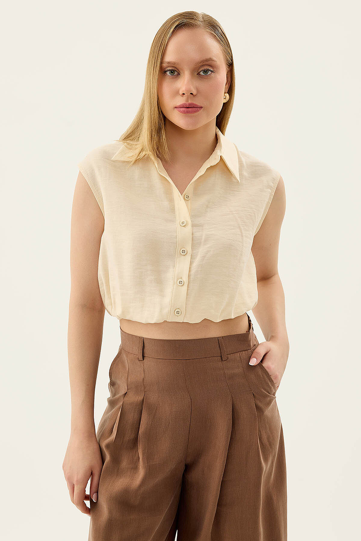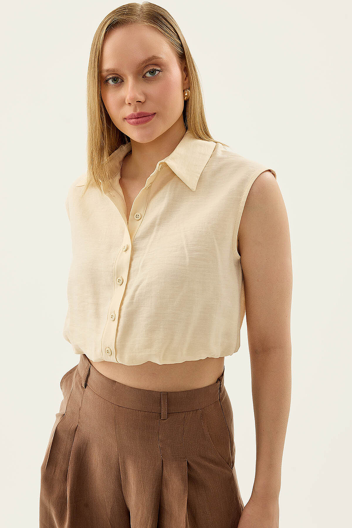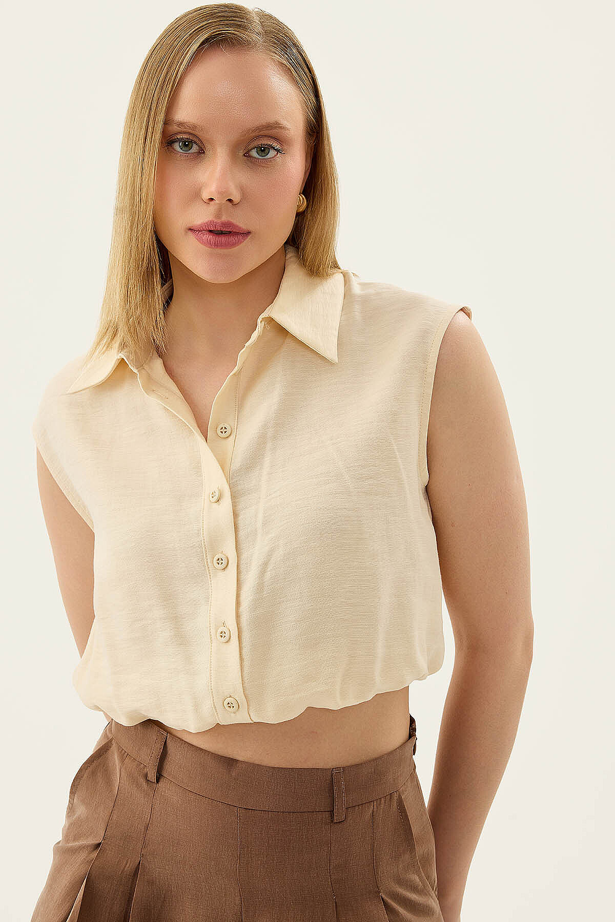 Beli Lastikli Önü Düğmeli Sıfır Kol Bluz Krem