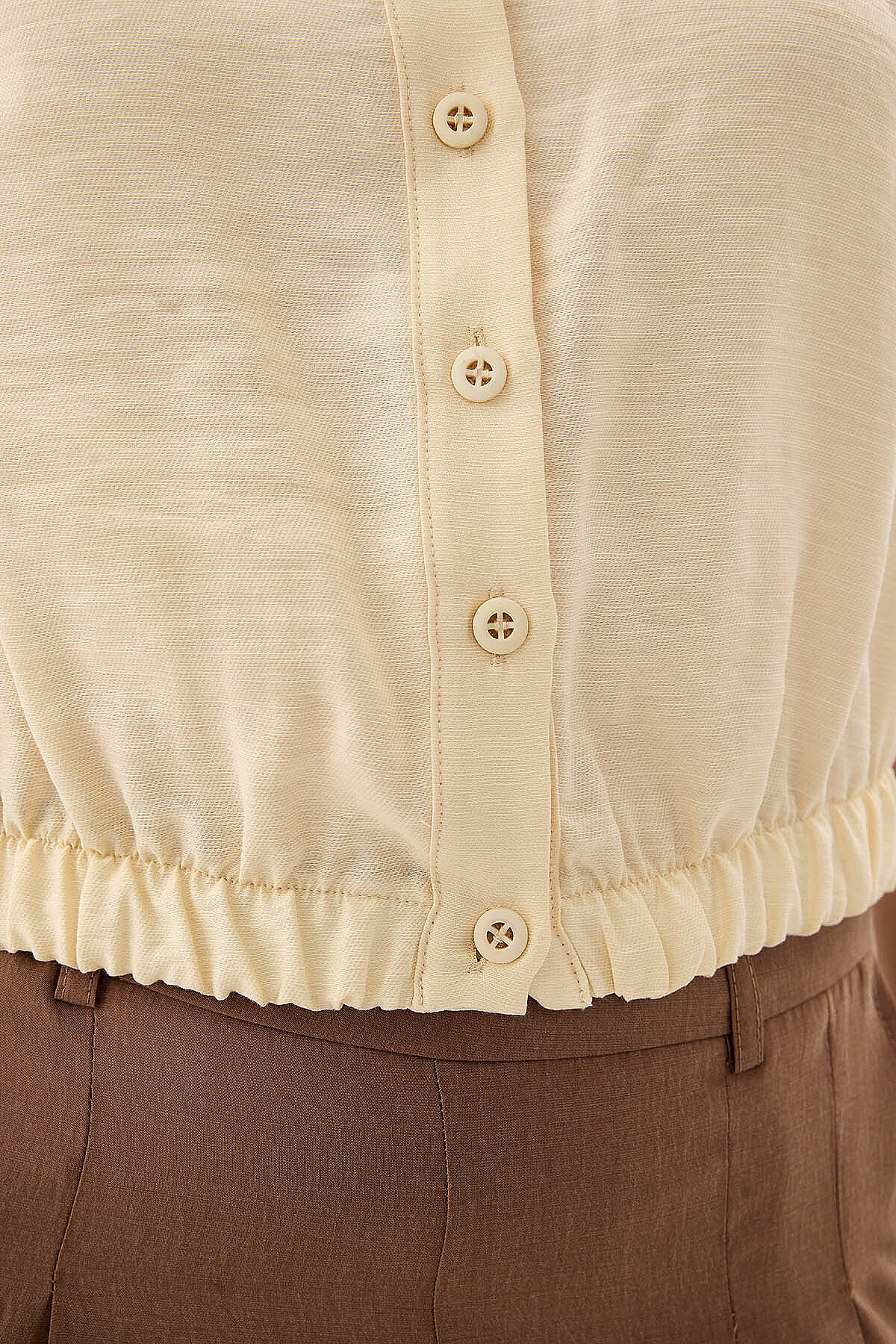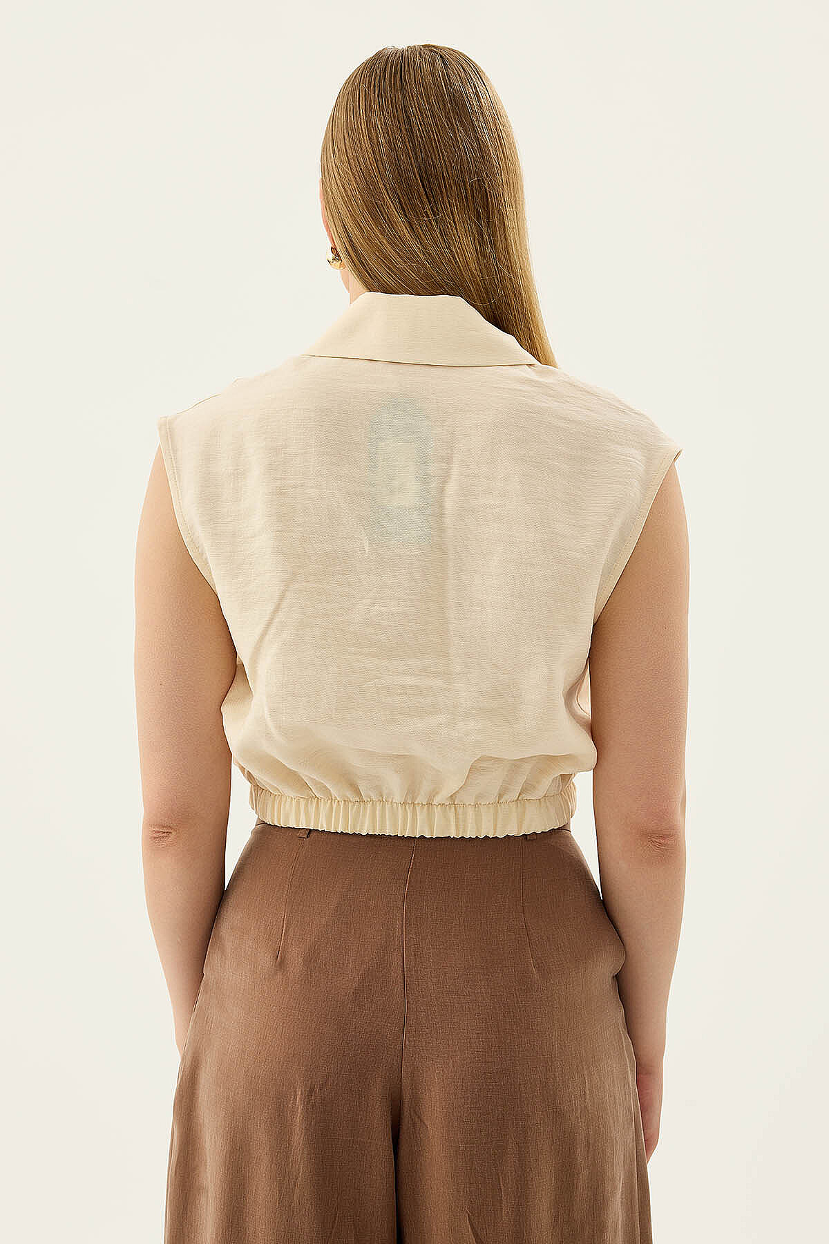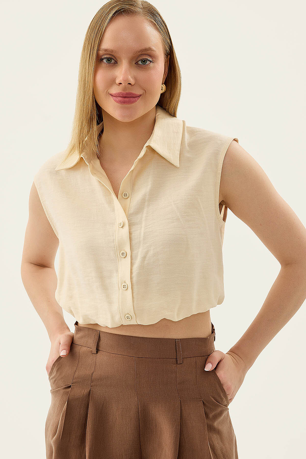 Beli Lastikli Önü Düğmeli Sıfır Kol Bluz Krem