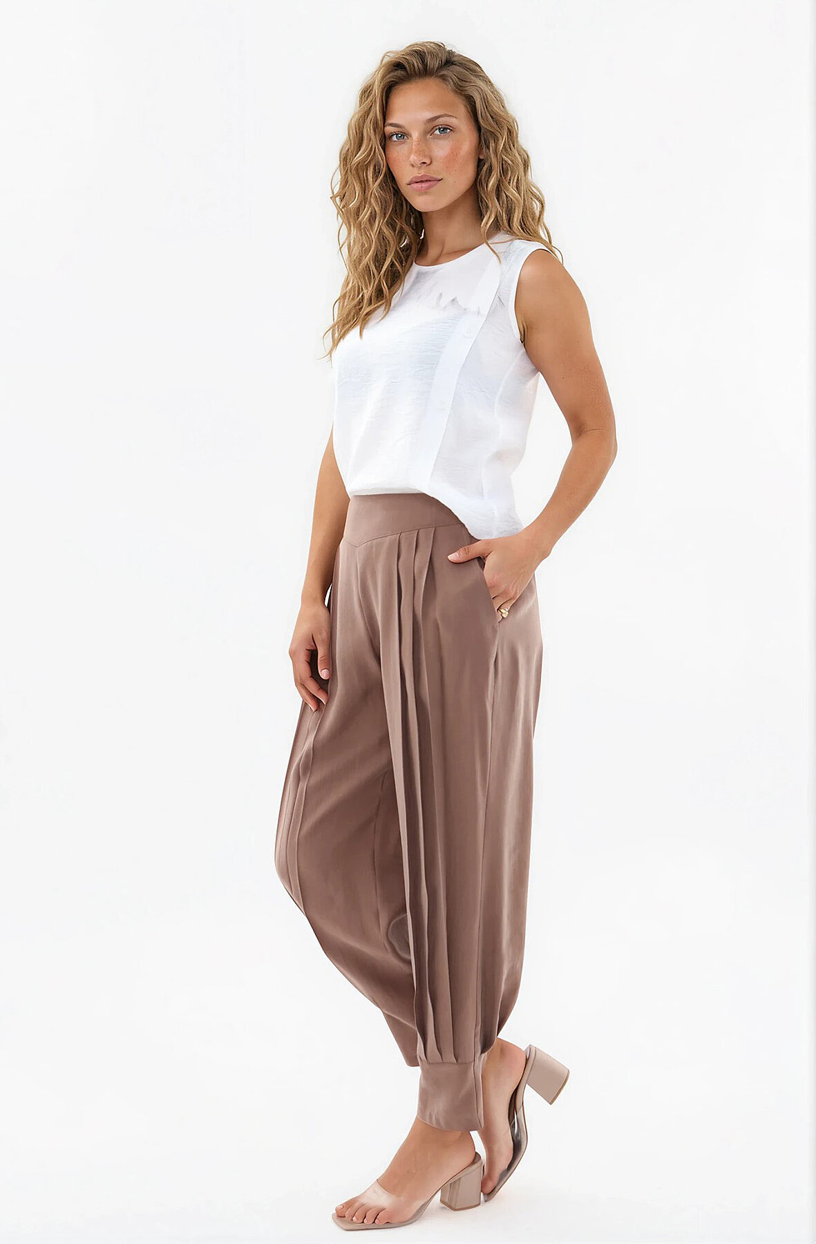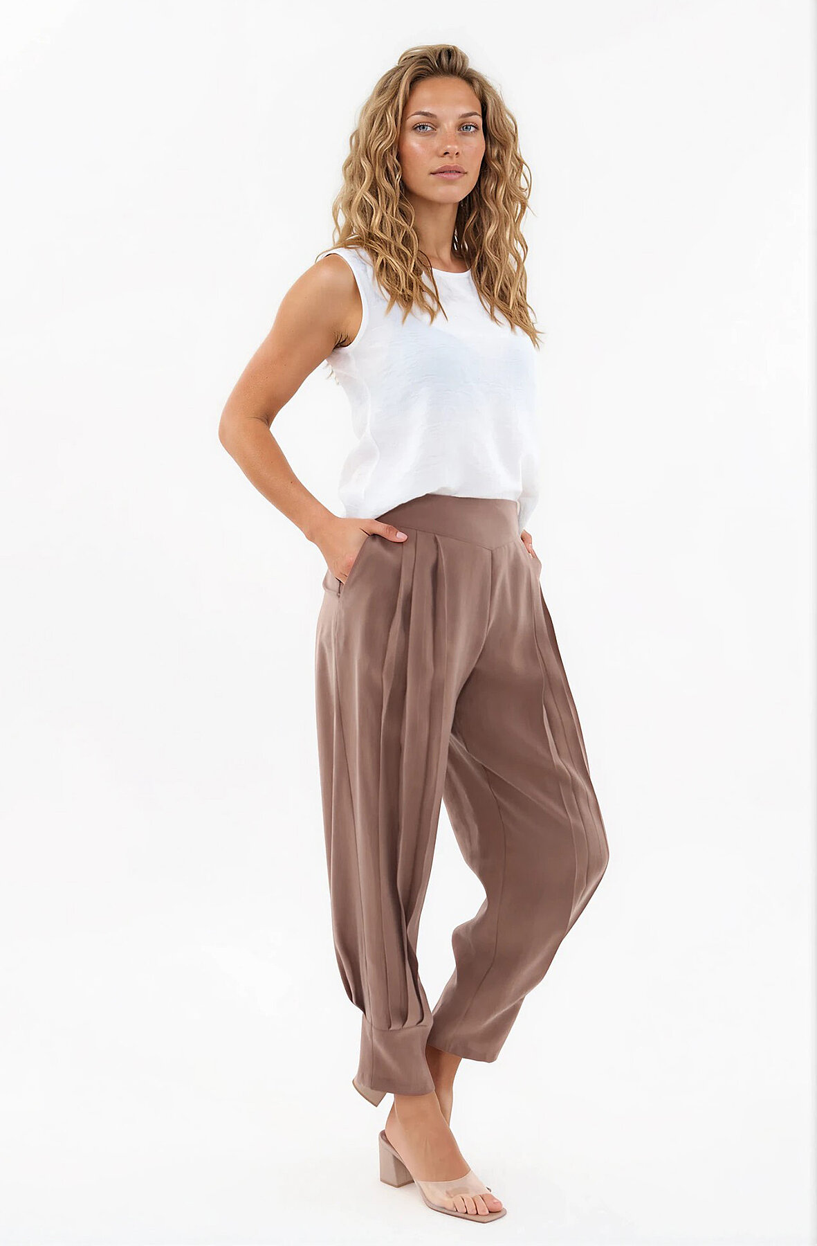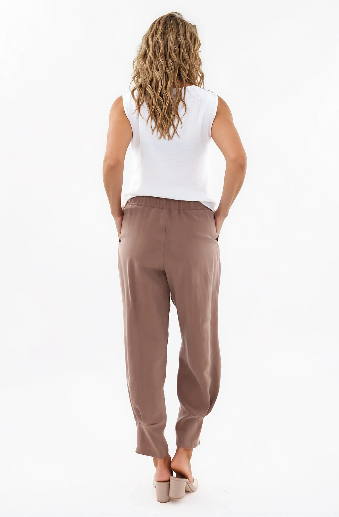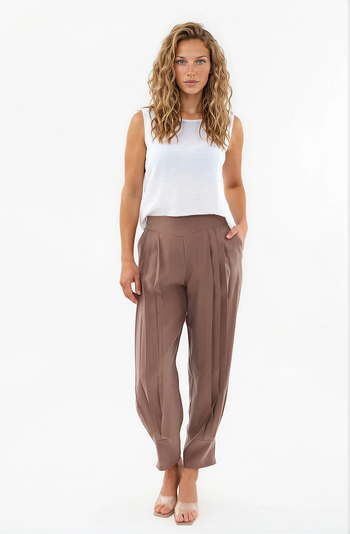 Beli Lastikli Önü Pileli Pantolon Kahve