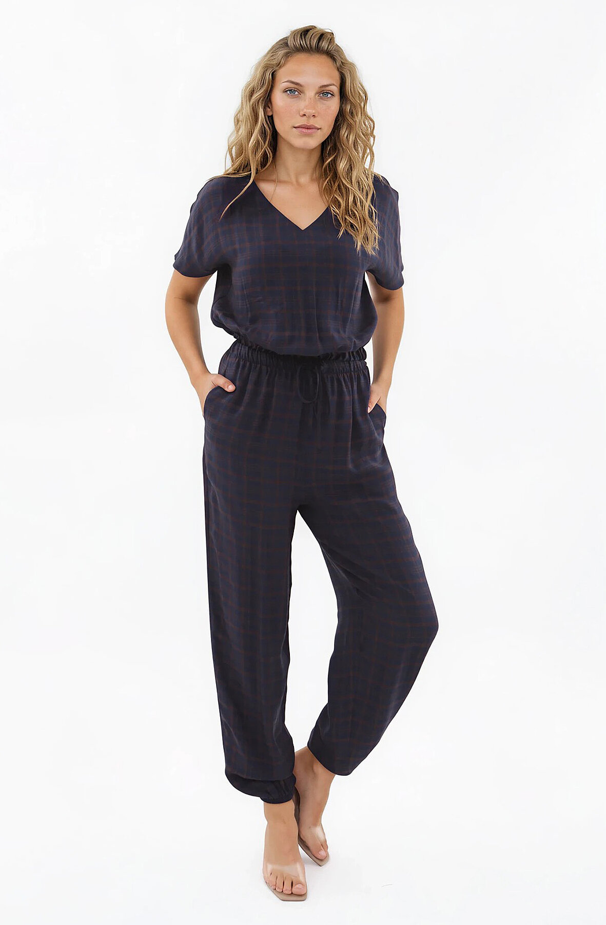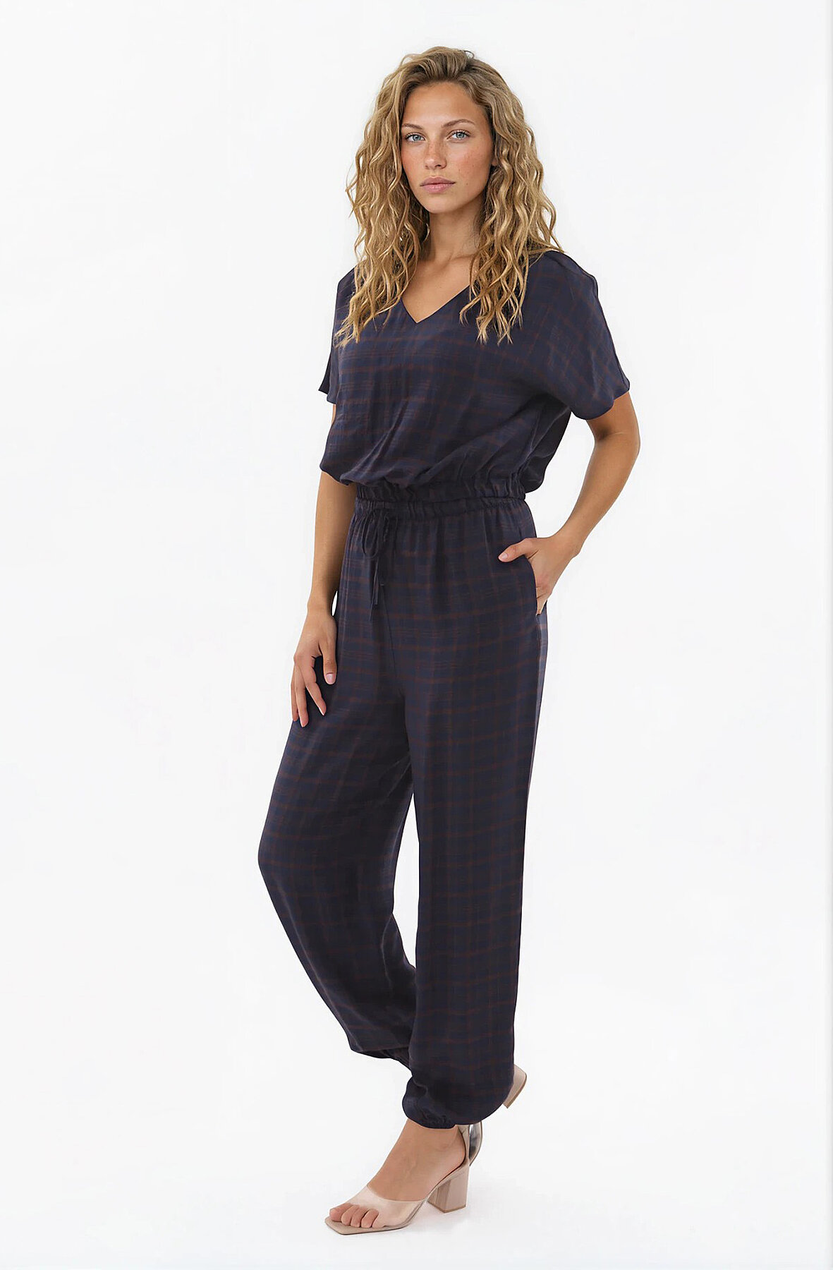 Beli Ve Paçası Lastikli Kareli Pantolon Lacivert