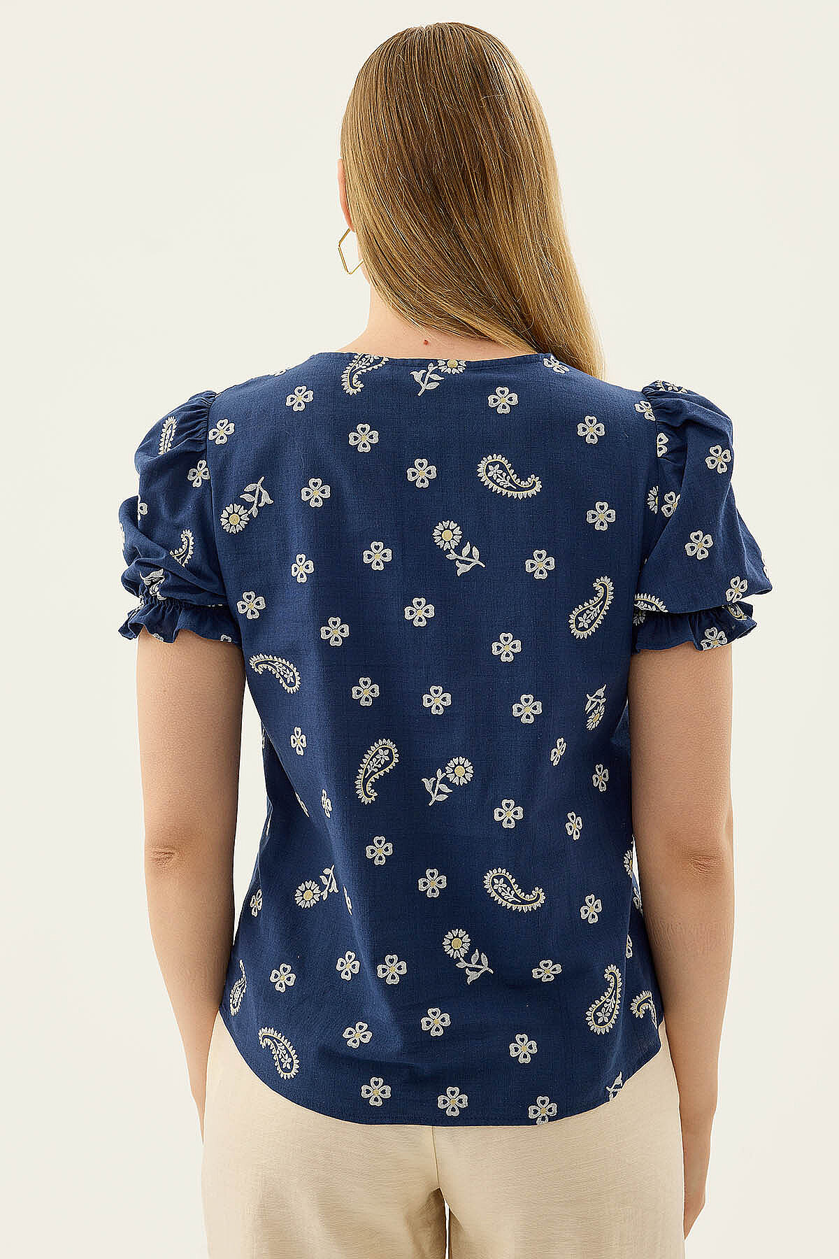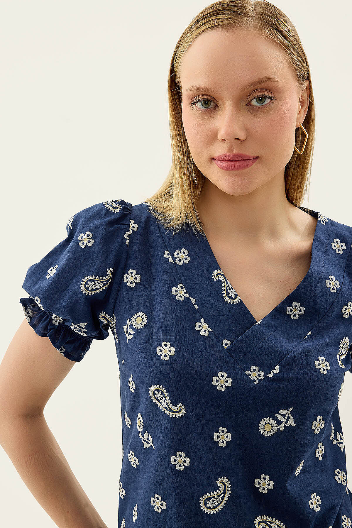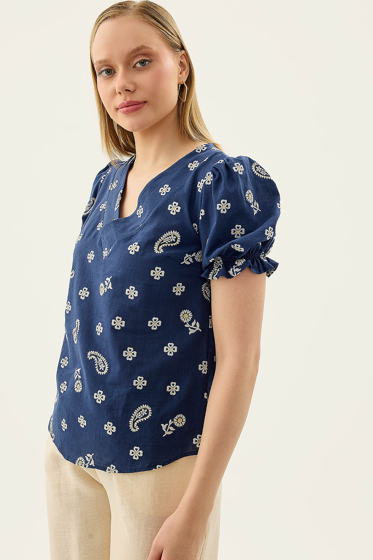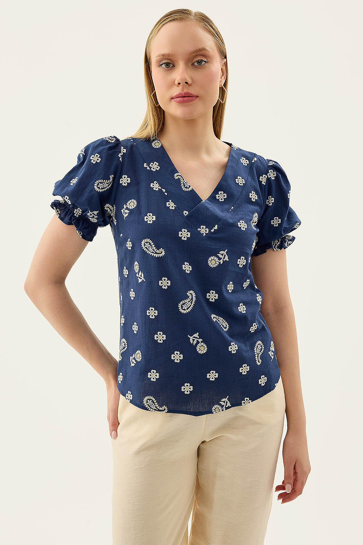 Çiçek Desenli V Yaka Balon Kol Bluz Lacivert