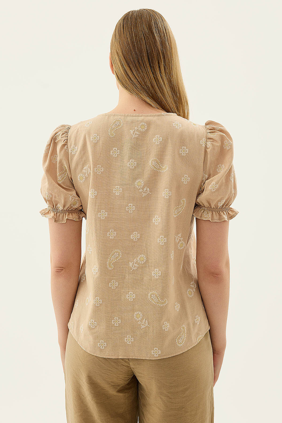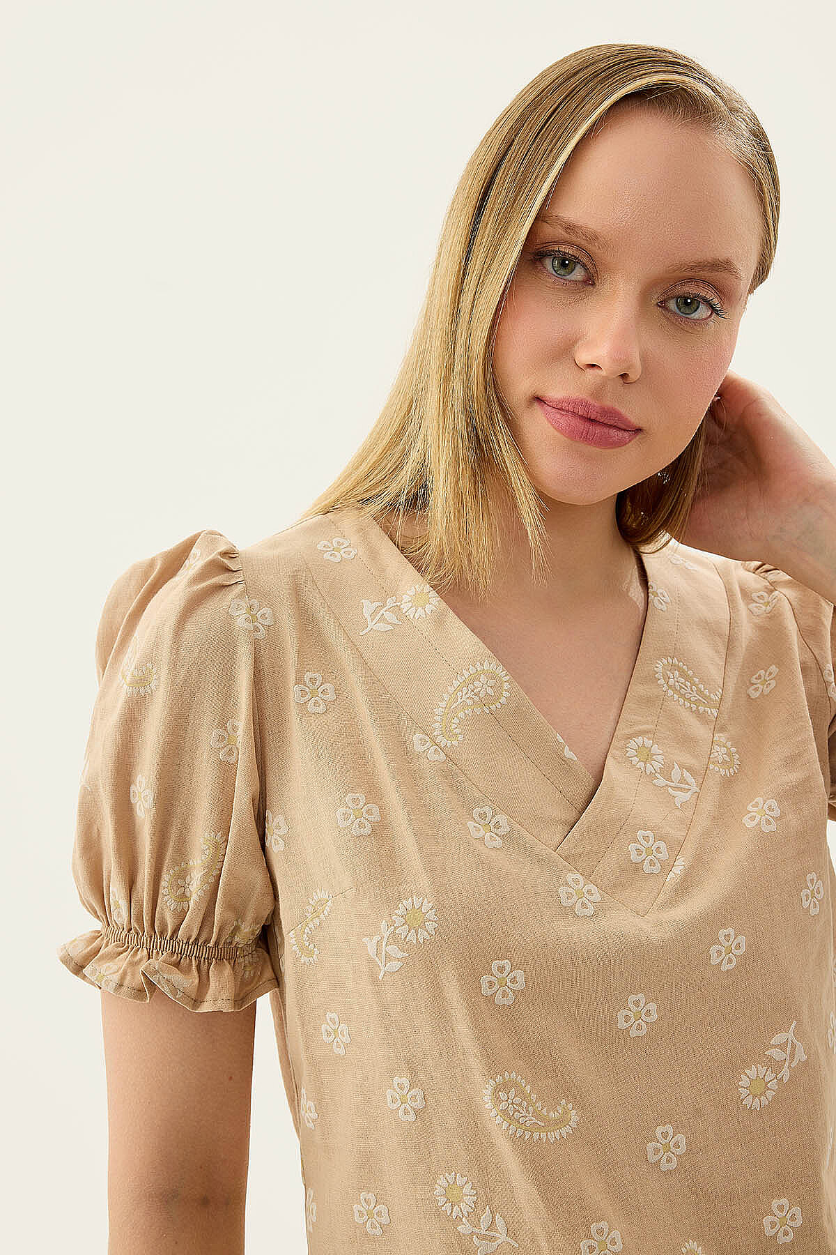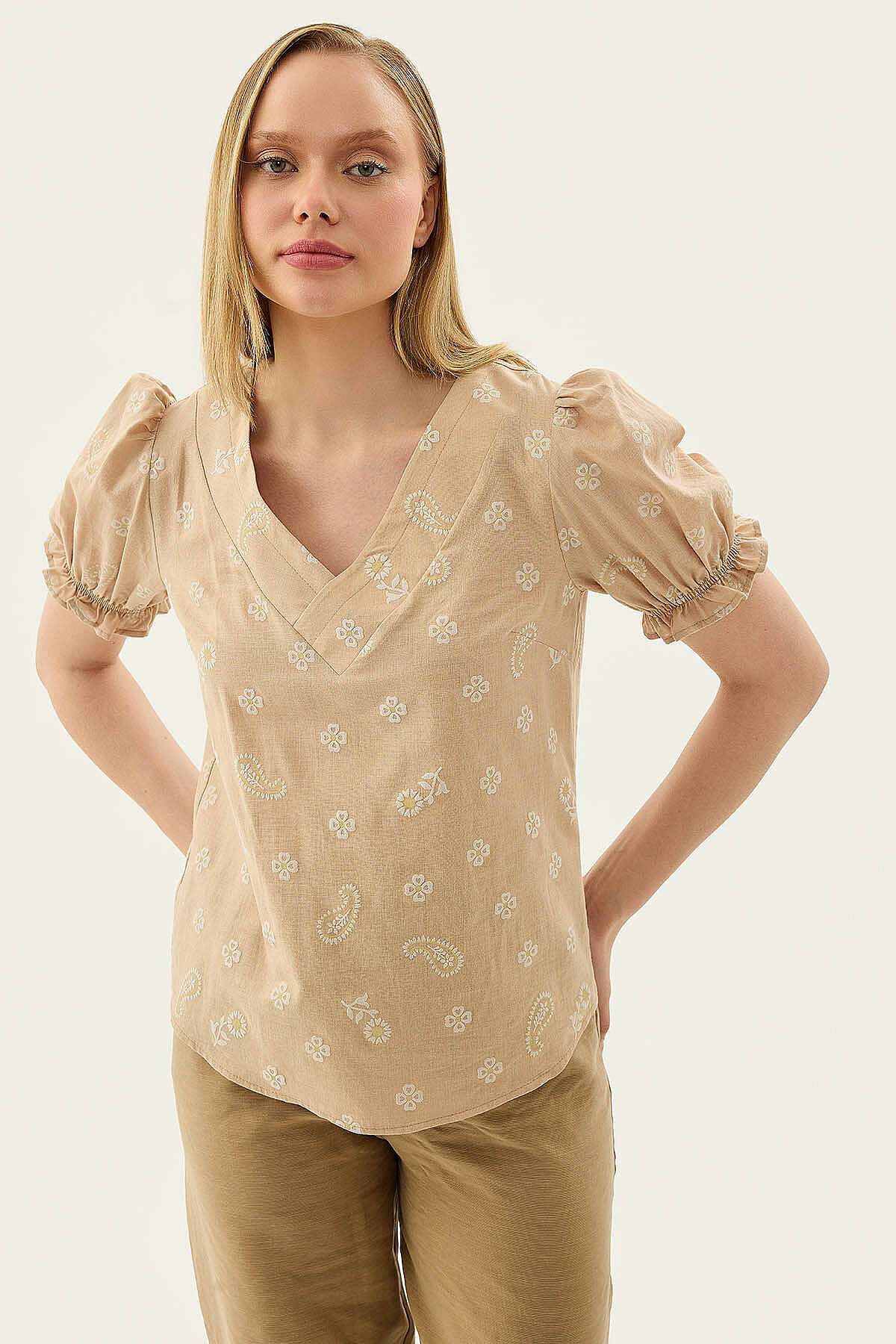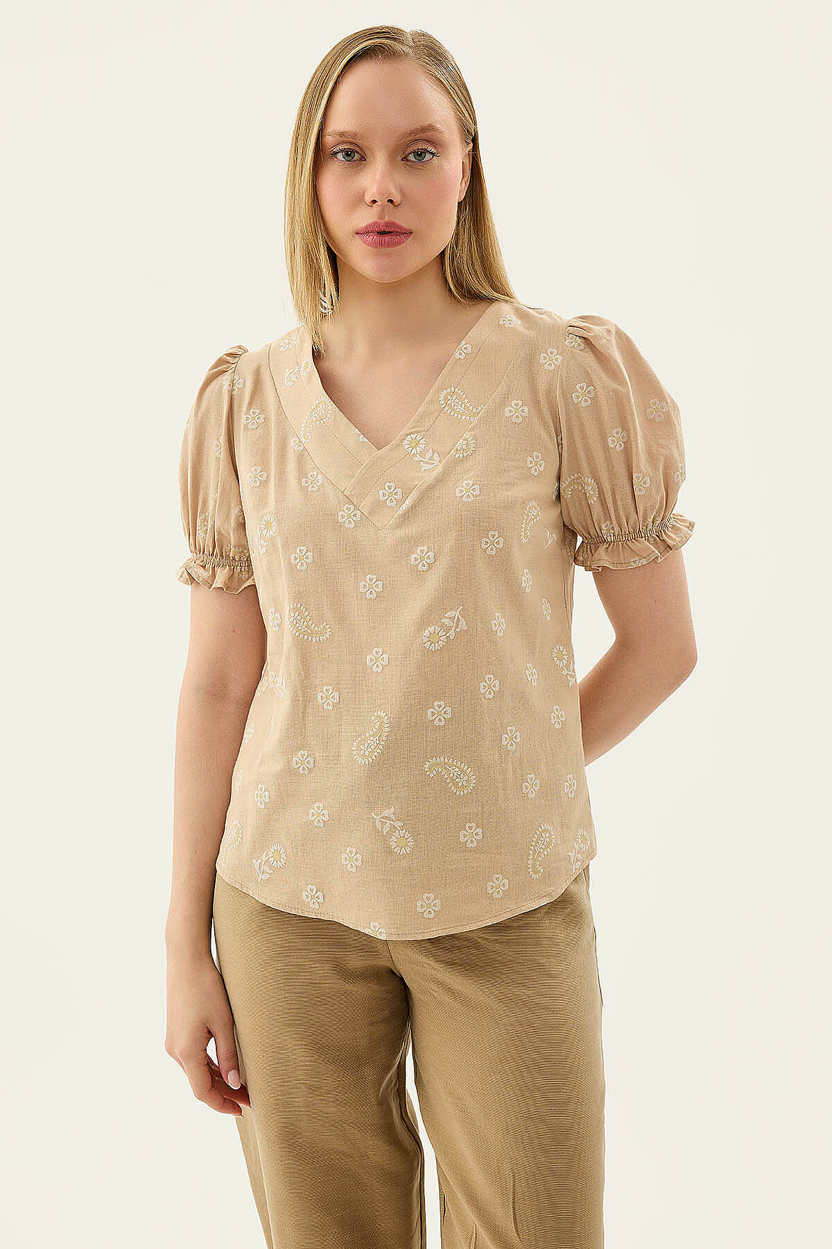 Çiçek Desenli V Yaka Balon Kol Bluz Bej