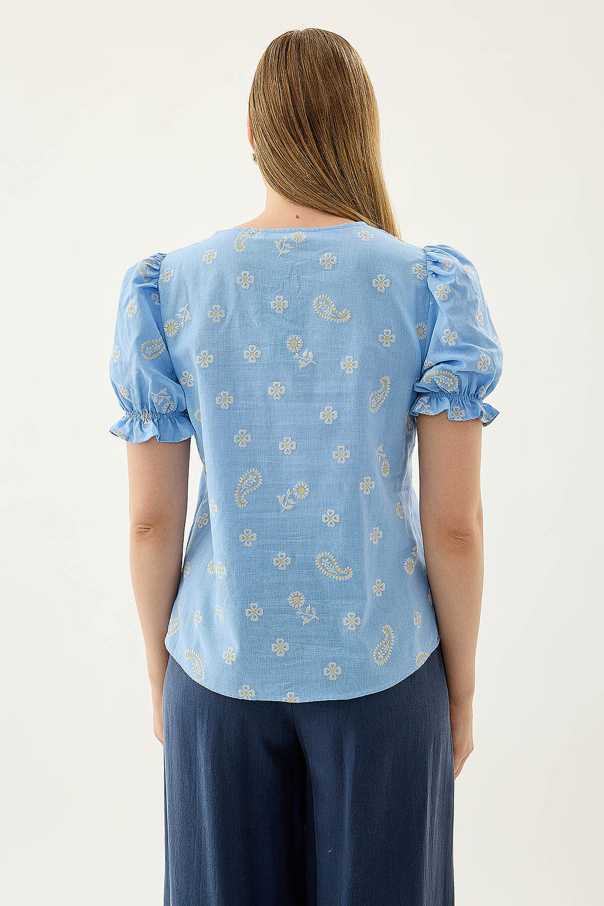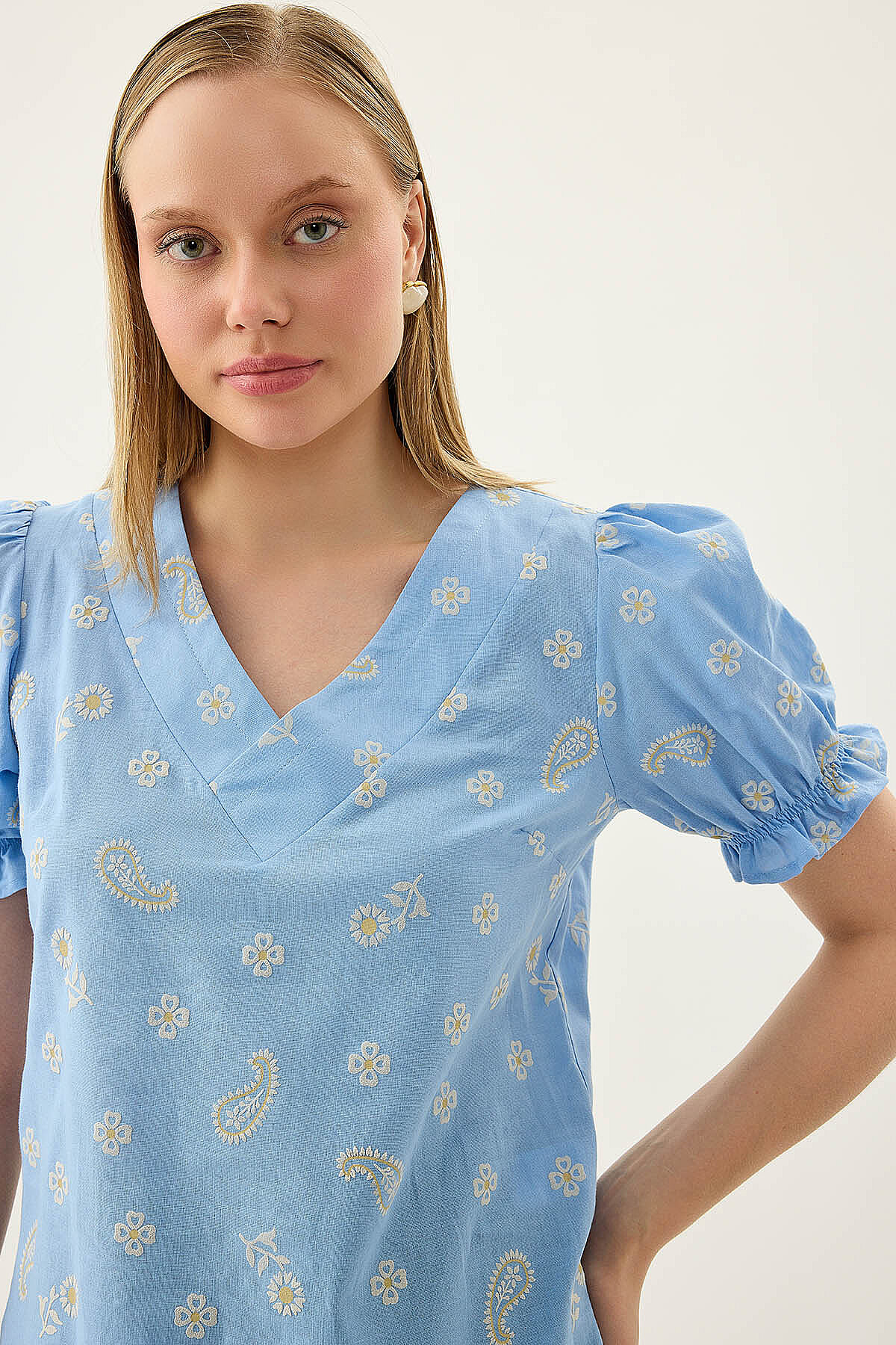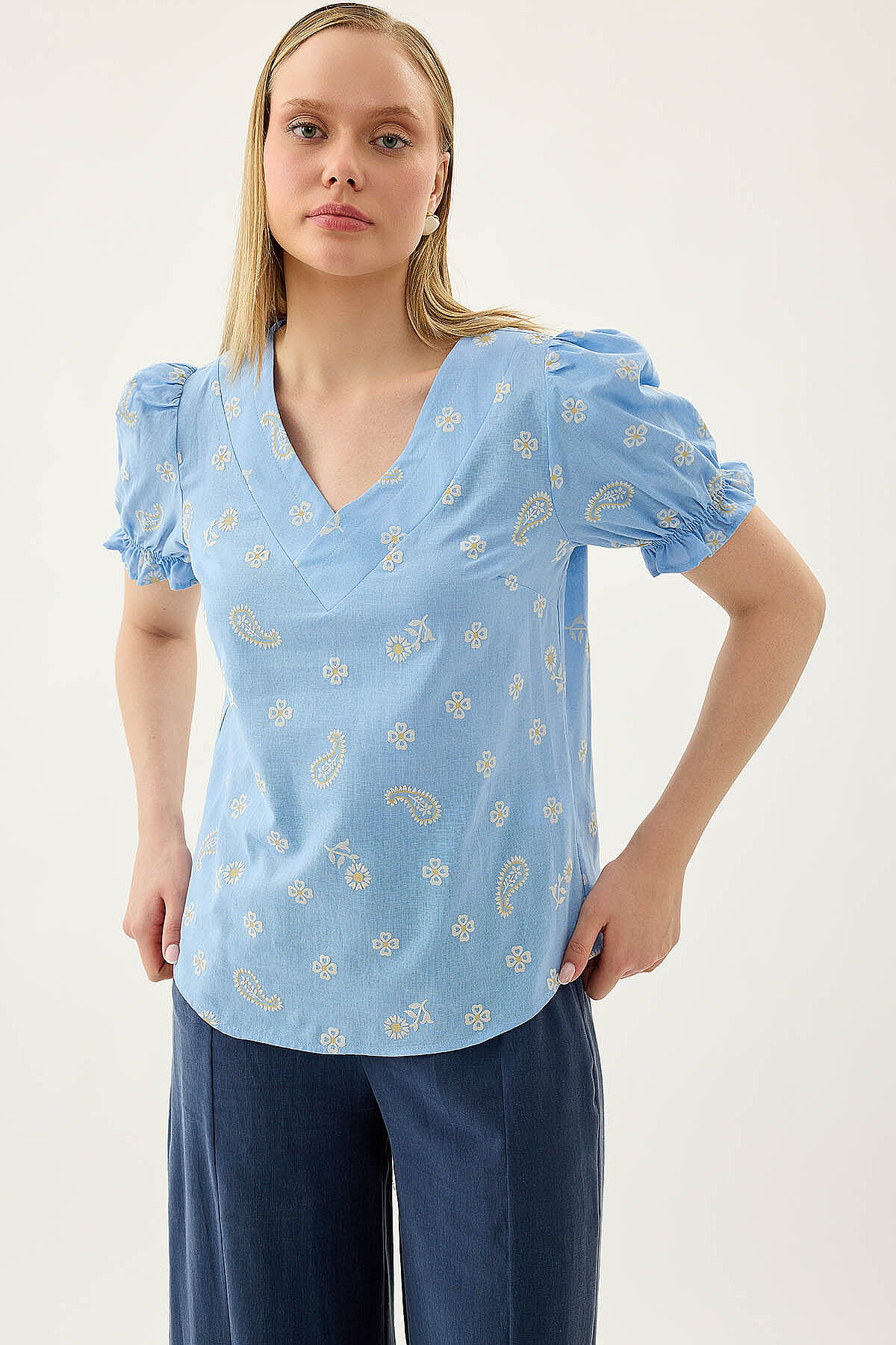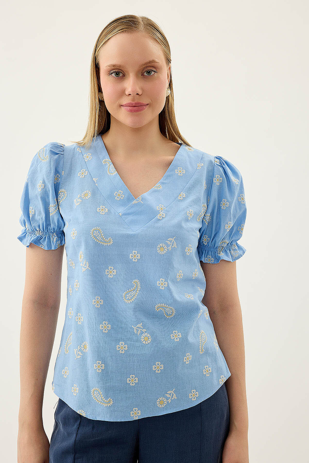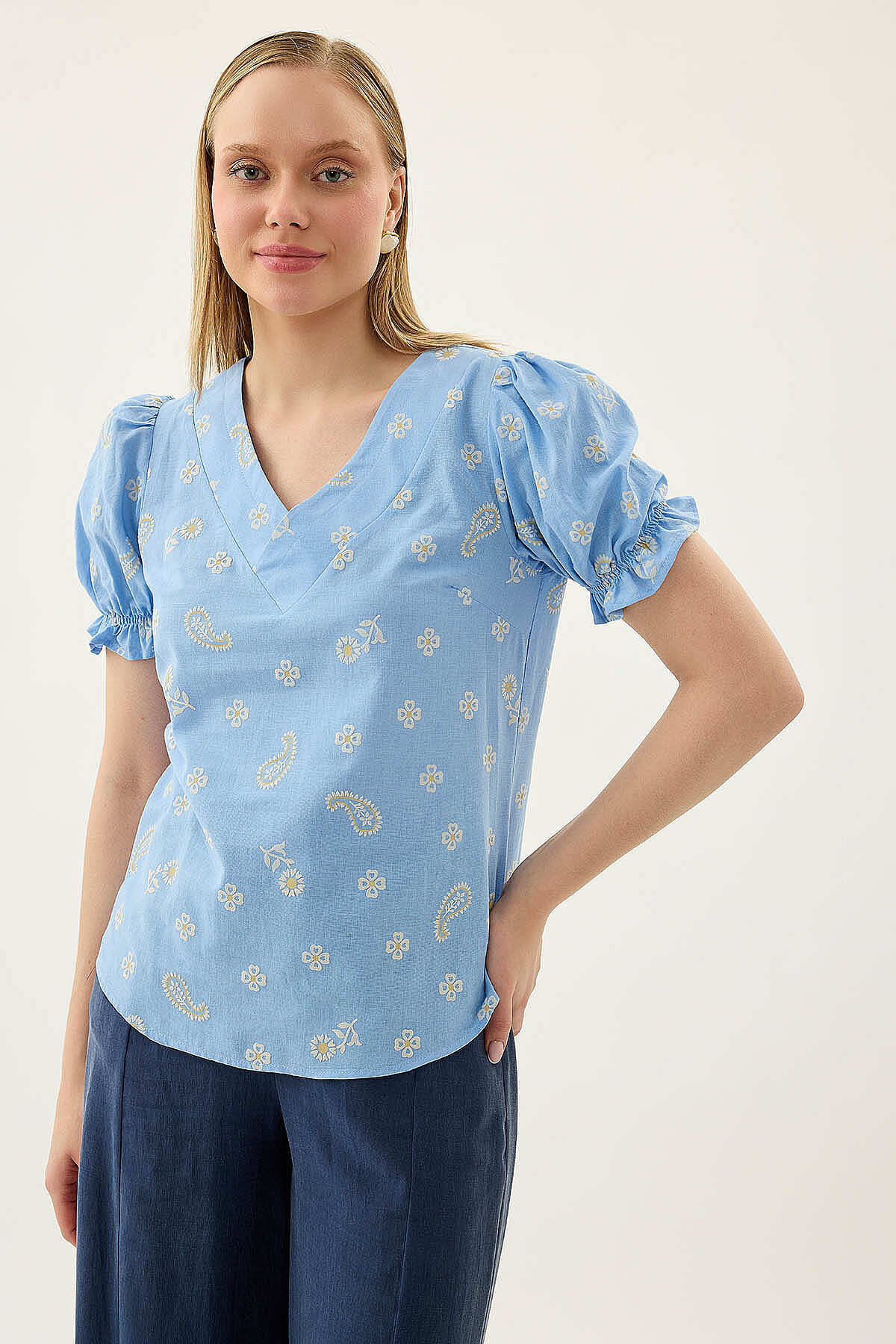 Çiçek Desenli V Yaka Balon Kol Bluz Mavi