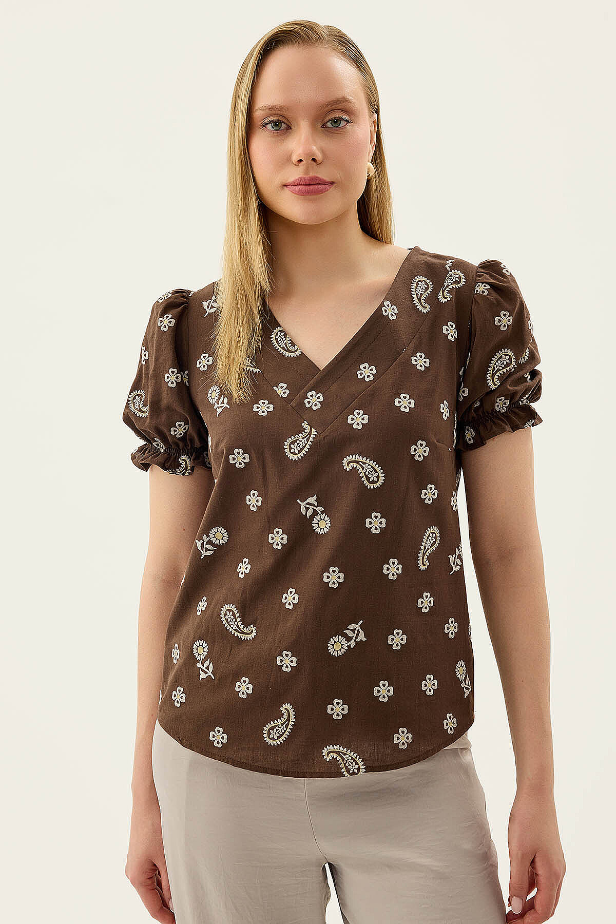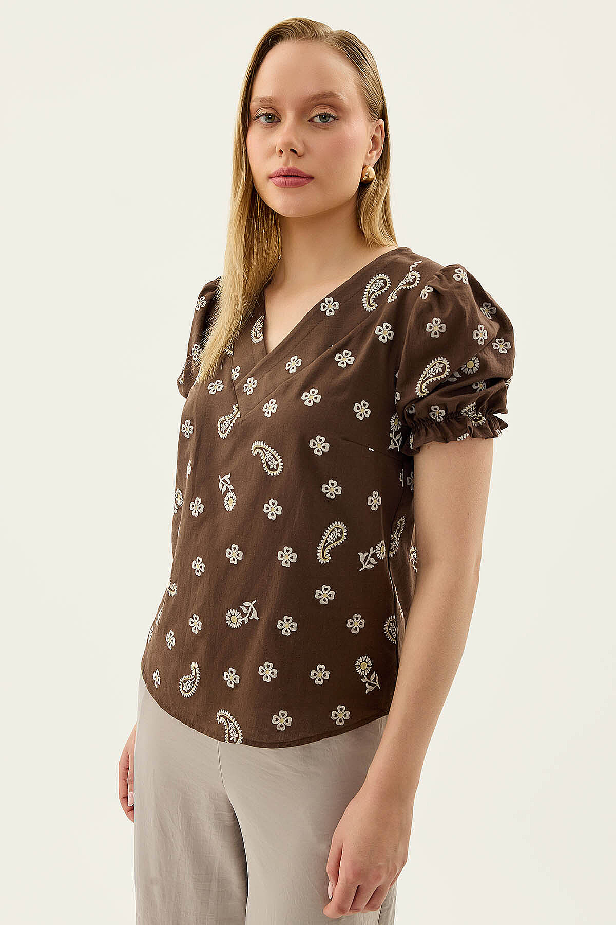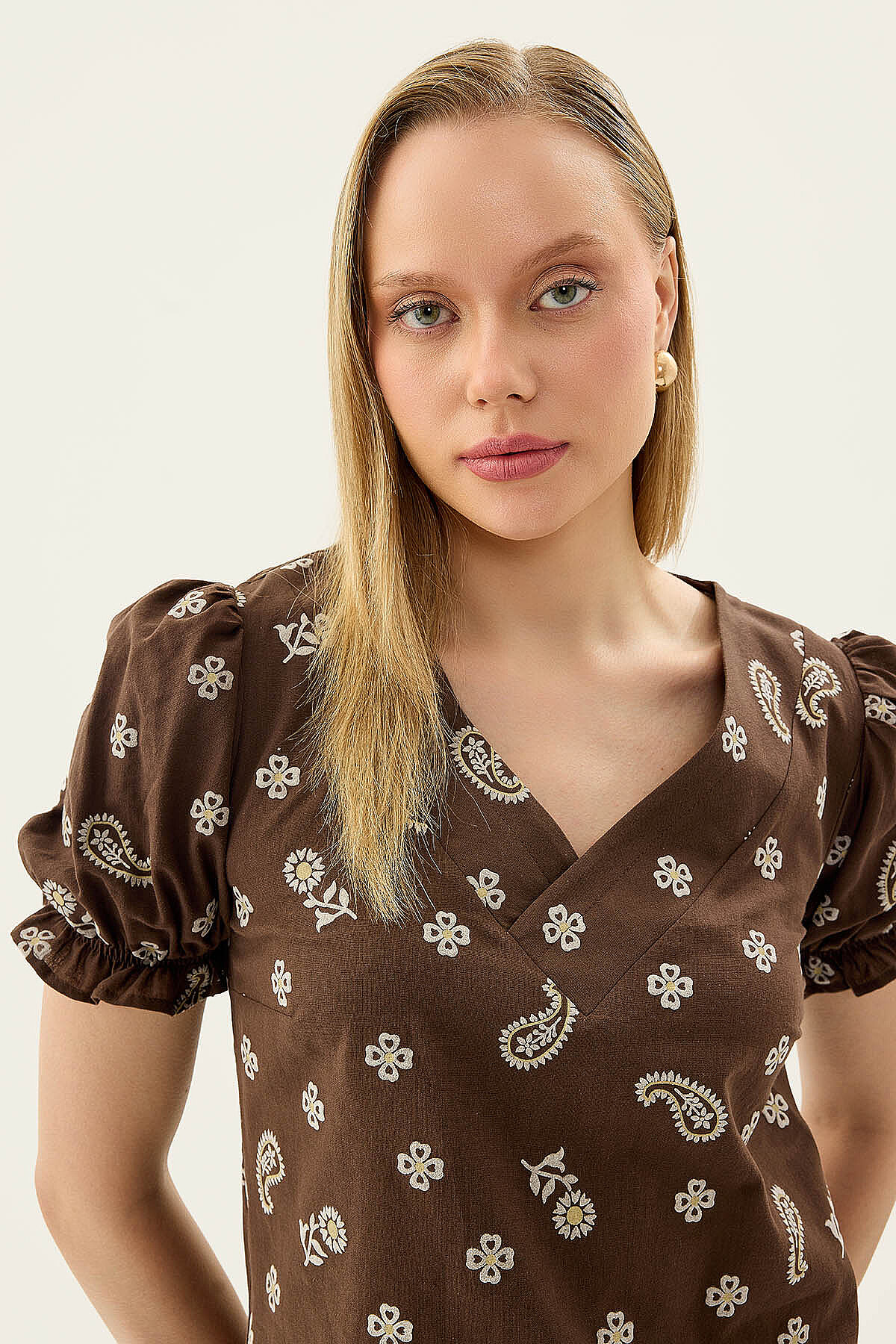 Çiçek Desenli V Yaka Balon Kol Bluz Kahve