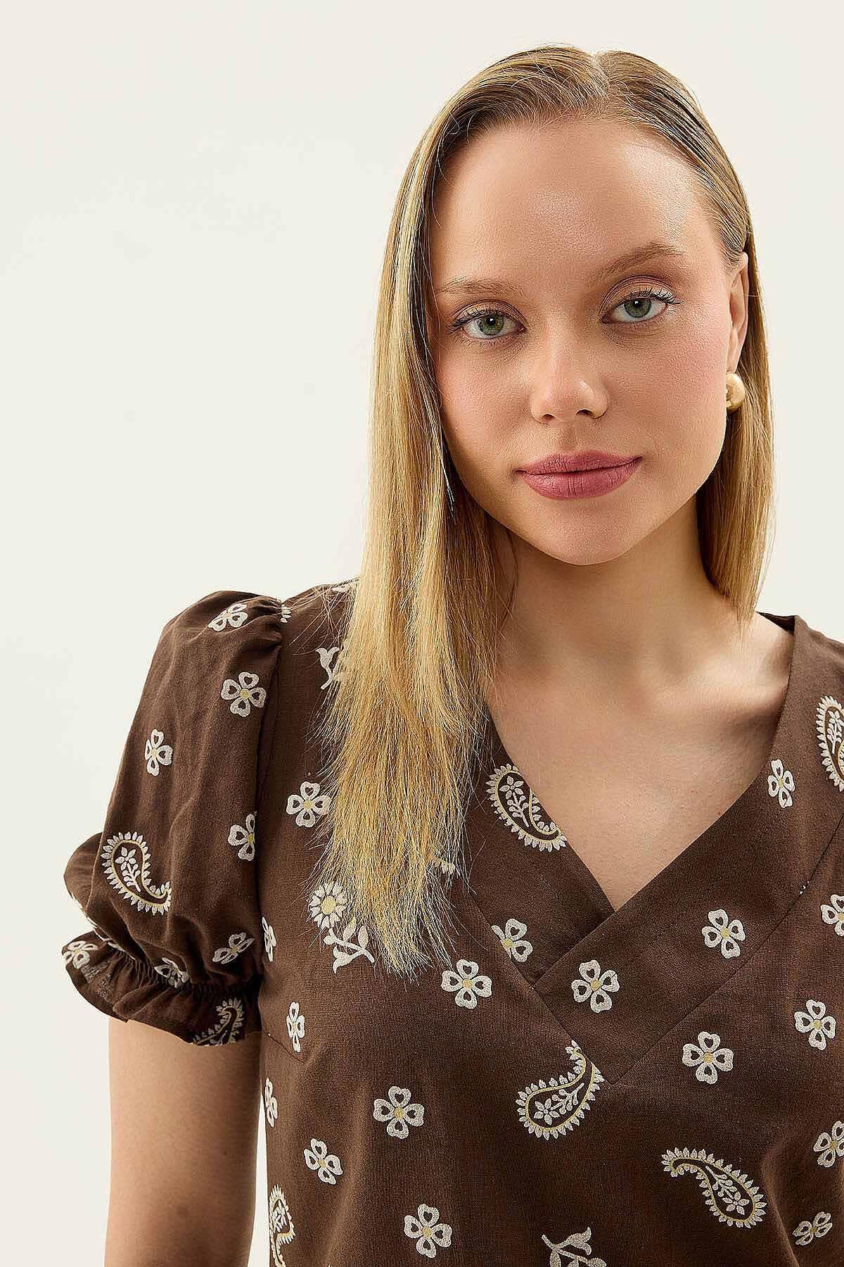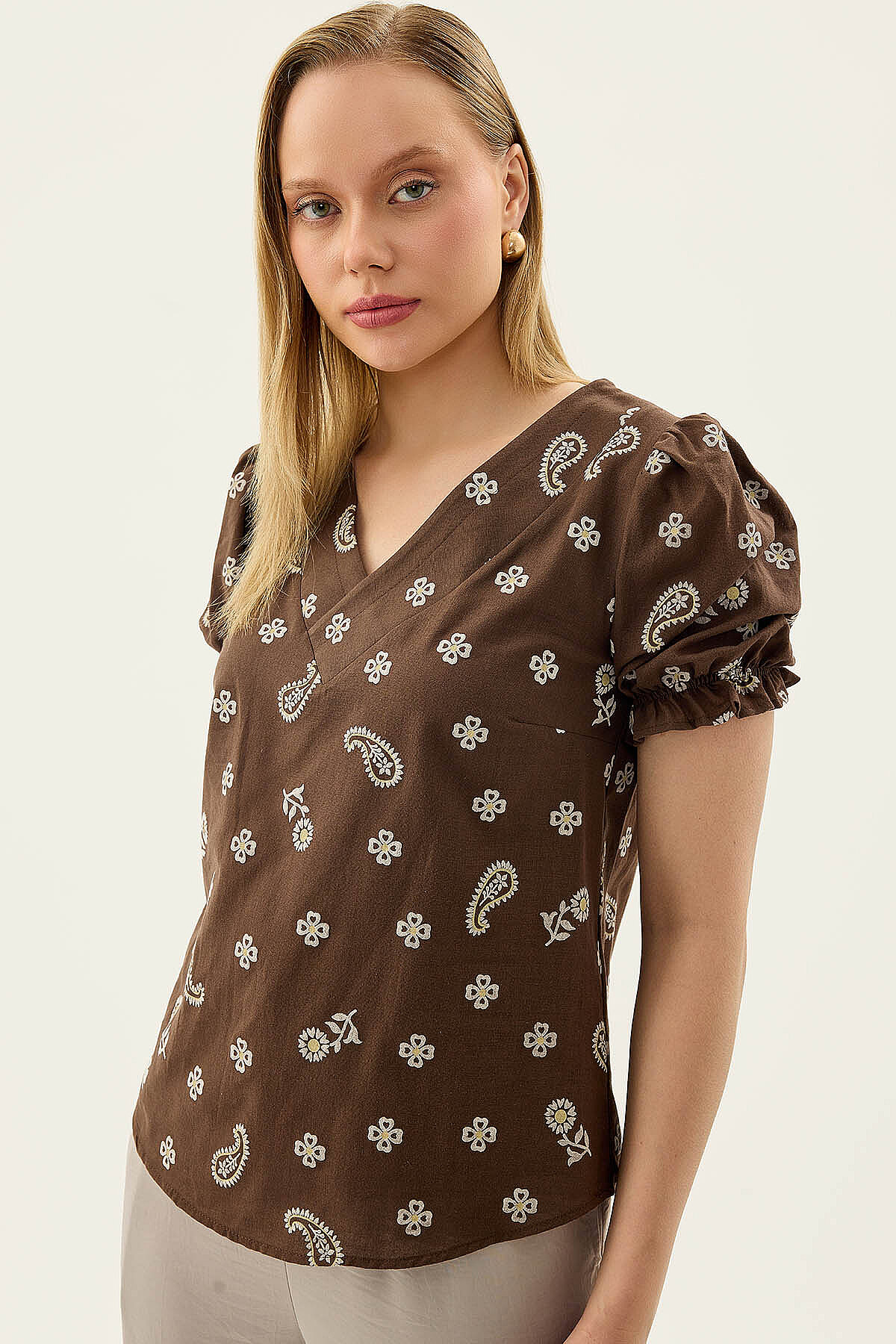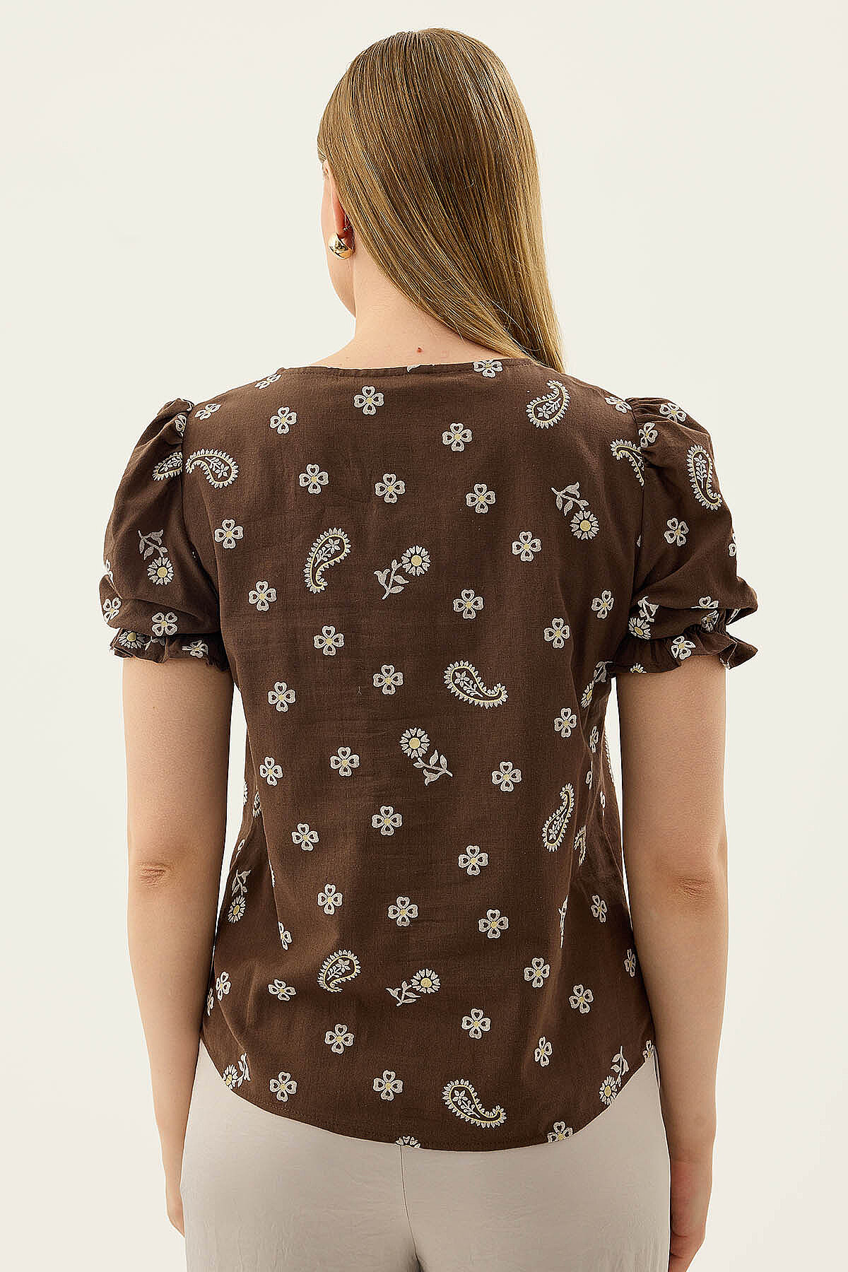 Çiçek Desenli V Yaka Balon Kol Bluz Kahve