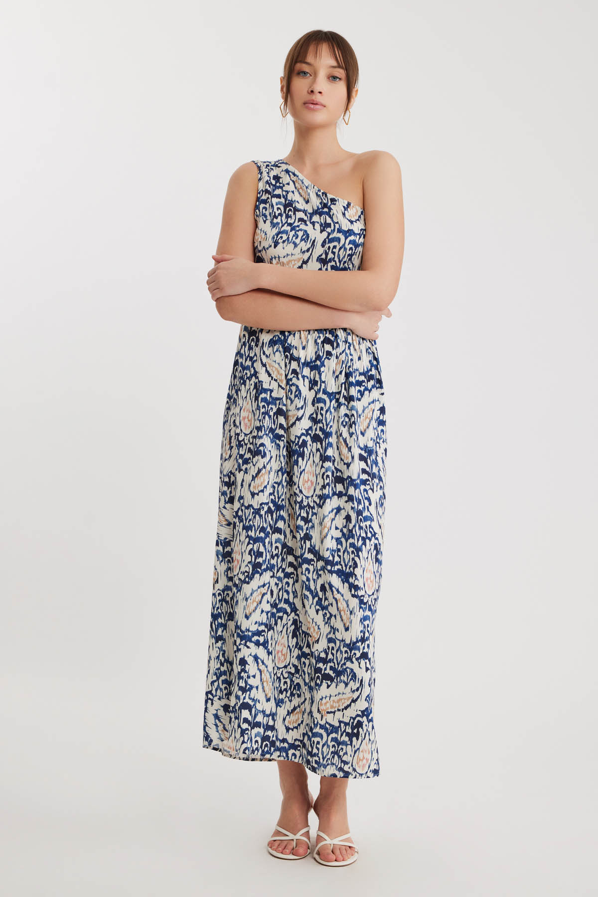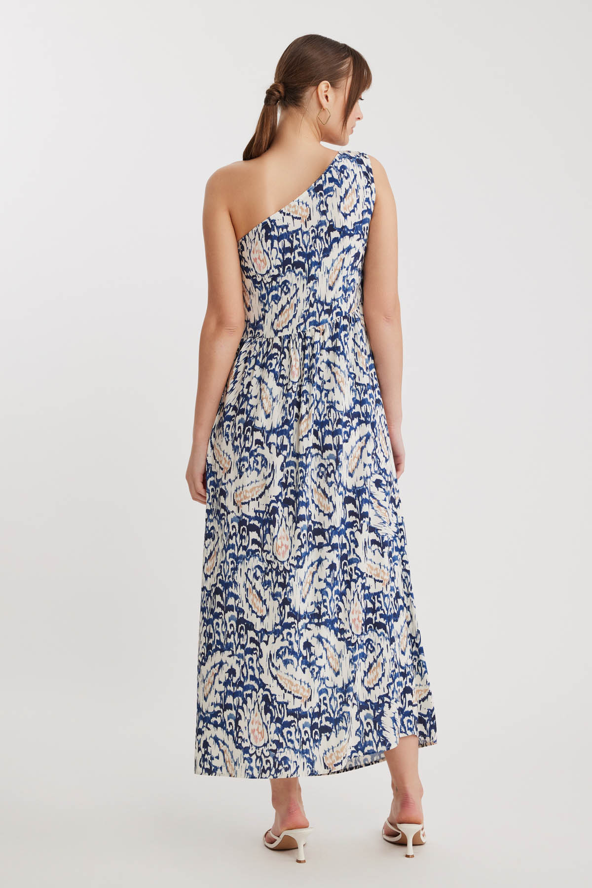 Desenli Tek Omuz Uzun Elbise