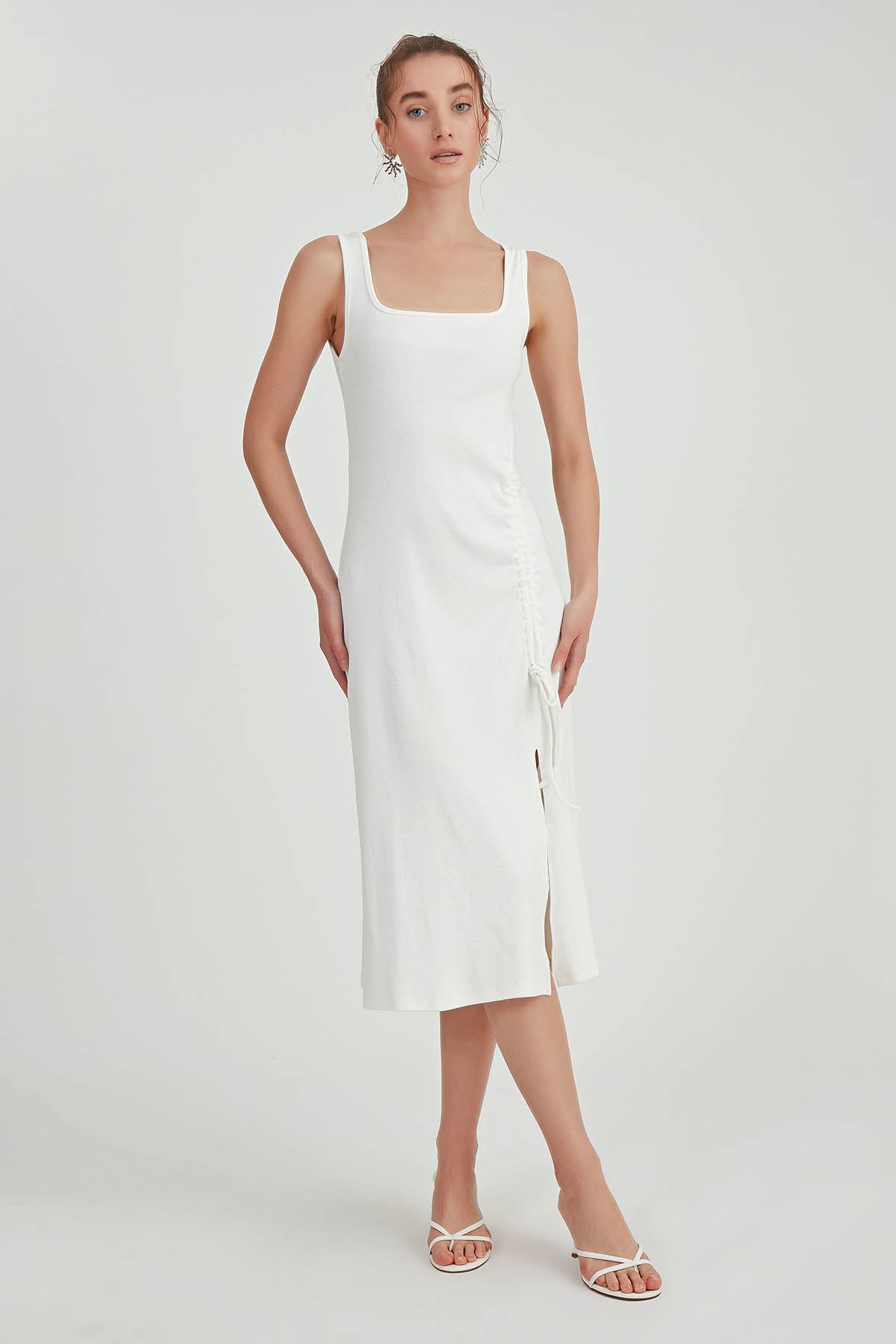 Kalın Askılı Önü Büzgülü Yırtmaçlı Örme Elbise