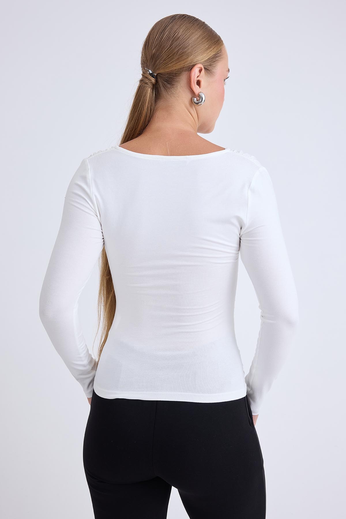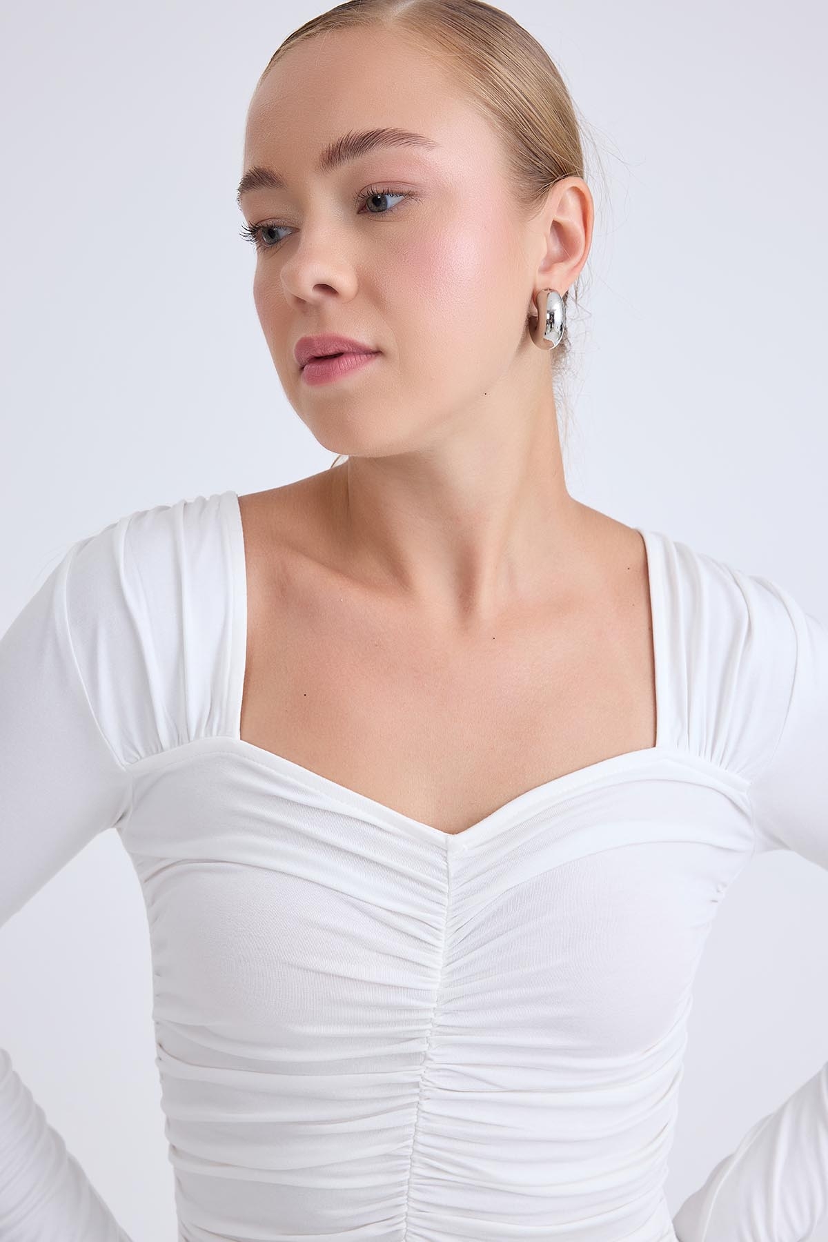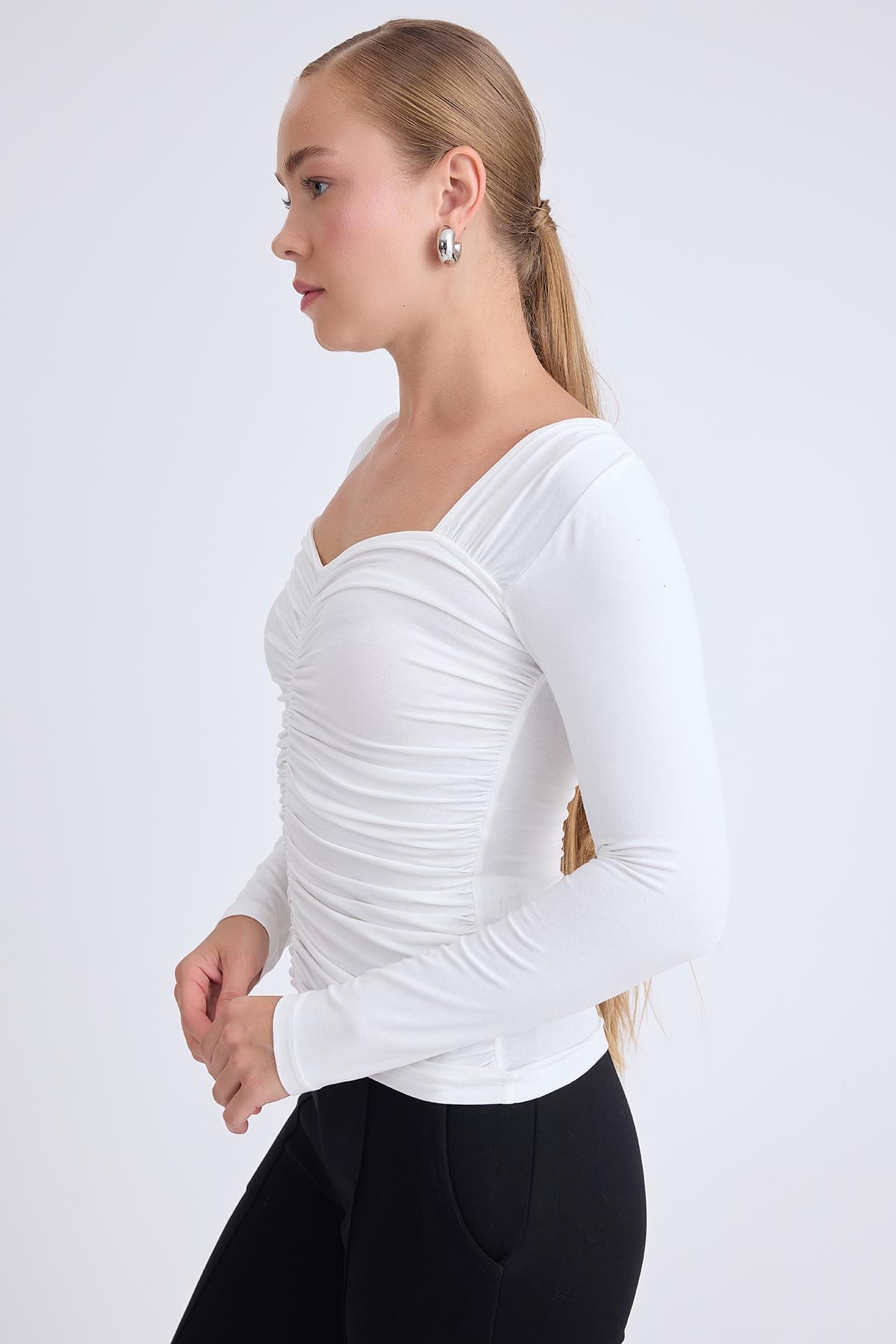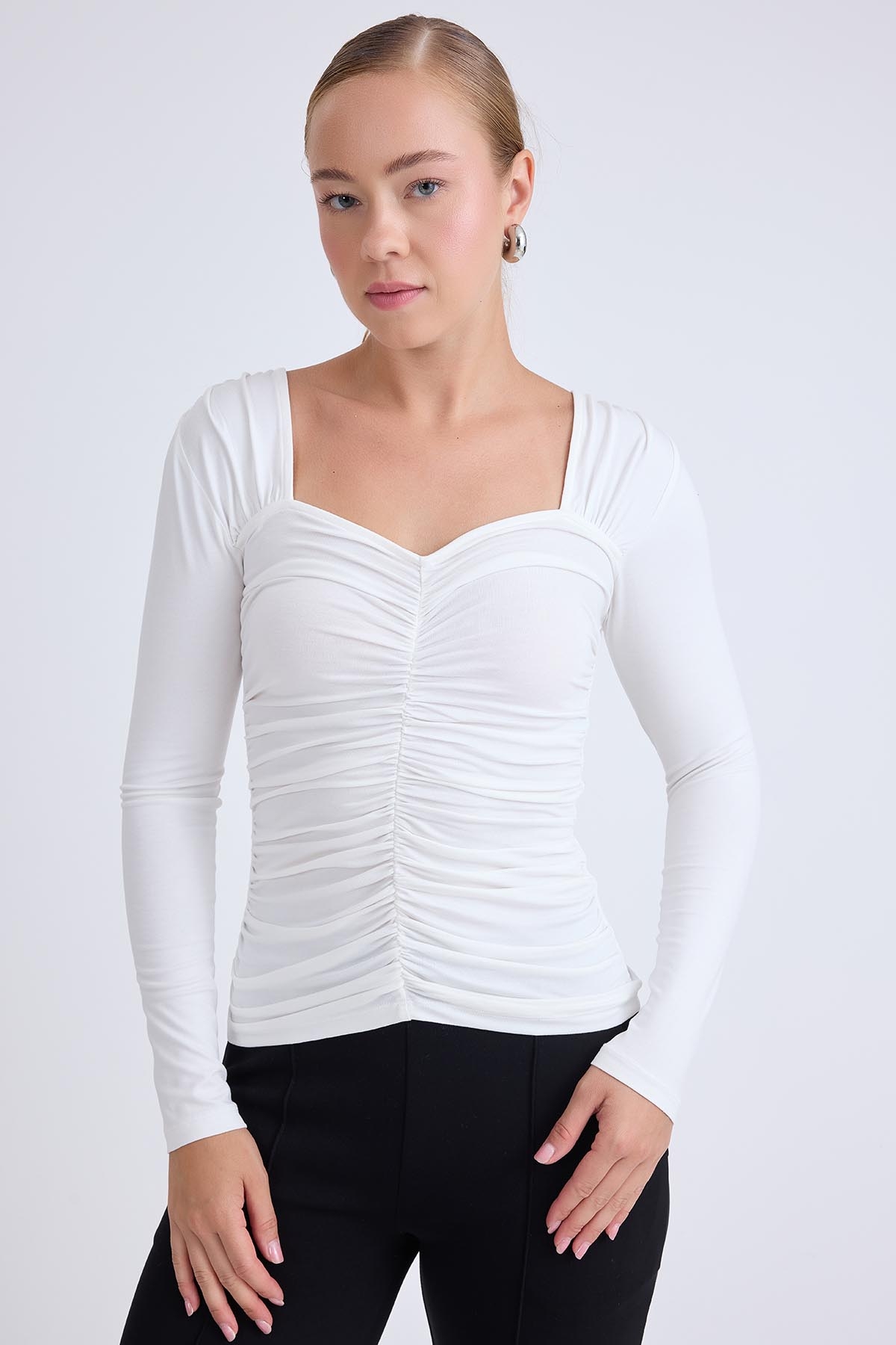 Kalp Yaka Önü Büzgülü Uzun Kol Bluz