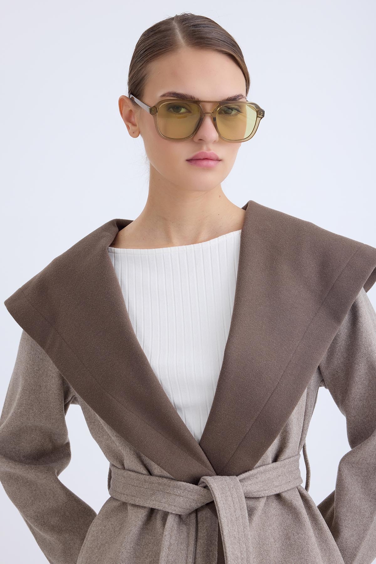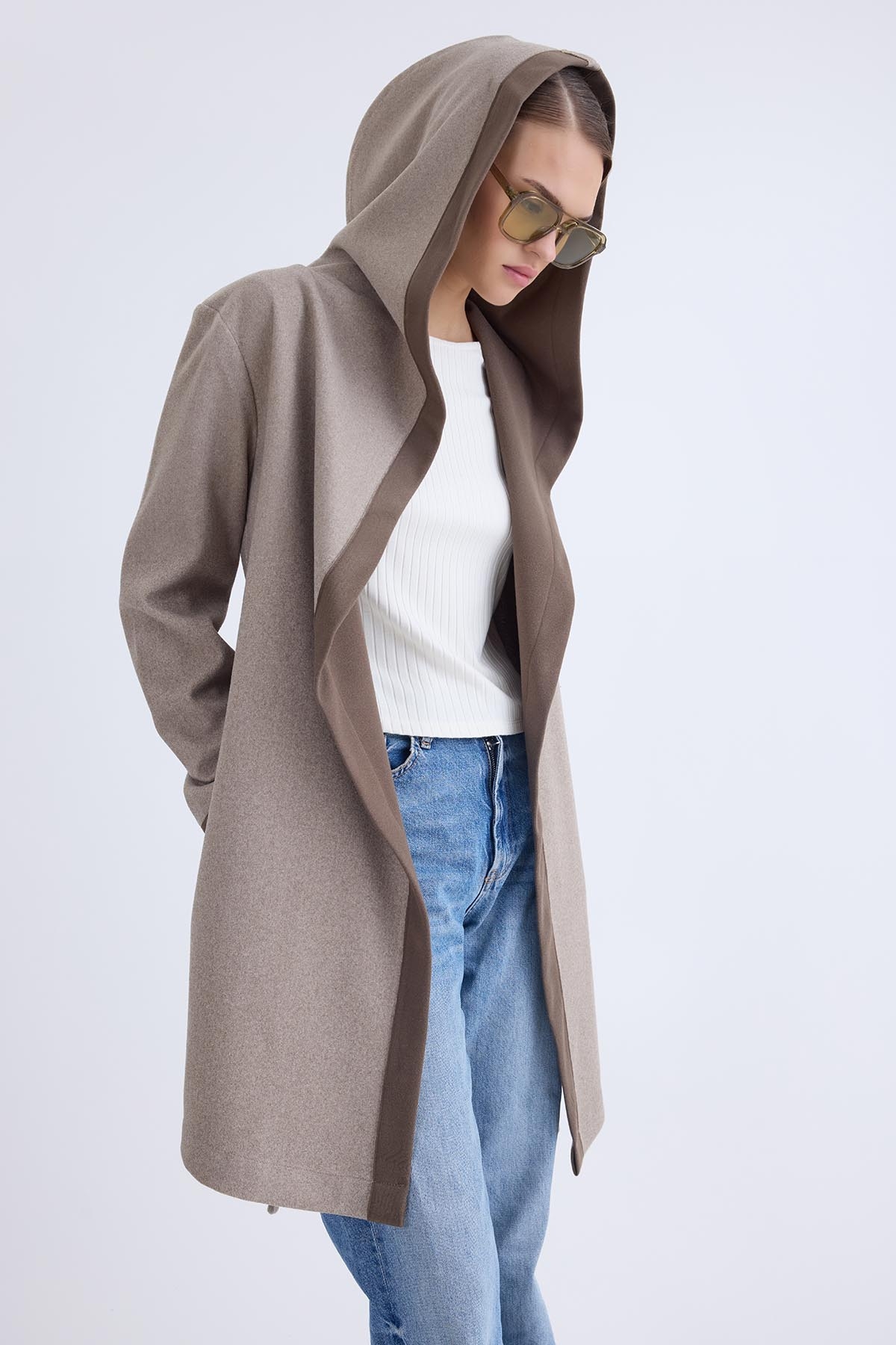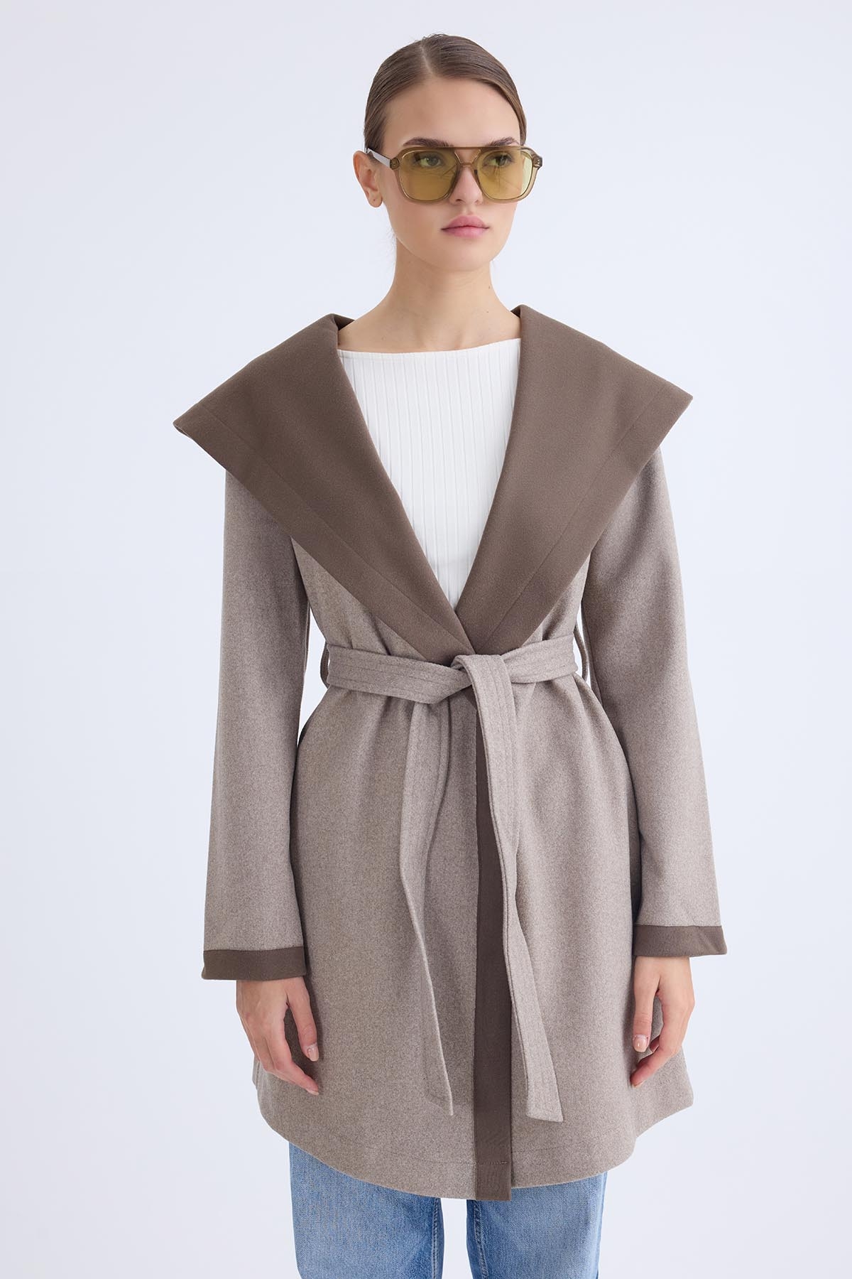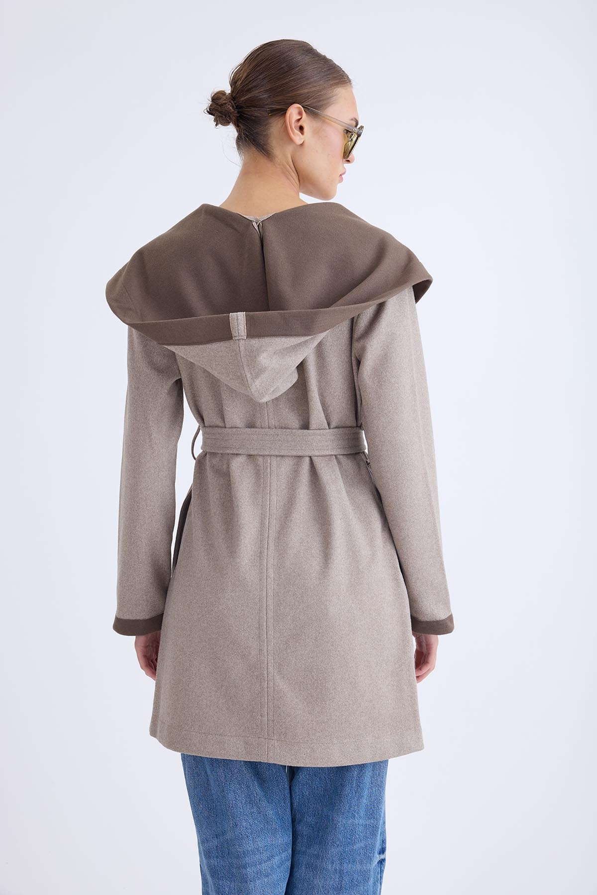 Kapüşonlu Beli Kuşaklı Kaşe Kaban