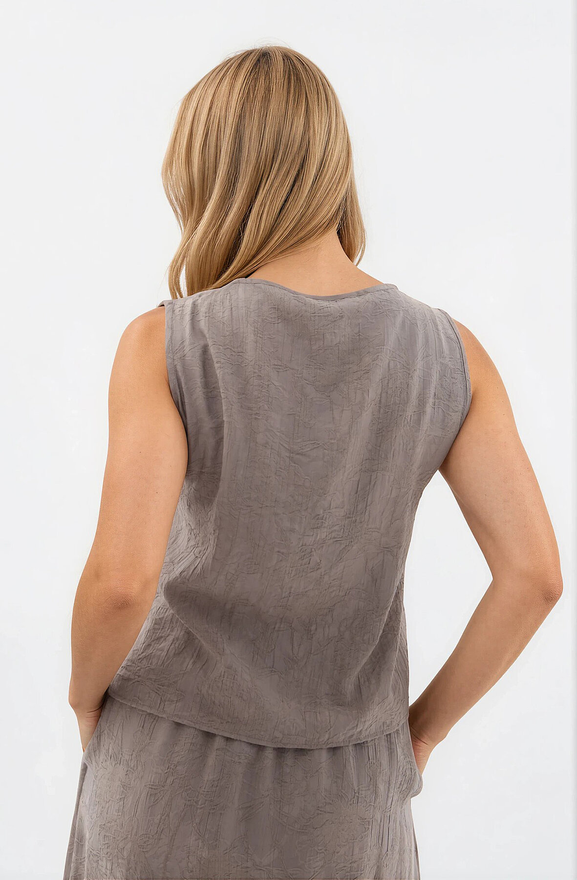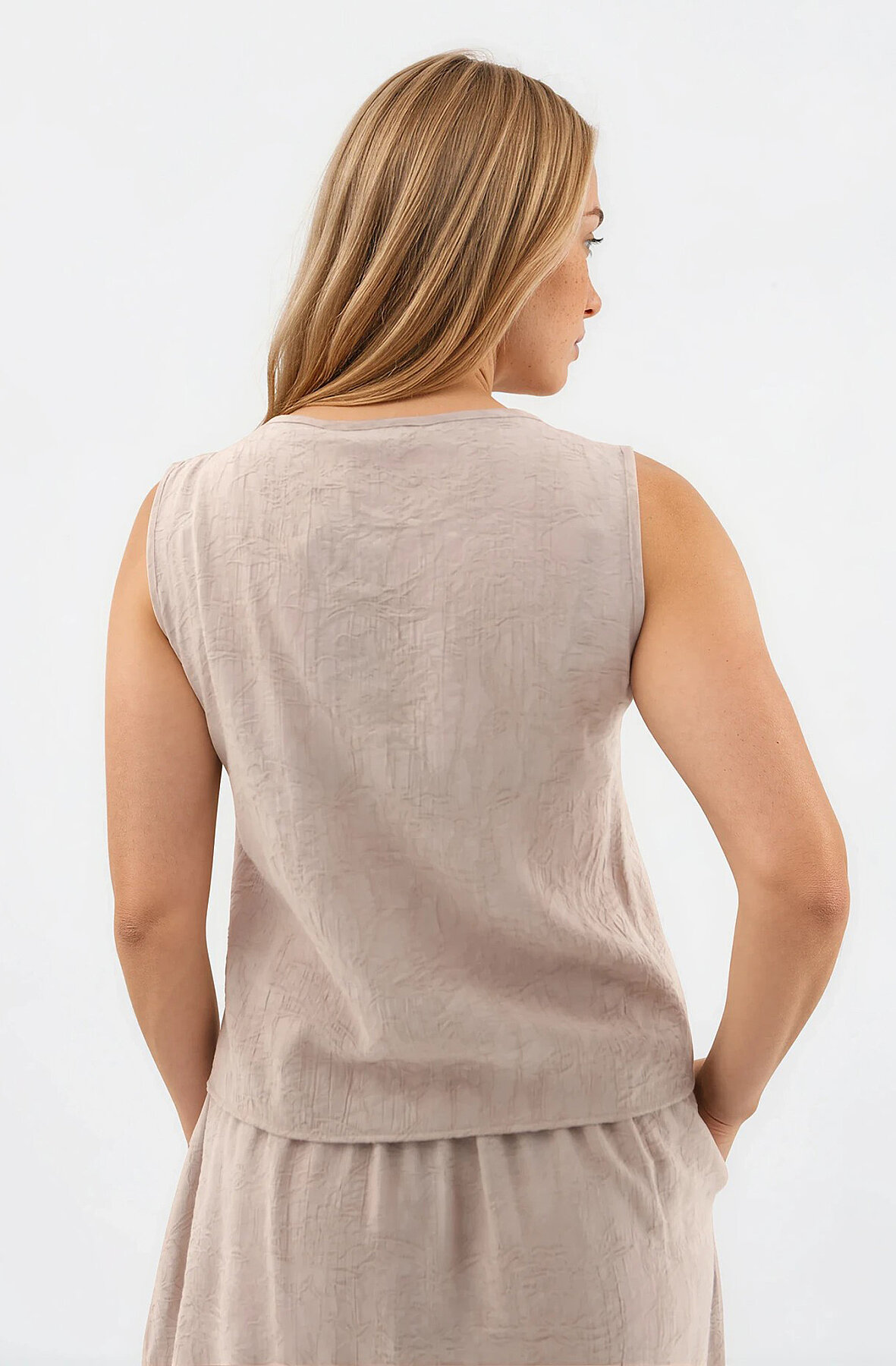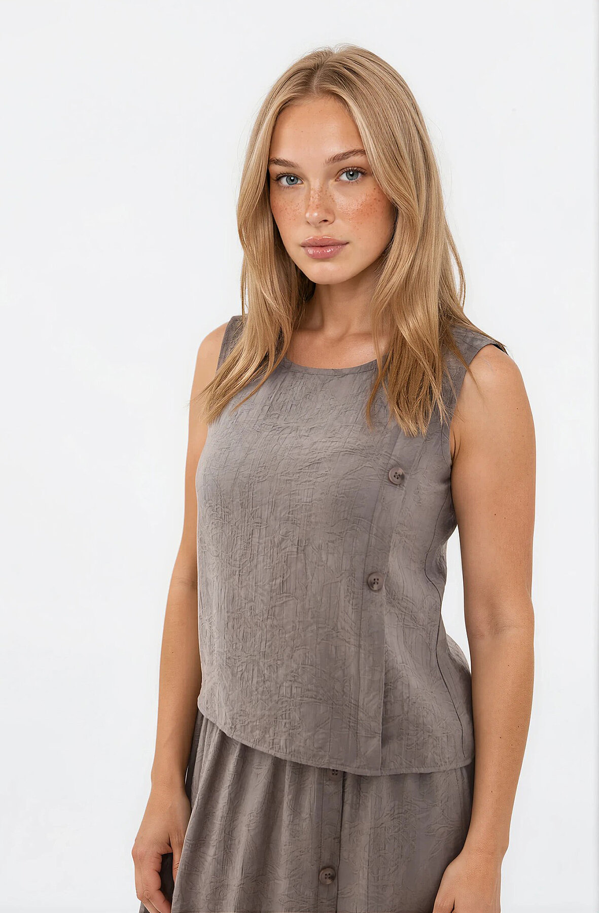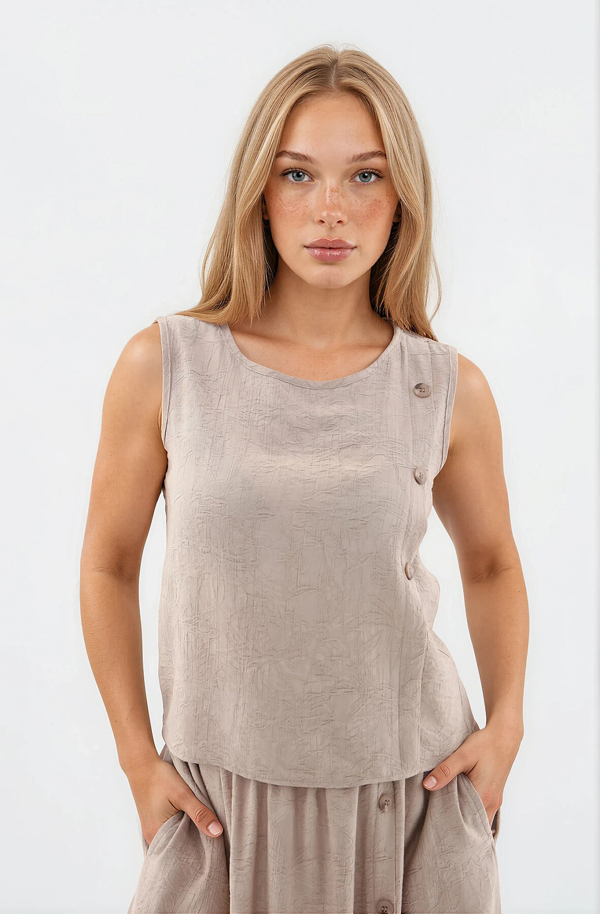 Kendinden Desenli Düğmeli Bluz Vizon