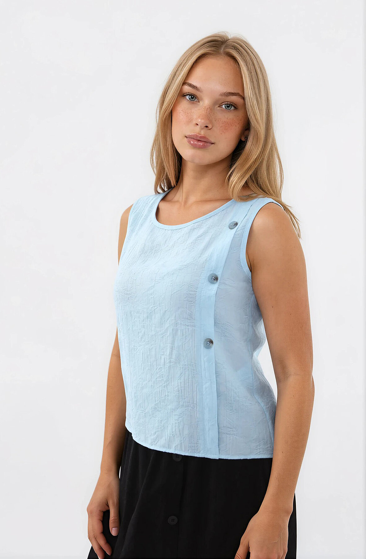 Kendinden Desenli Düğmeli Bluz Mavi