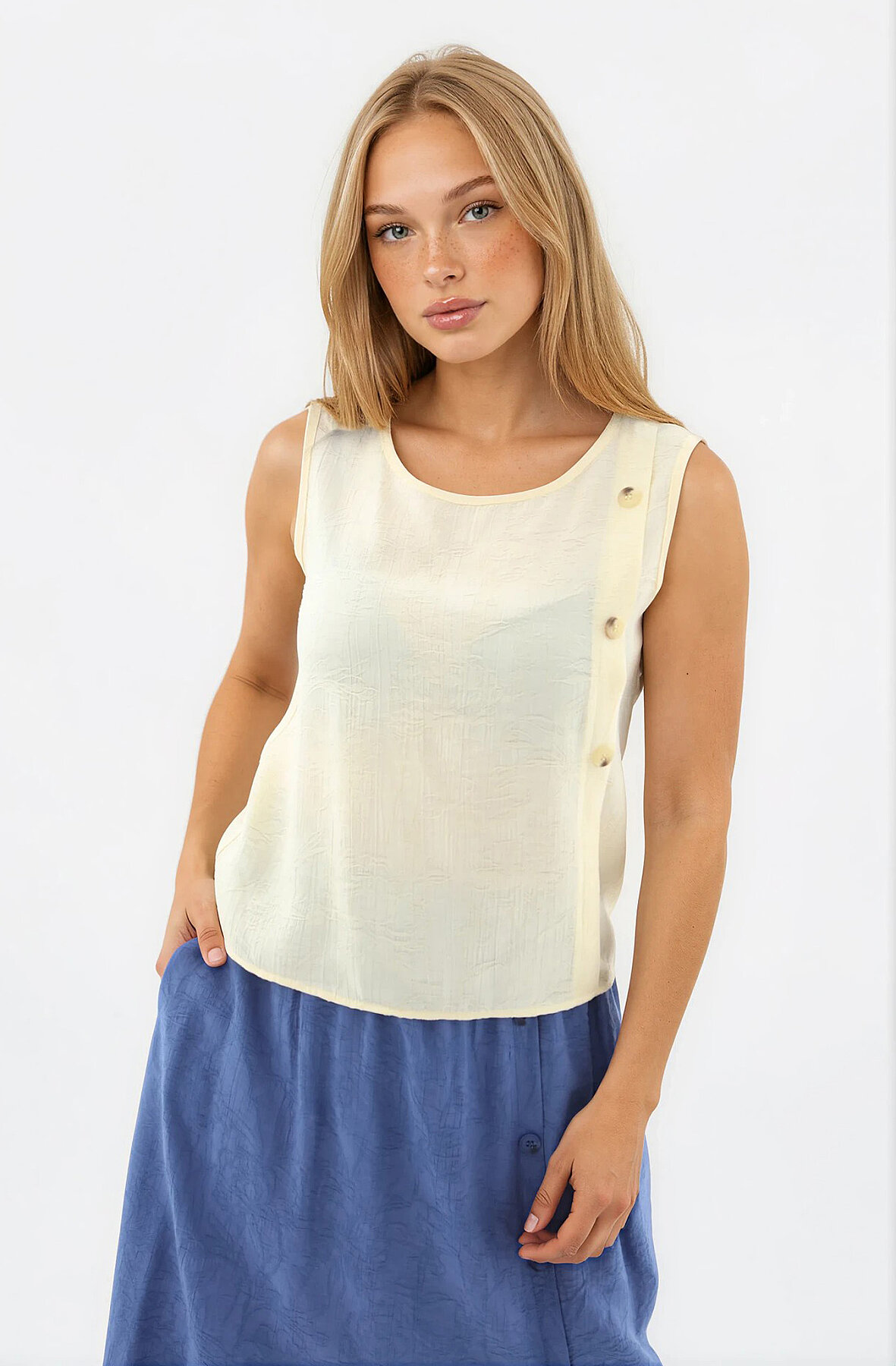 Kendinden Desenli Düğmeli Bluz Ekru