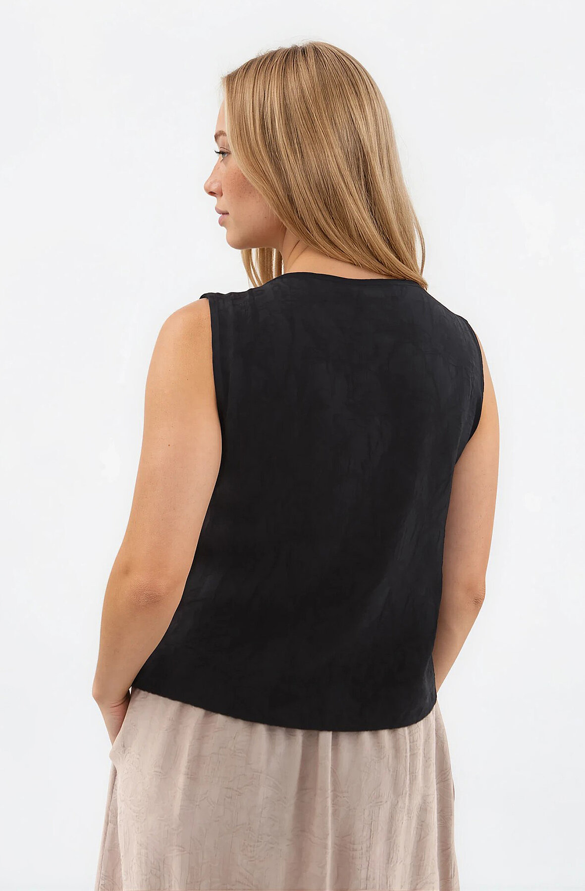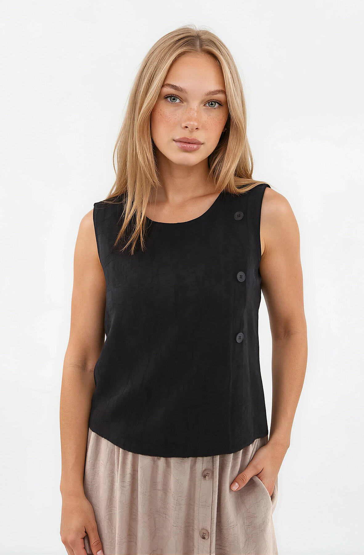 Kendinden Desenli Düğmeli Bluz Siyah