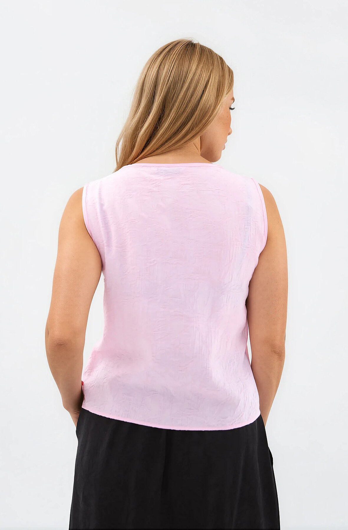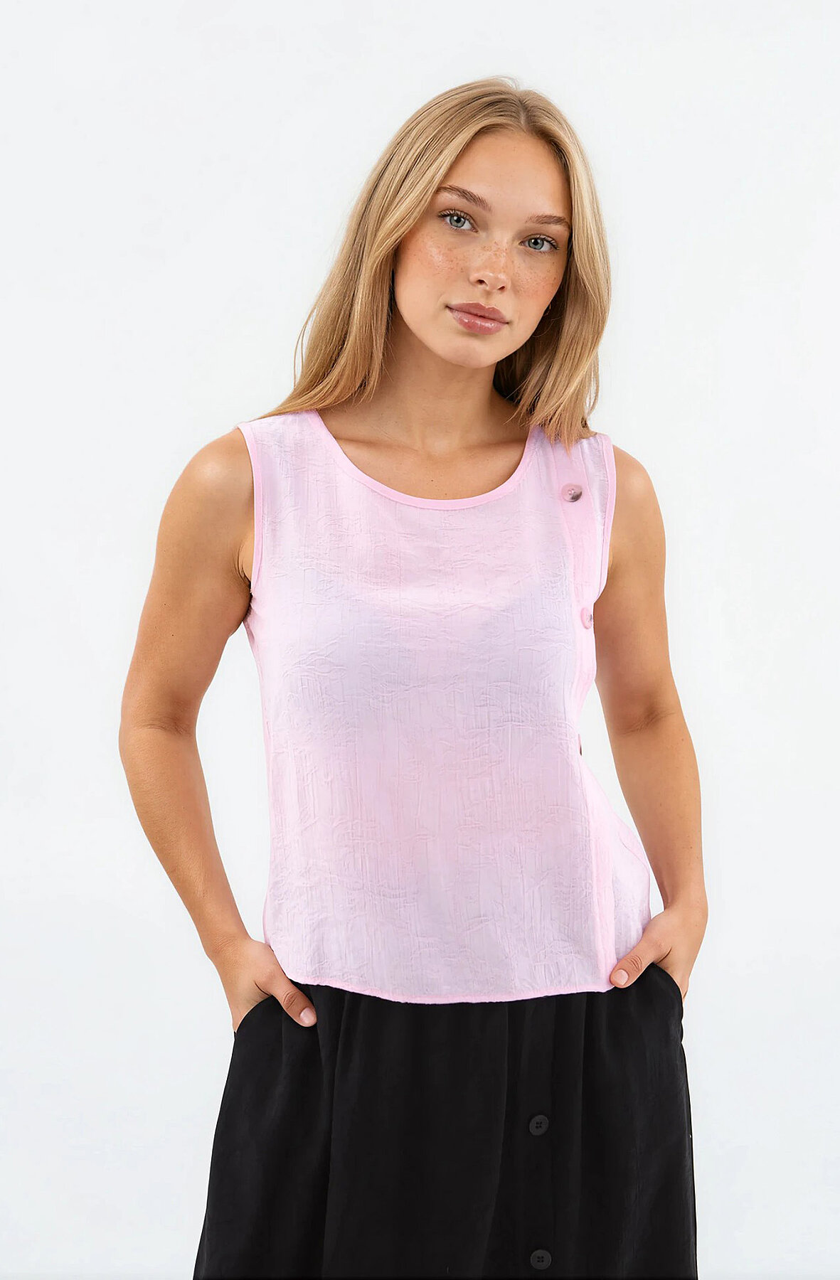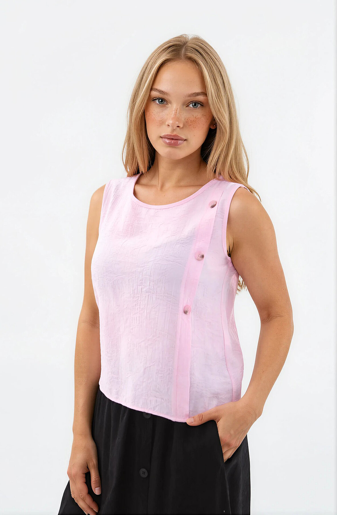 Kendinden Desenli Düğmeli Bluz Pembe