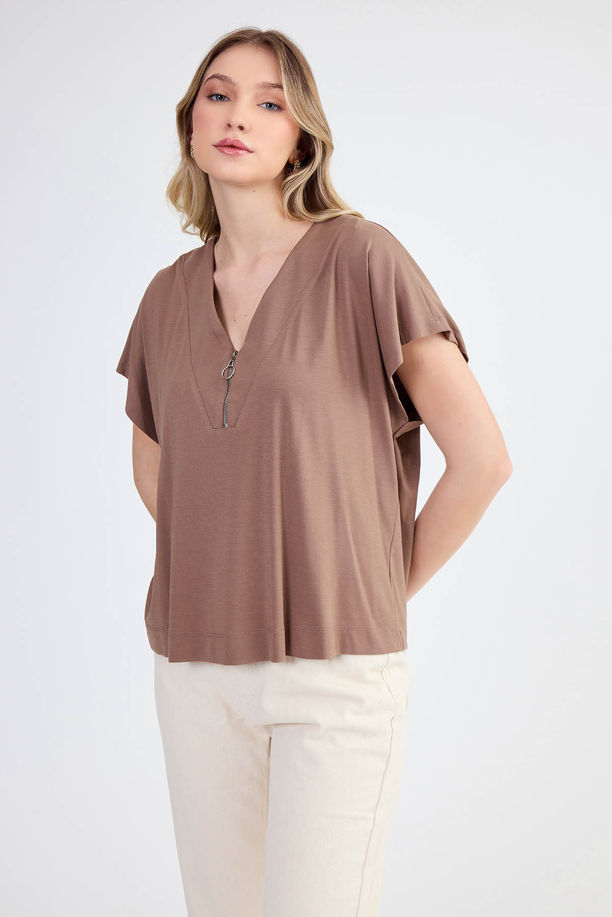 Modal Kumaş Önü Fermuarlı Kısa Kol Bluz