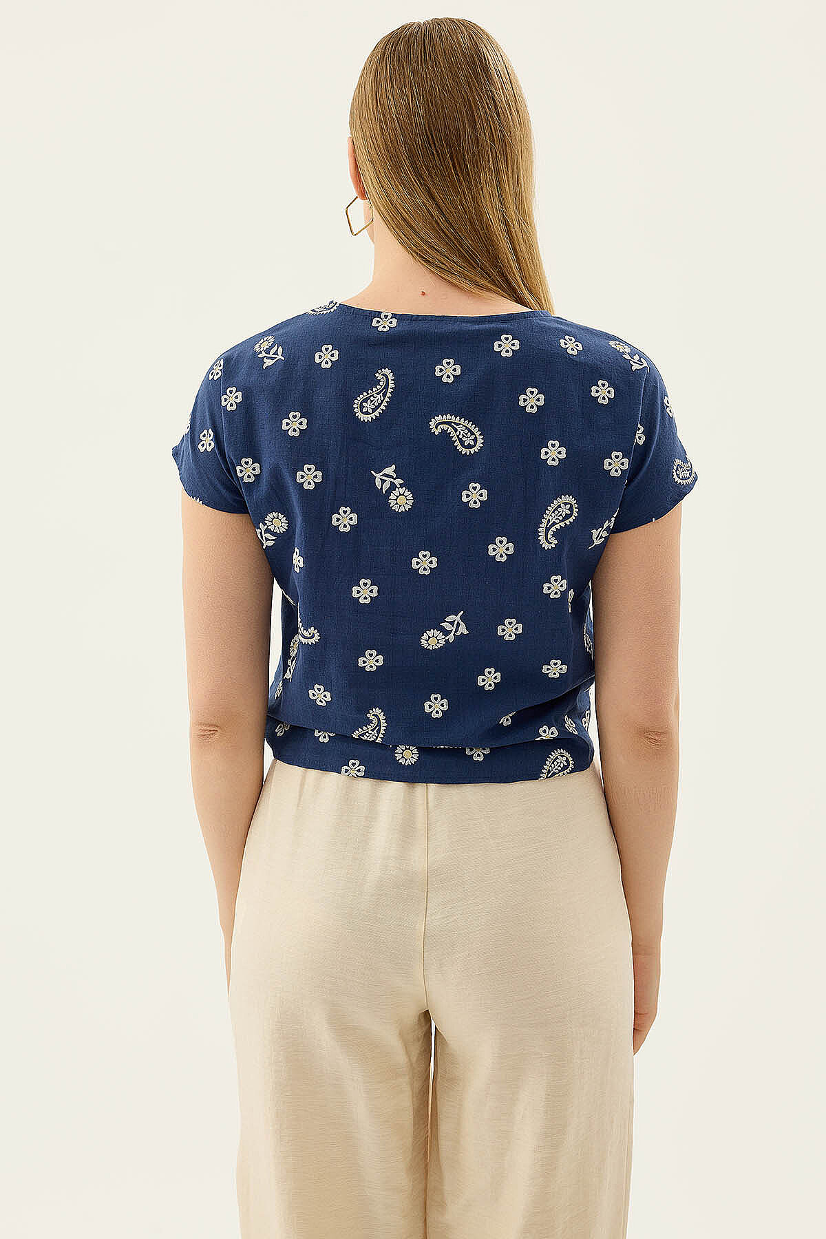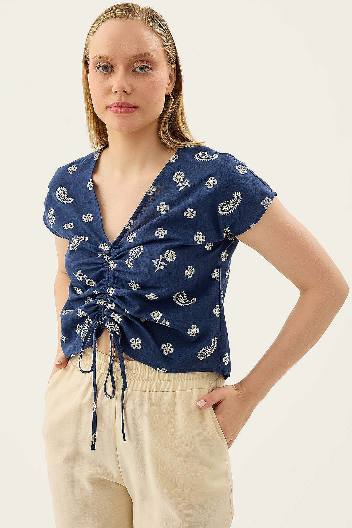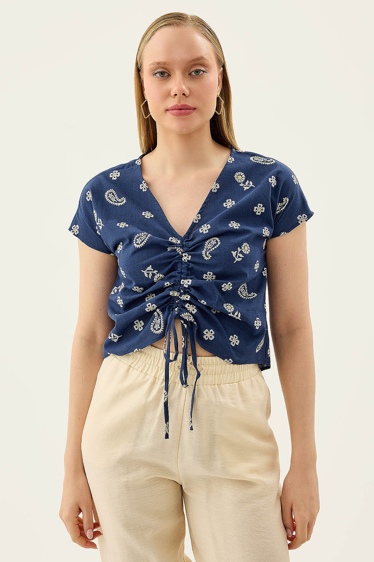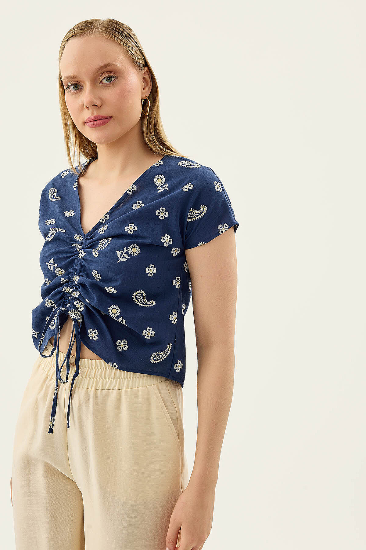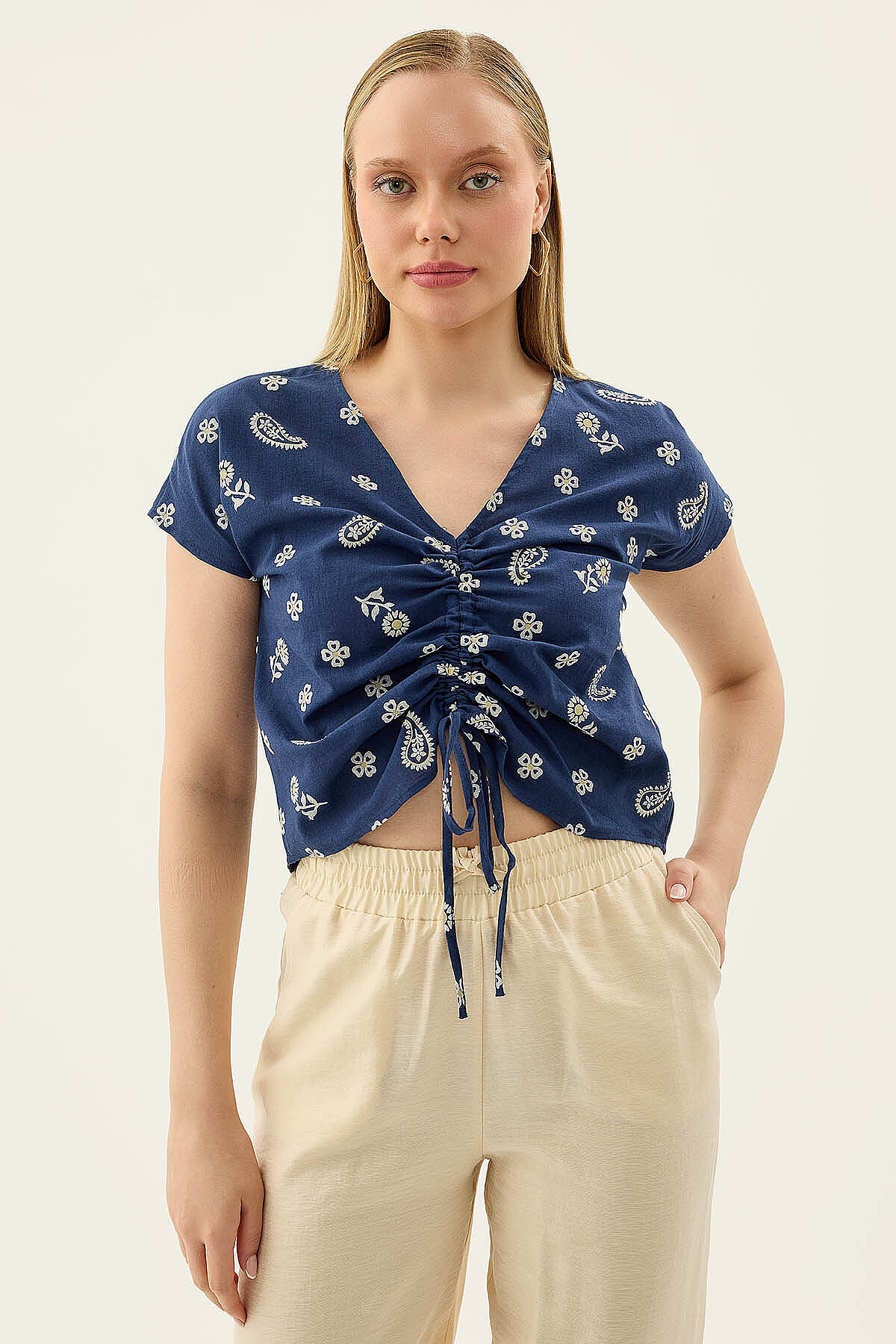 Önü Büzgülü Çiçekli Kısa Kol Bluz Lacivert