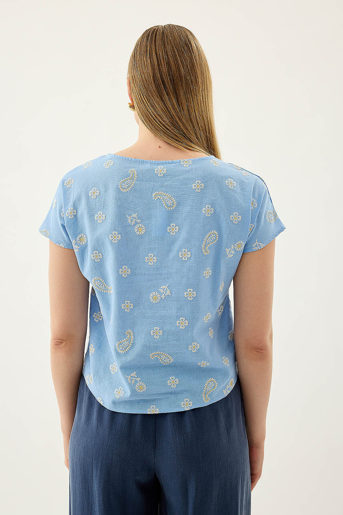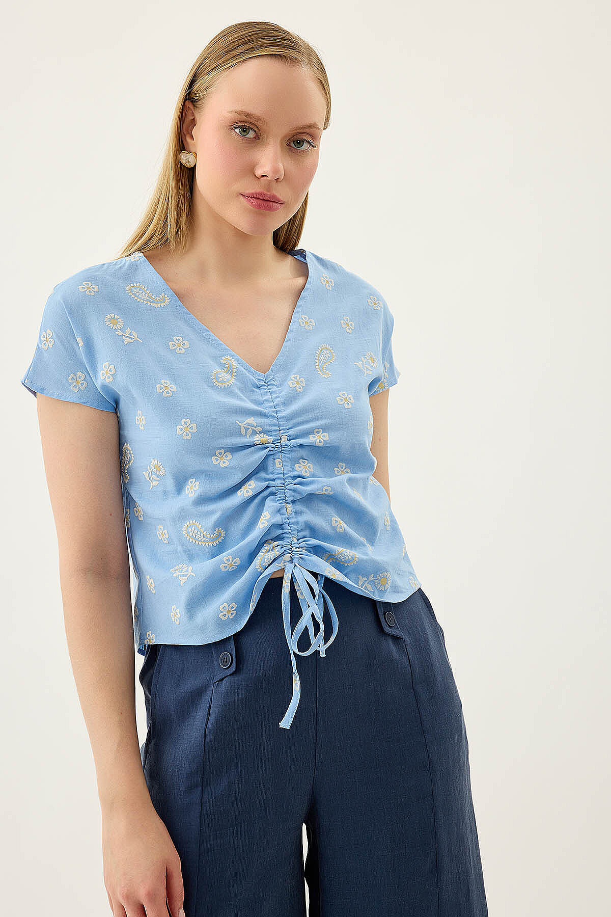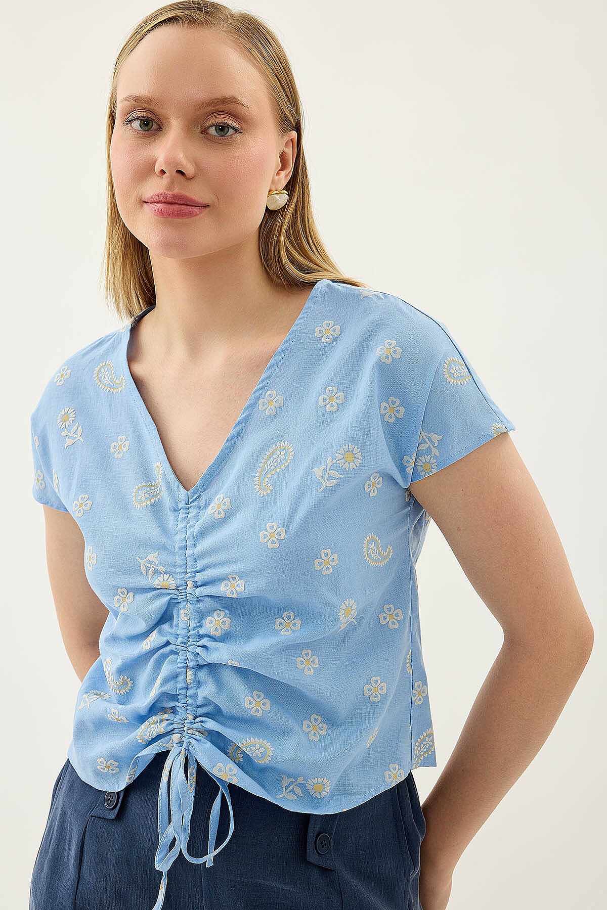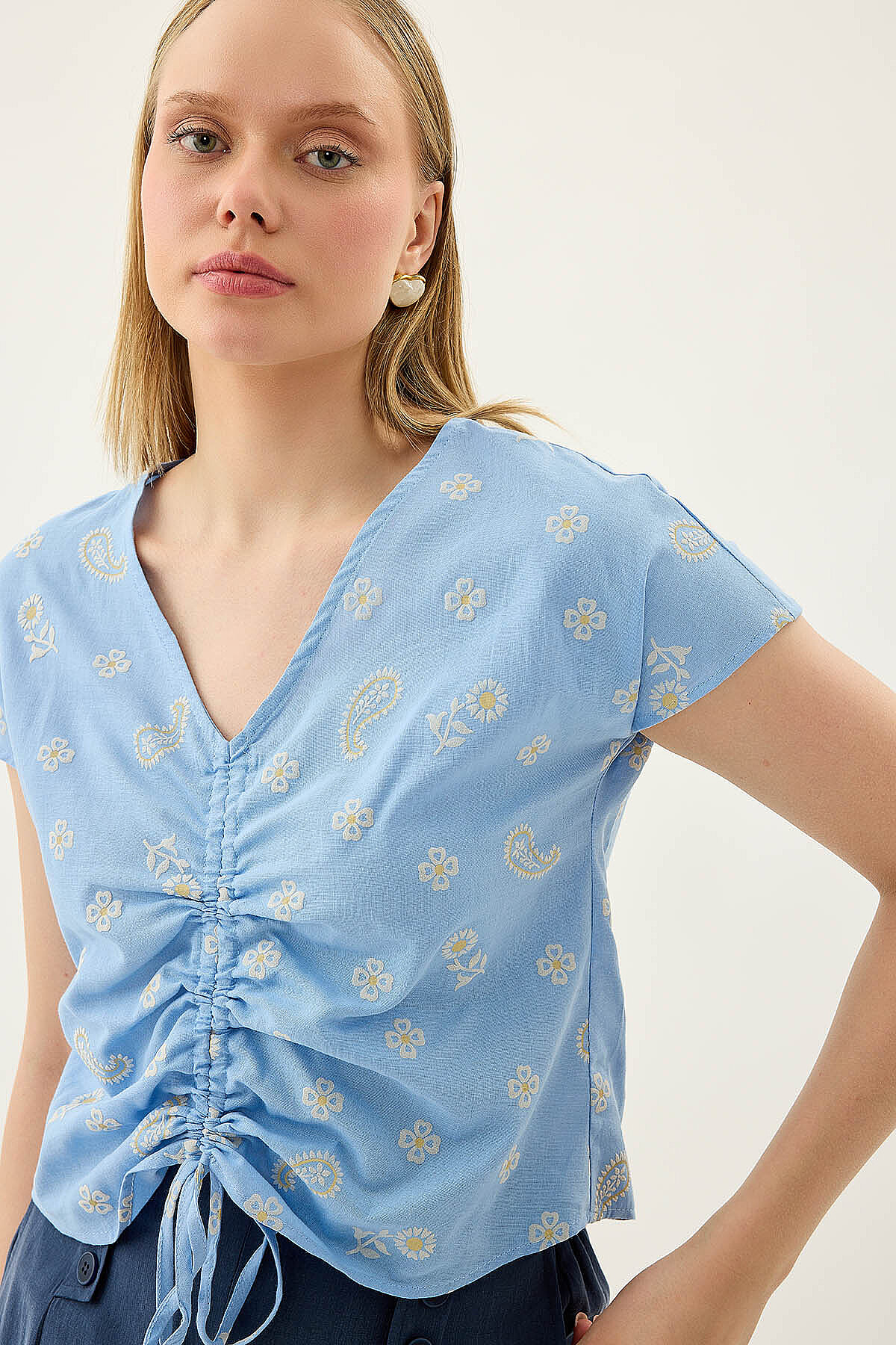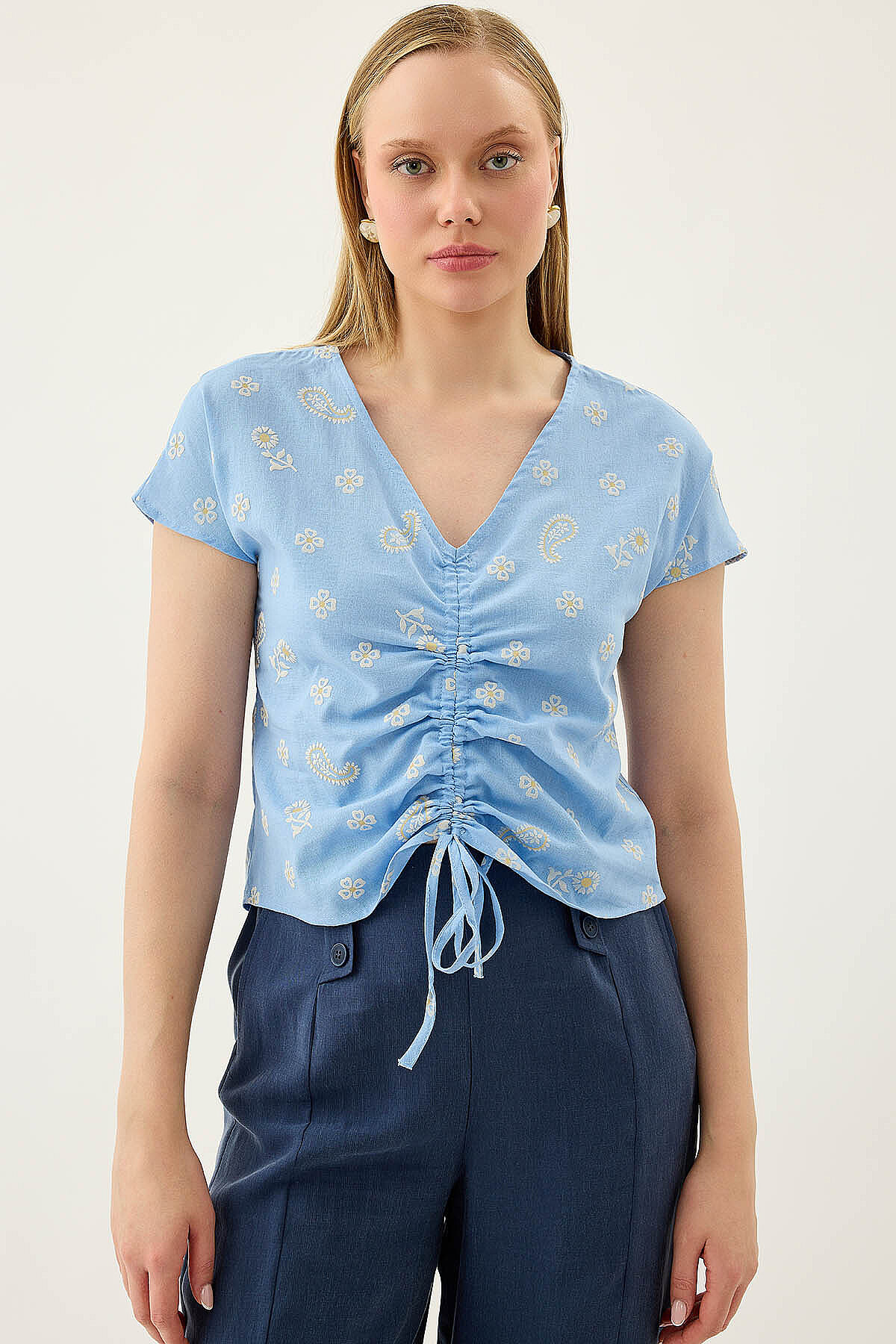 Önü Büzgülü Çiçekli Kısa Kol Bluz Mavi