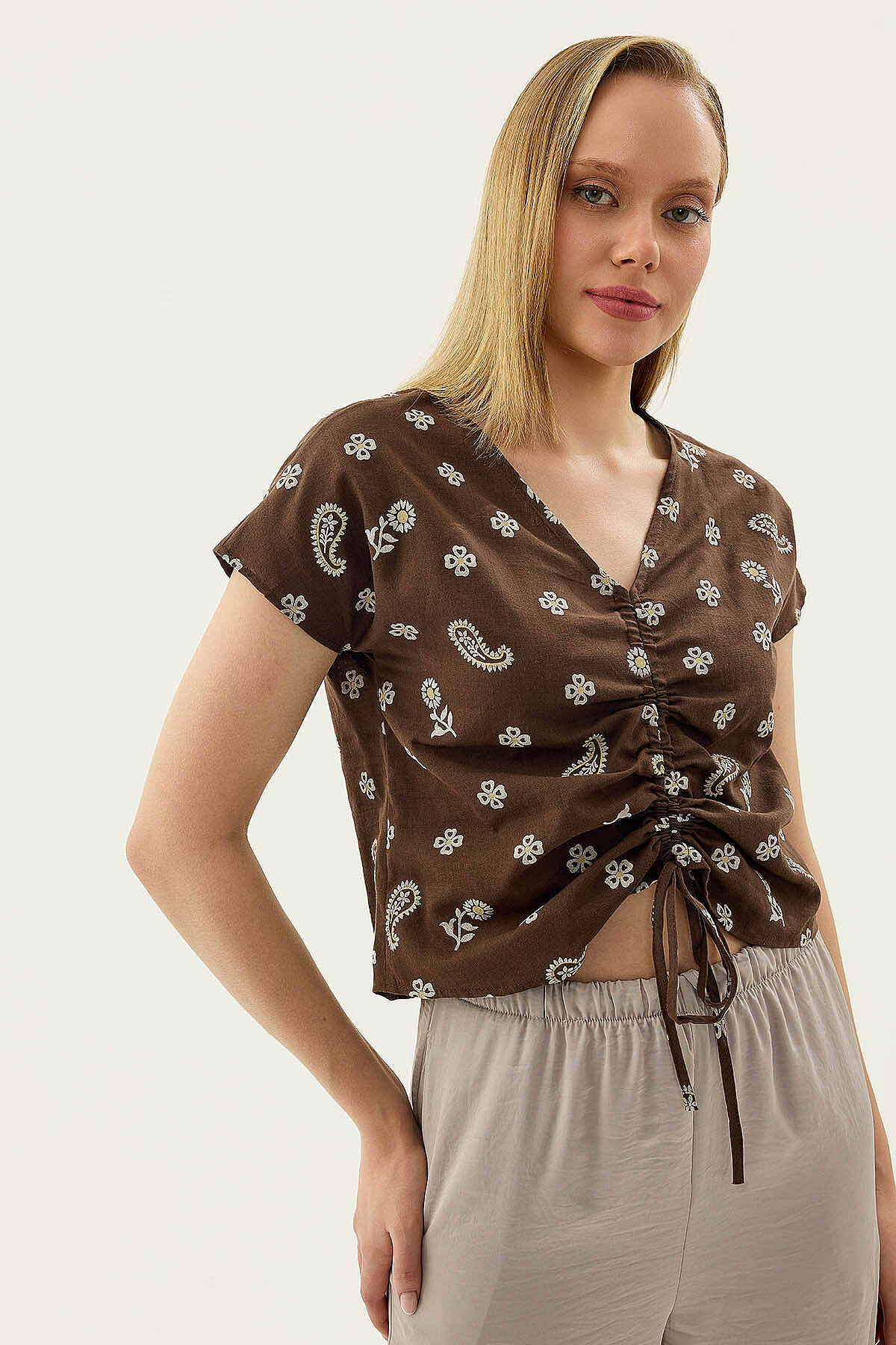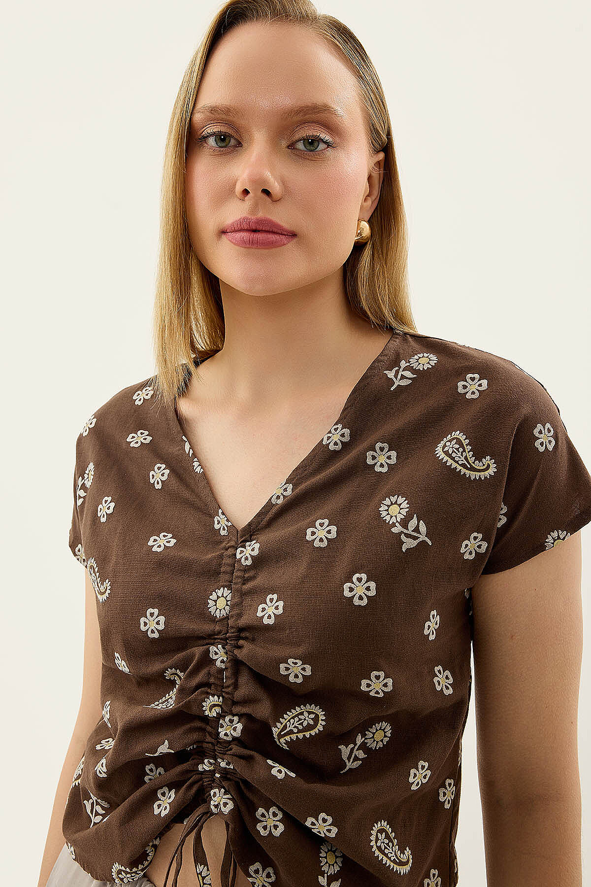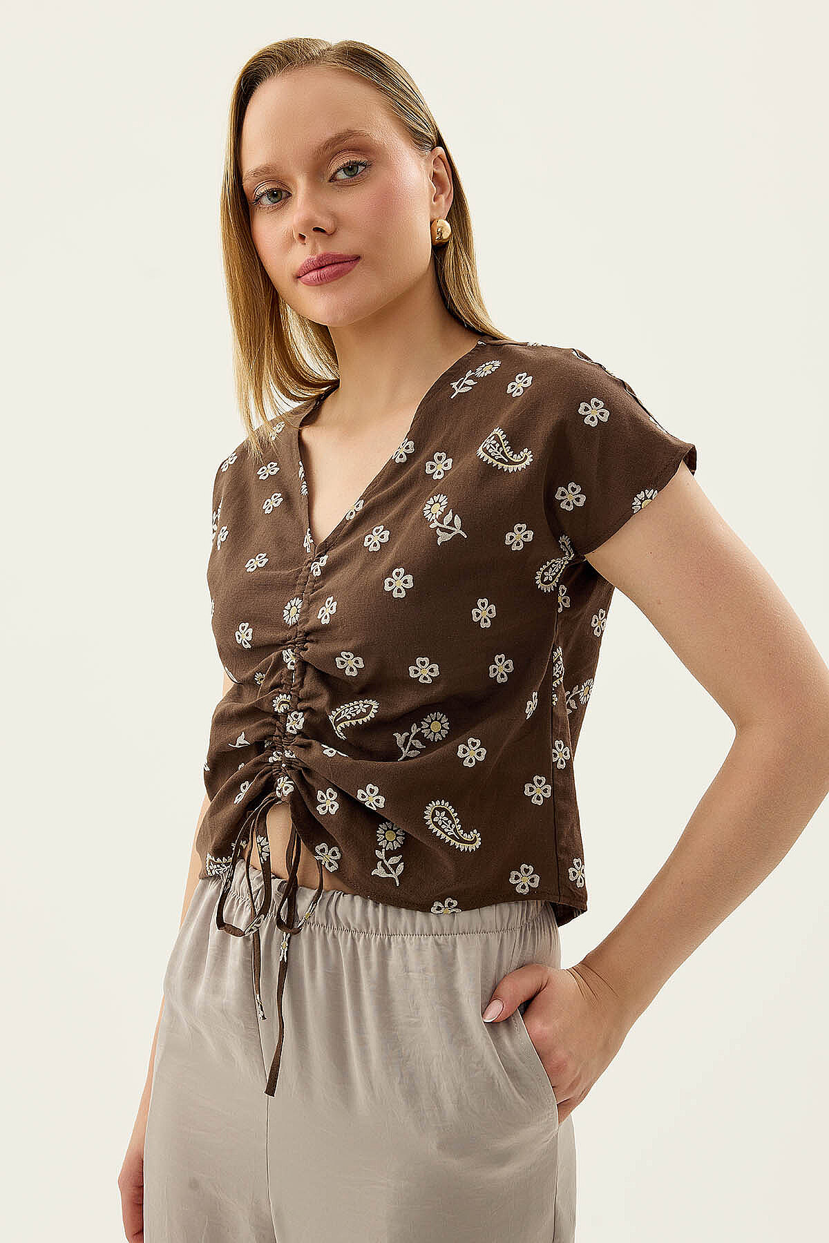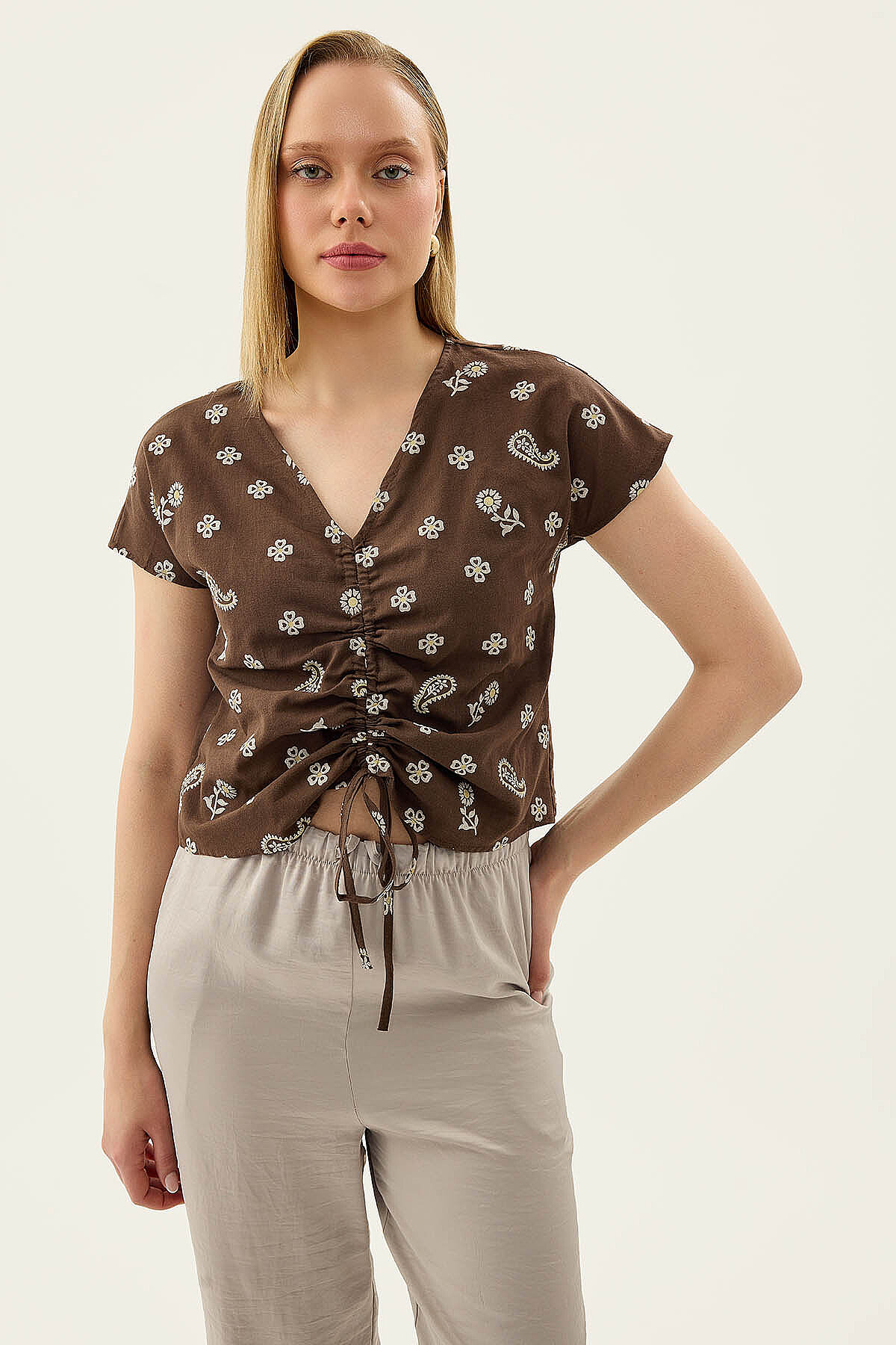 Önü Büzgülü Çiçekli Kısa Kol Bluz Kahve