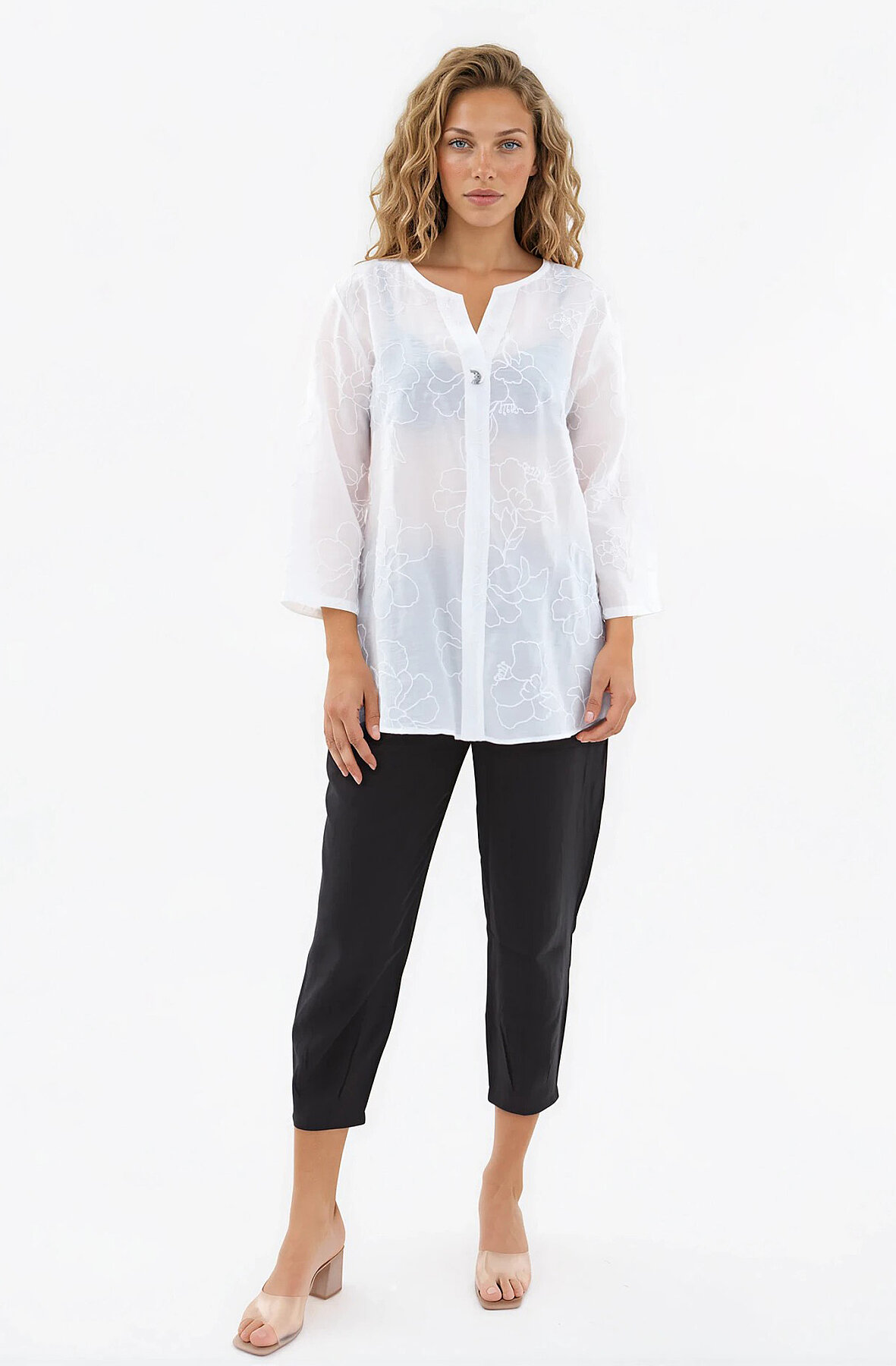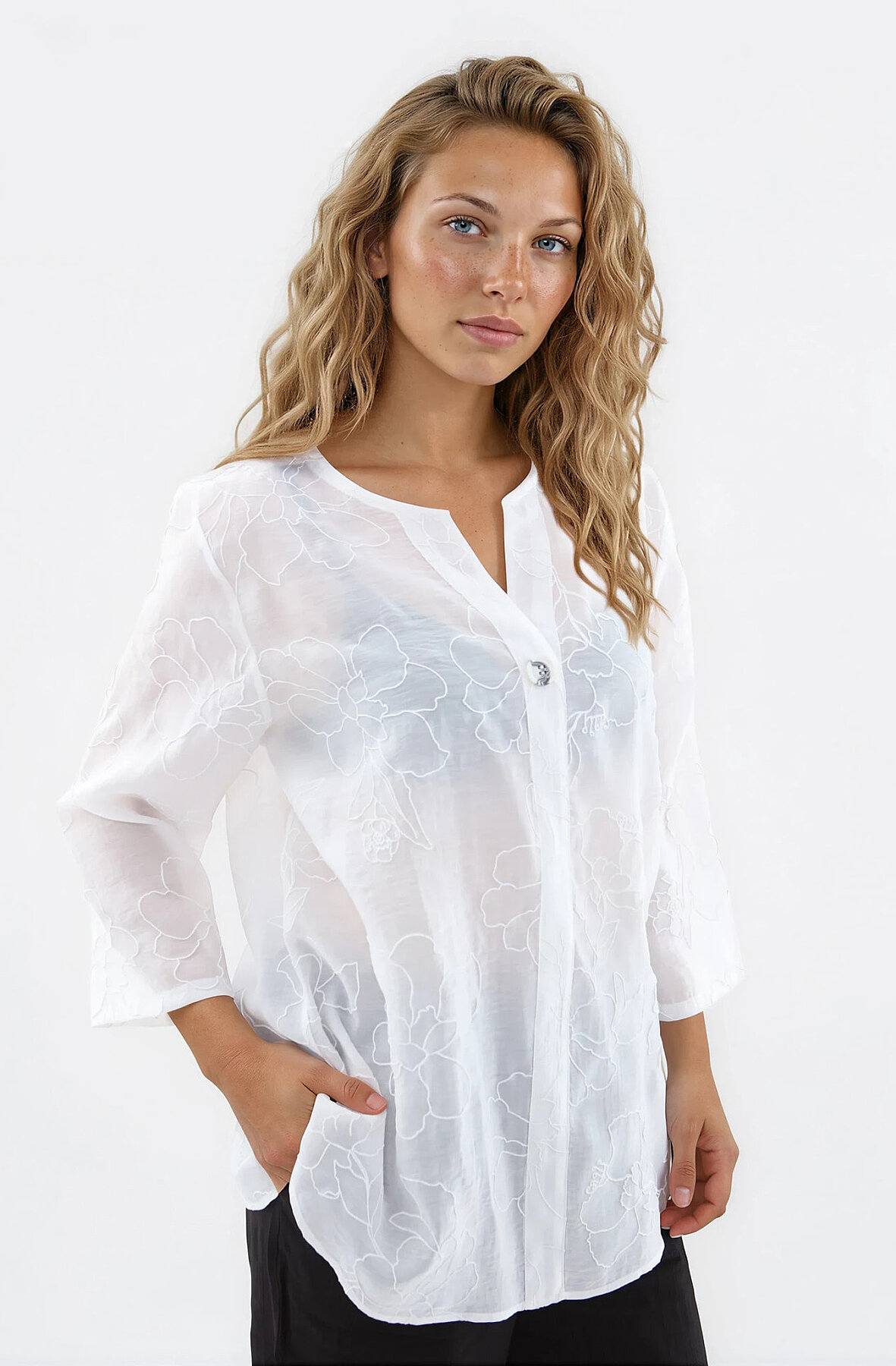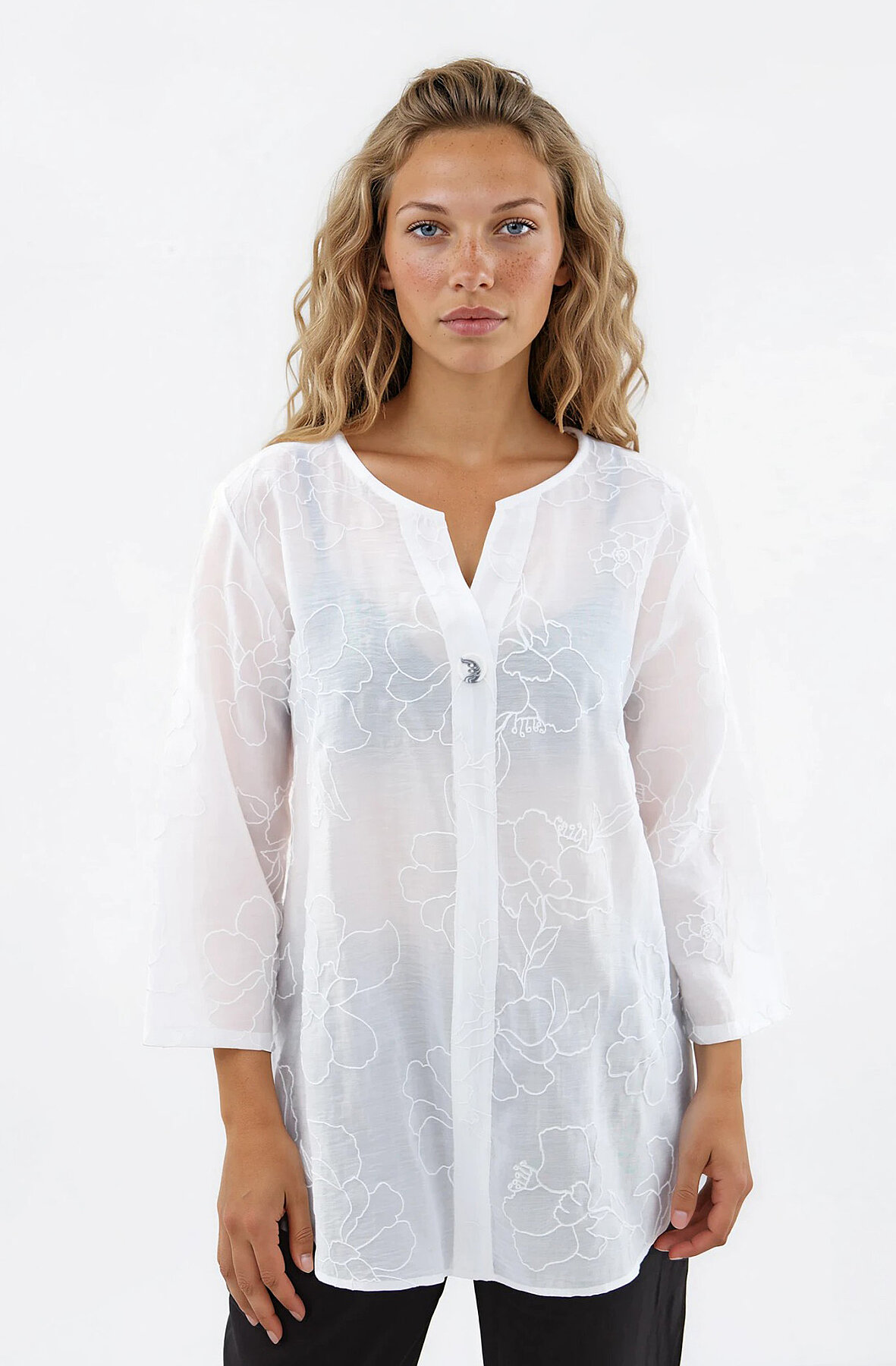Önü Düğmeli Çiçek Desen Bluz Beyaz