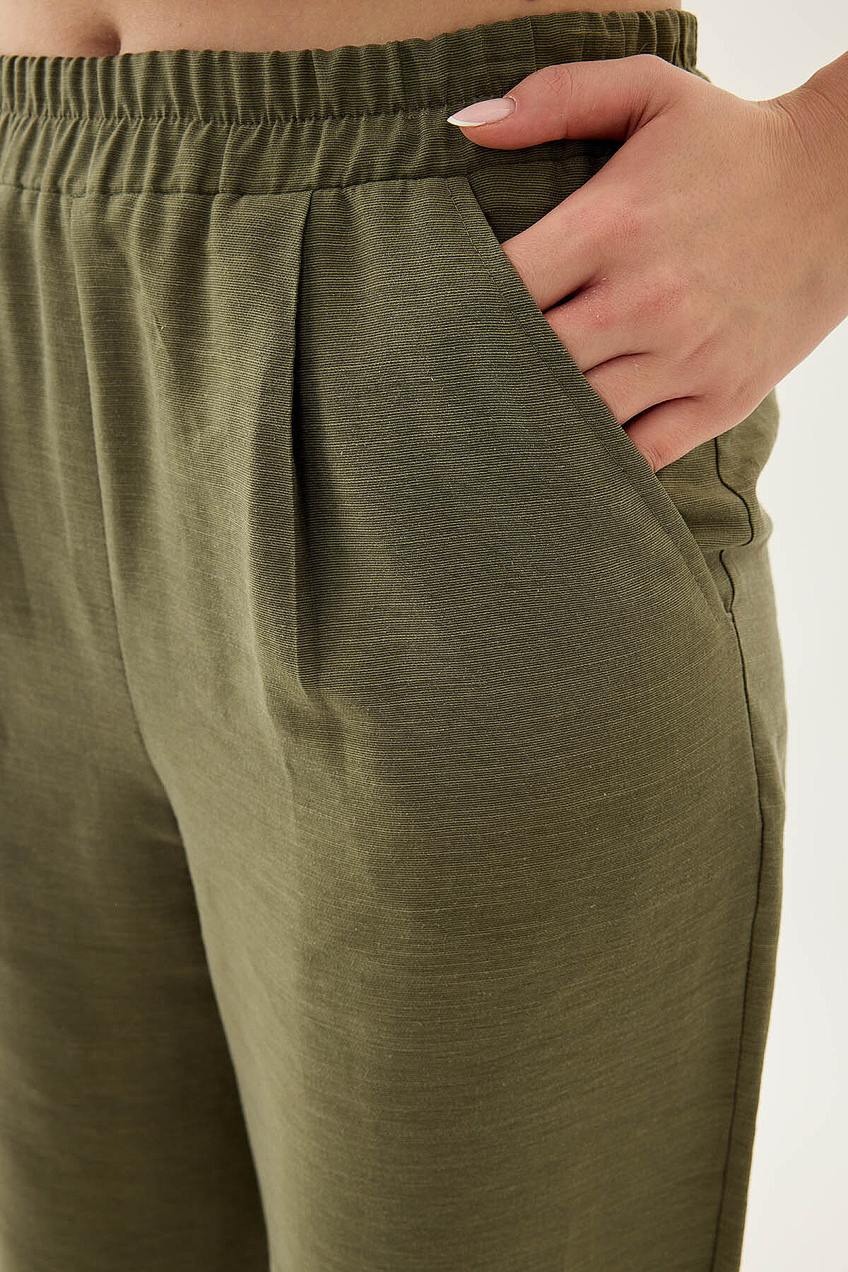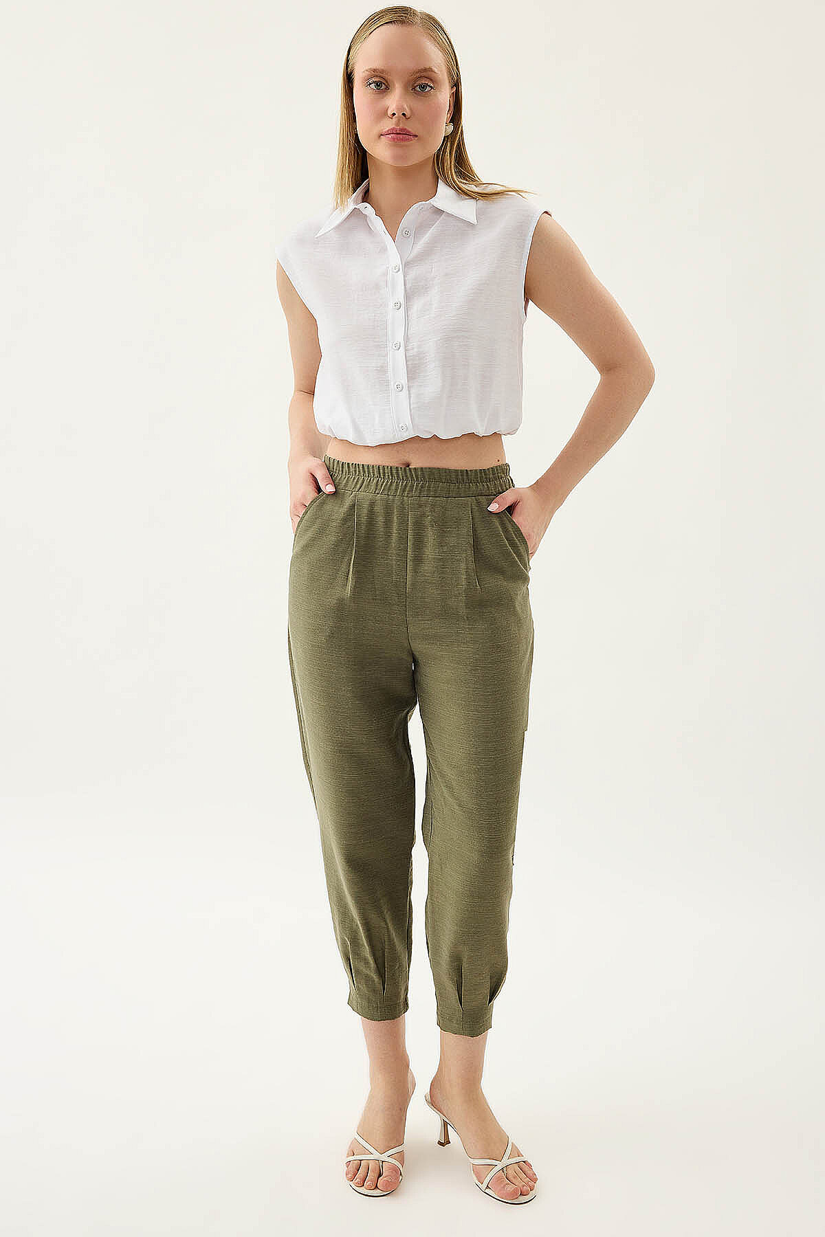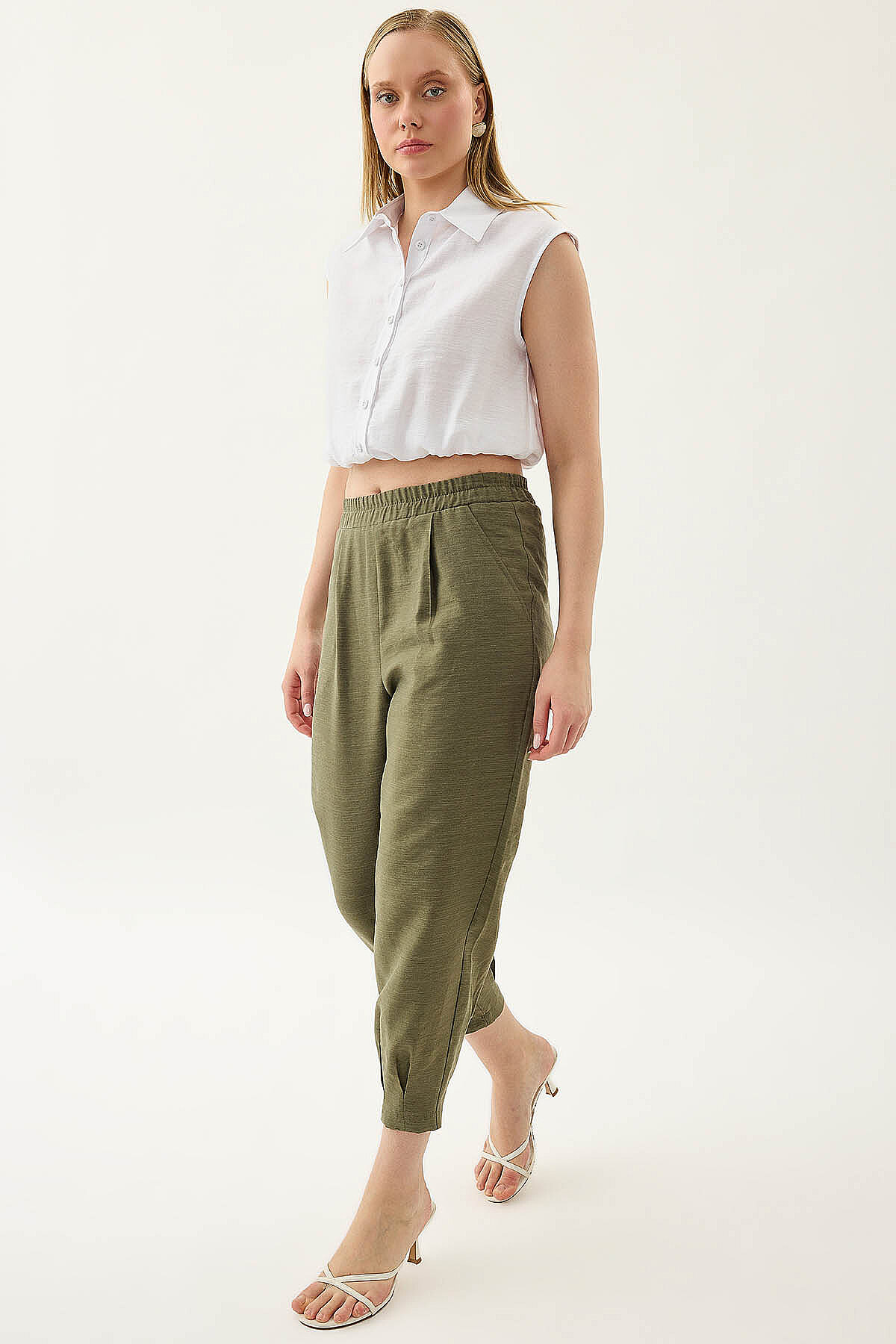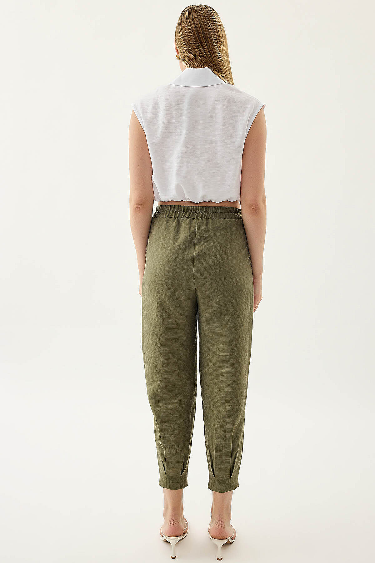 Paçası Pileli Beli Lastikli Pantolon Haki