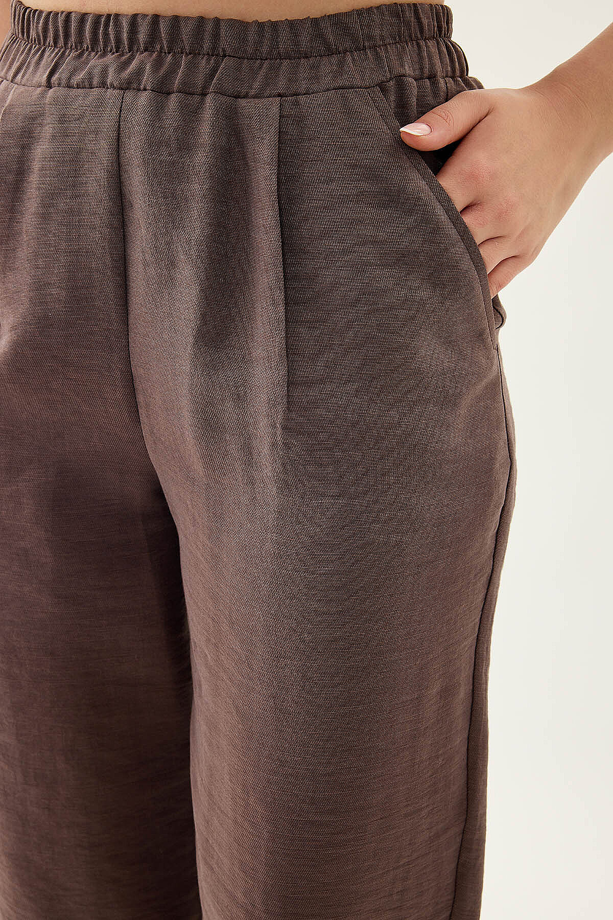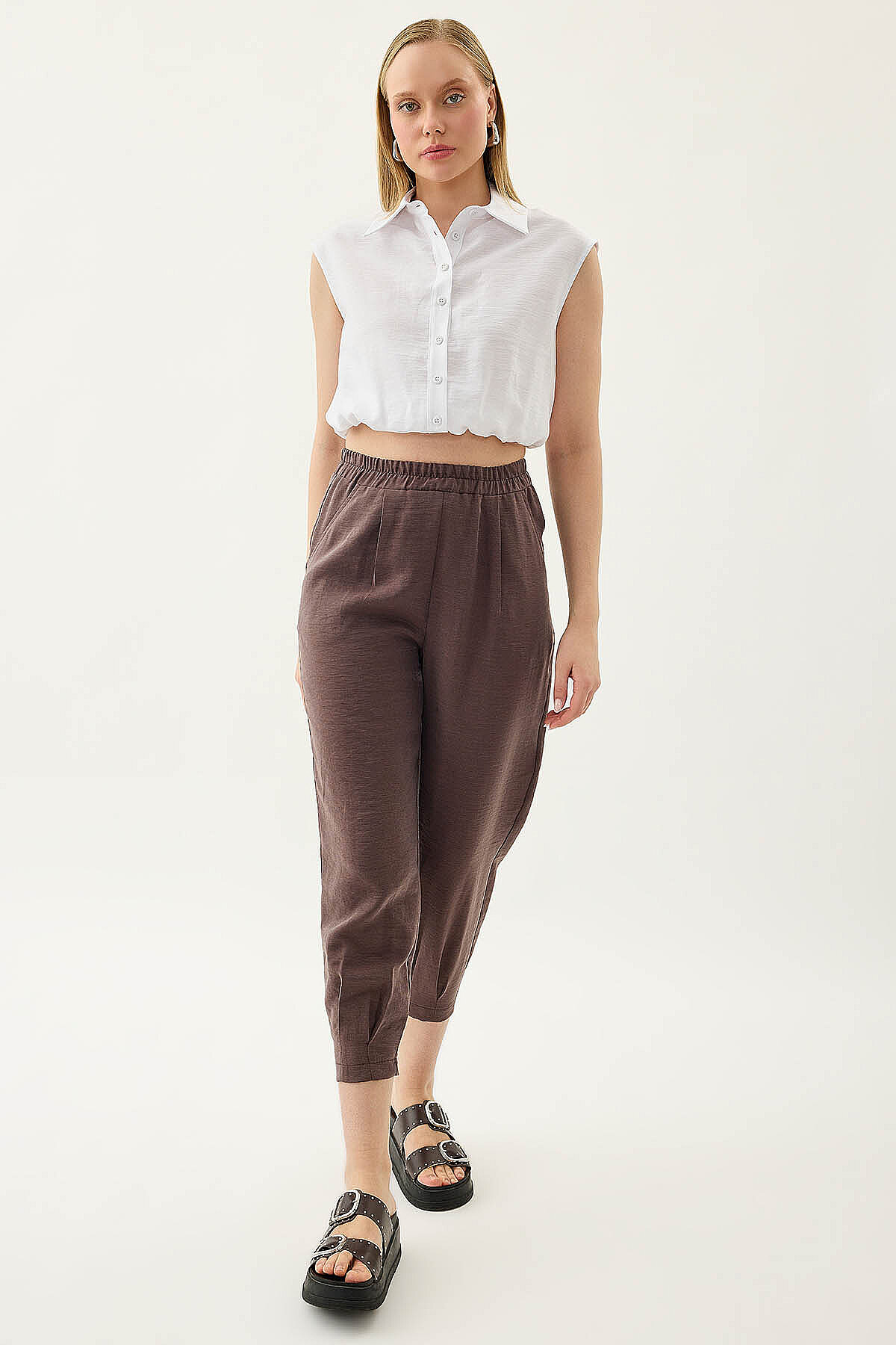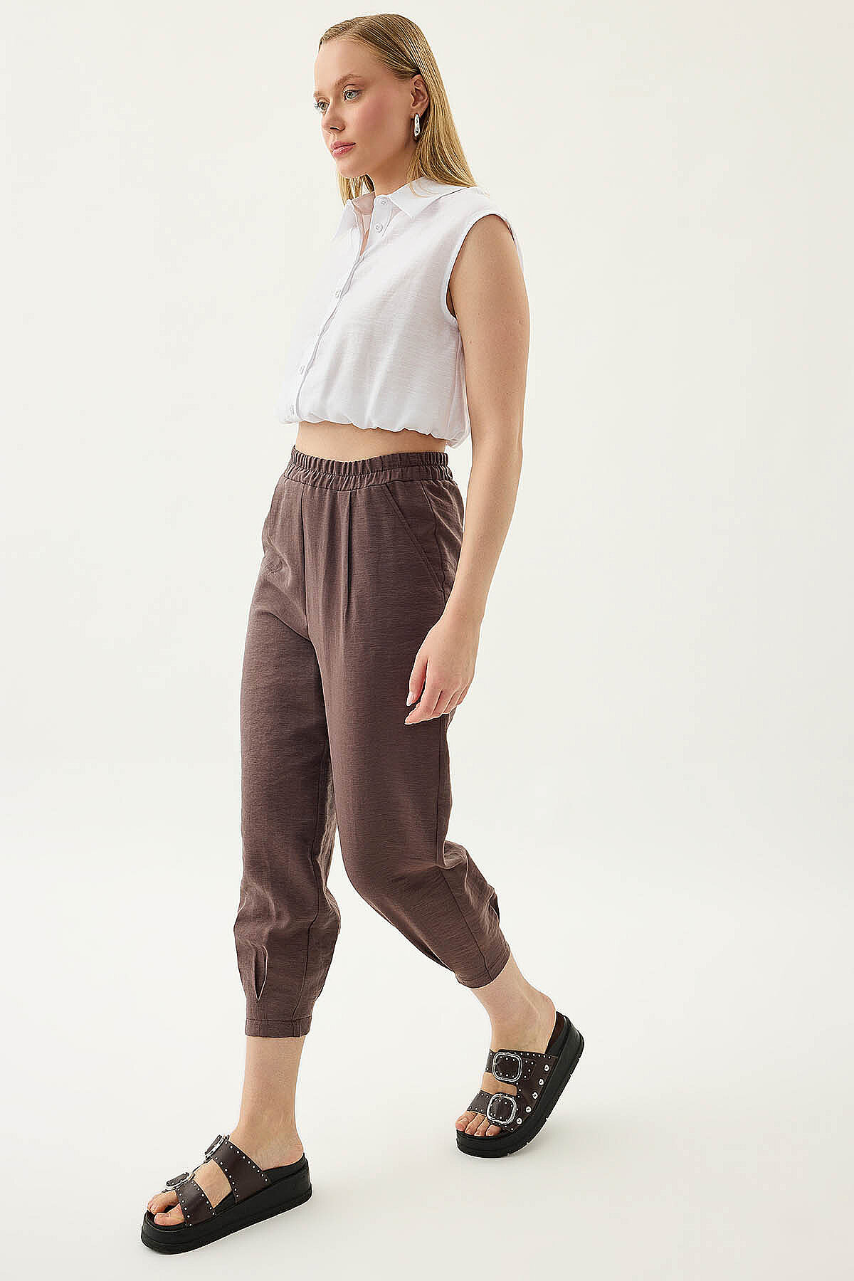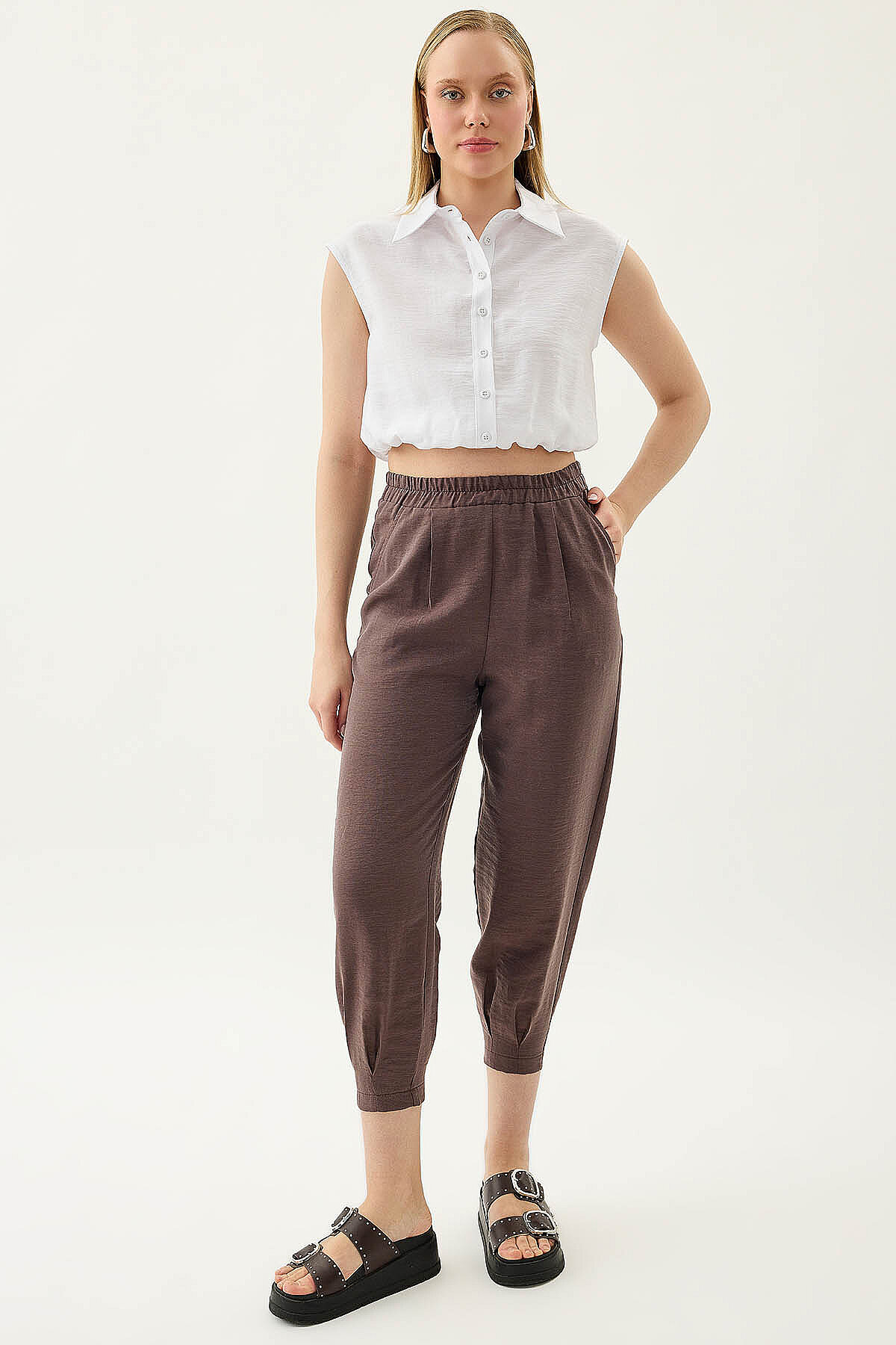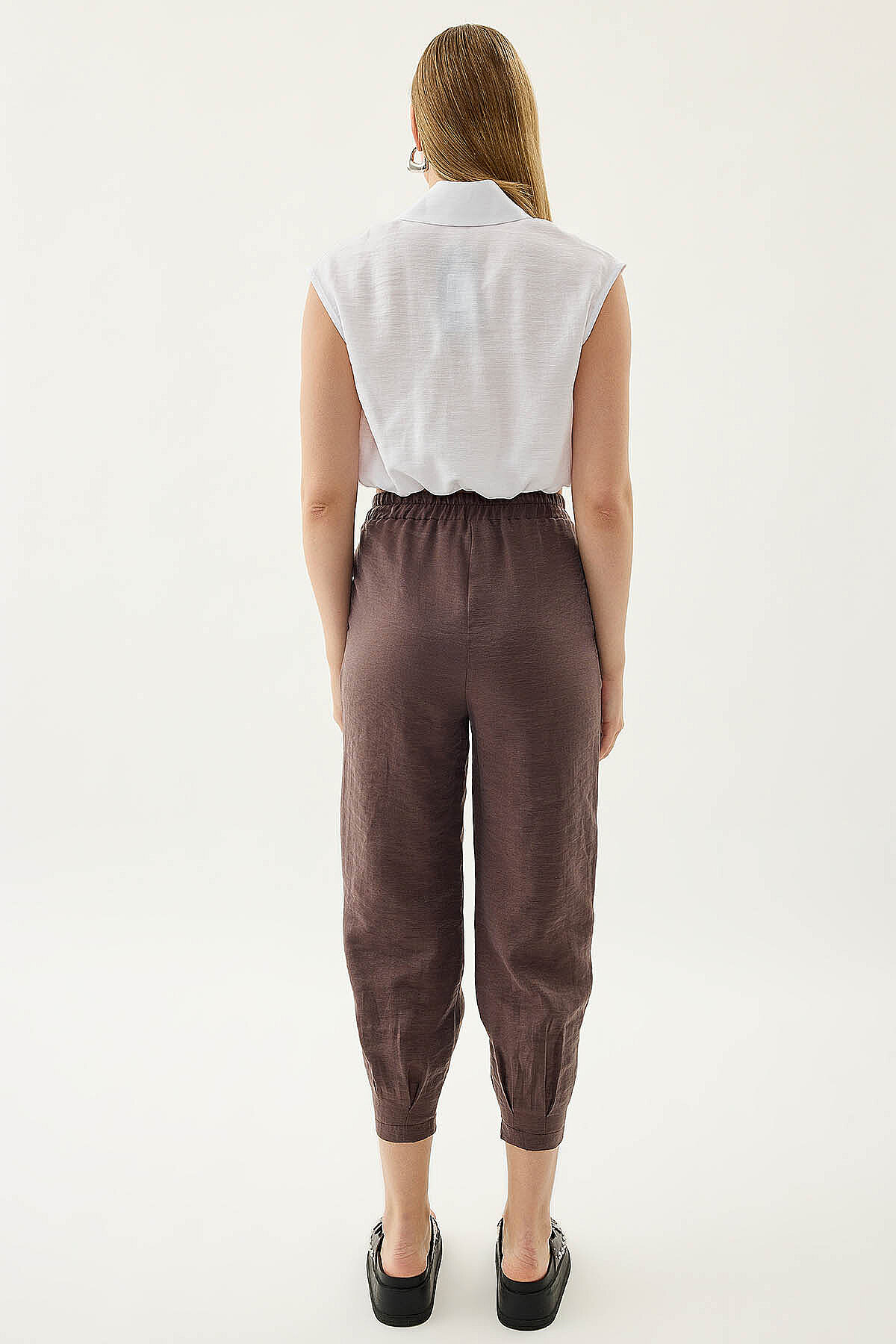 Paçası Pileli Beli Lastikli Pantolon Kahve
